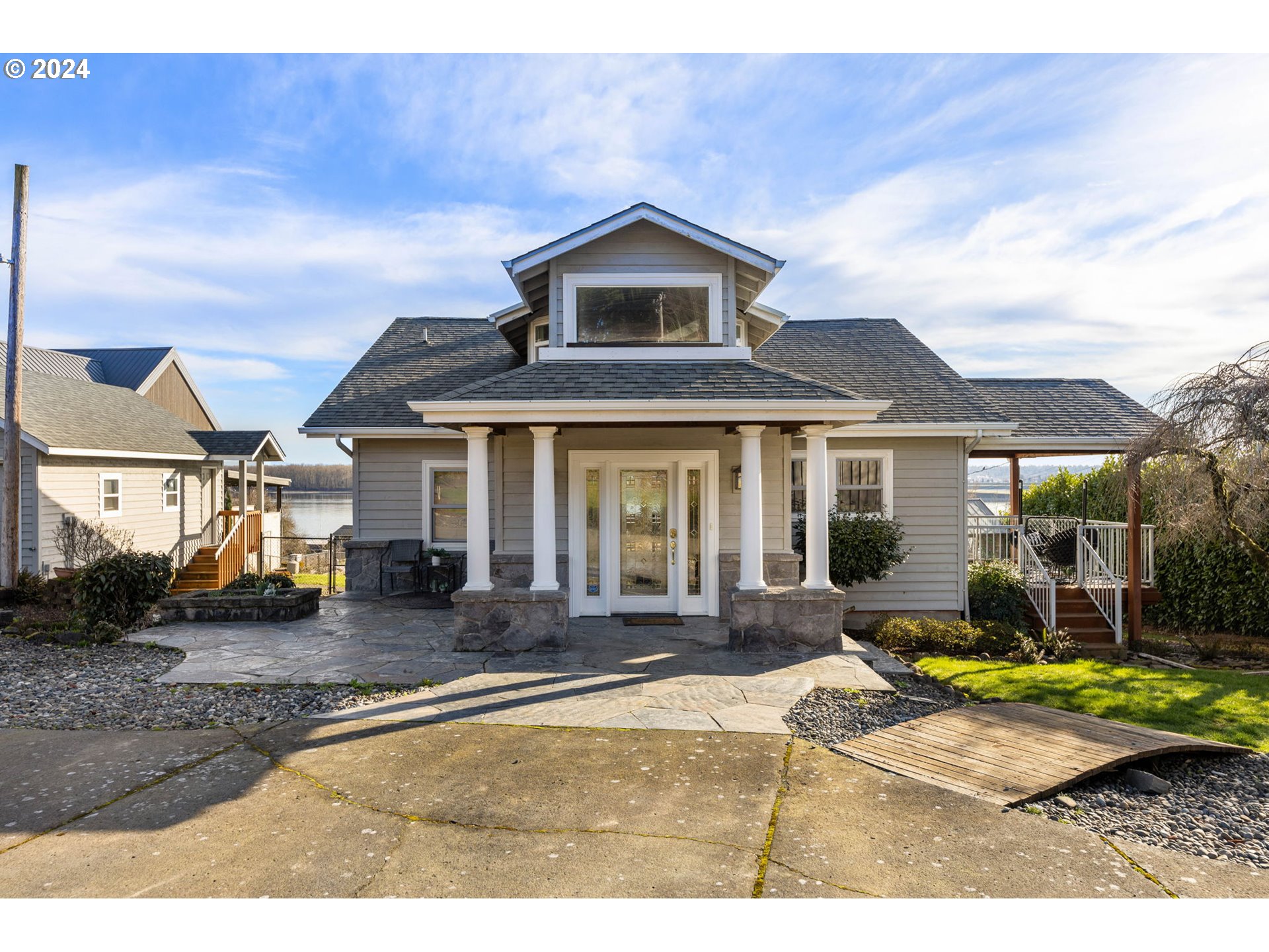 Development potential with Columbia River views. This home sits on a spacious acre lot with full sun exposure and fantastic views of the river. The large lot is primed to be divided into a few lots and developed. The home itself has 1,696 sqft of living space, 2 bedrooms and 2 full baths. The home is being sold as is.