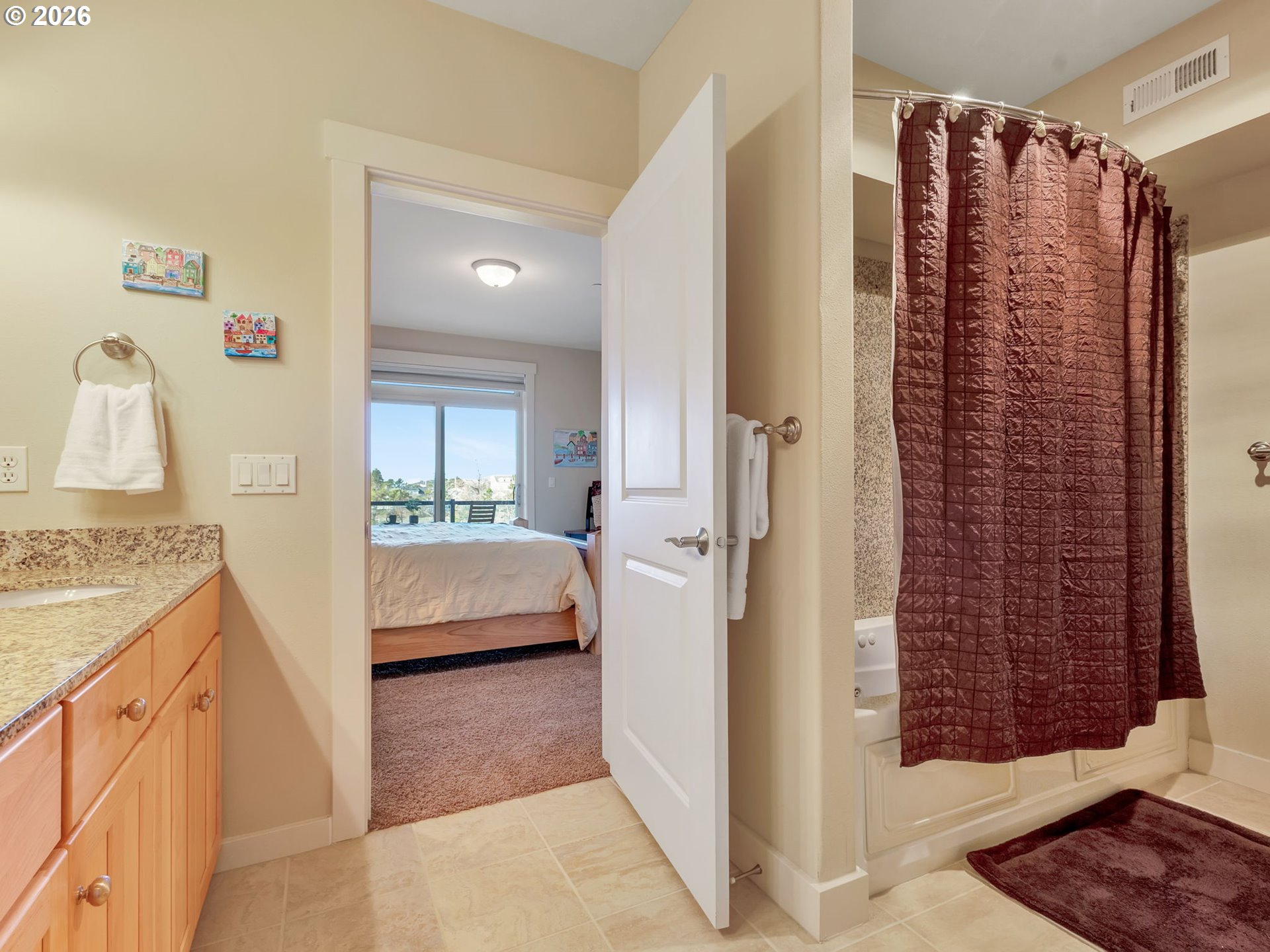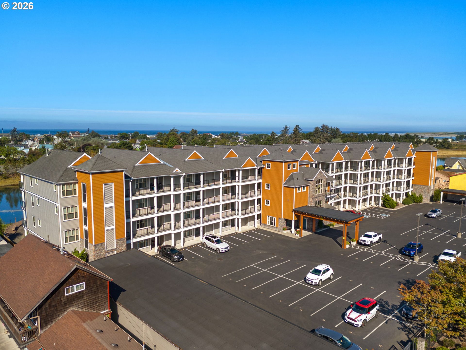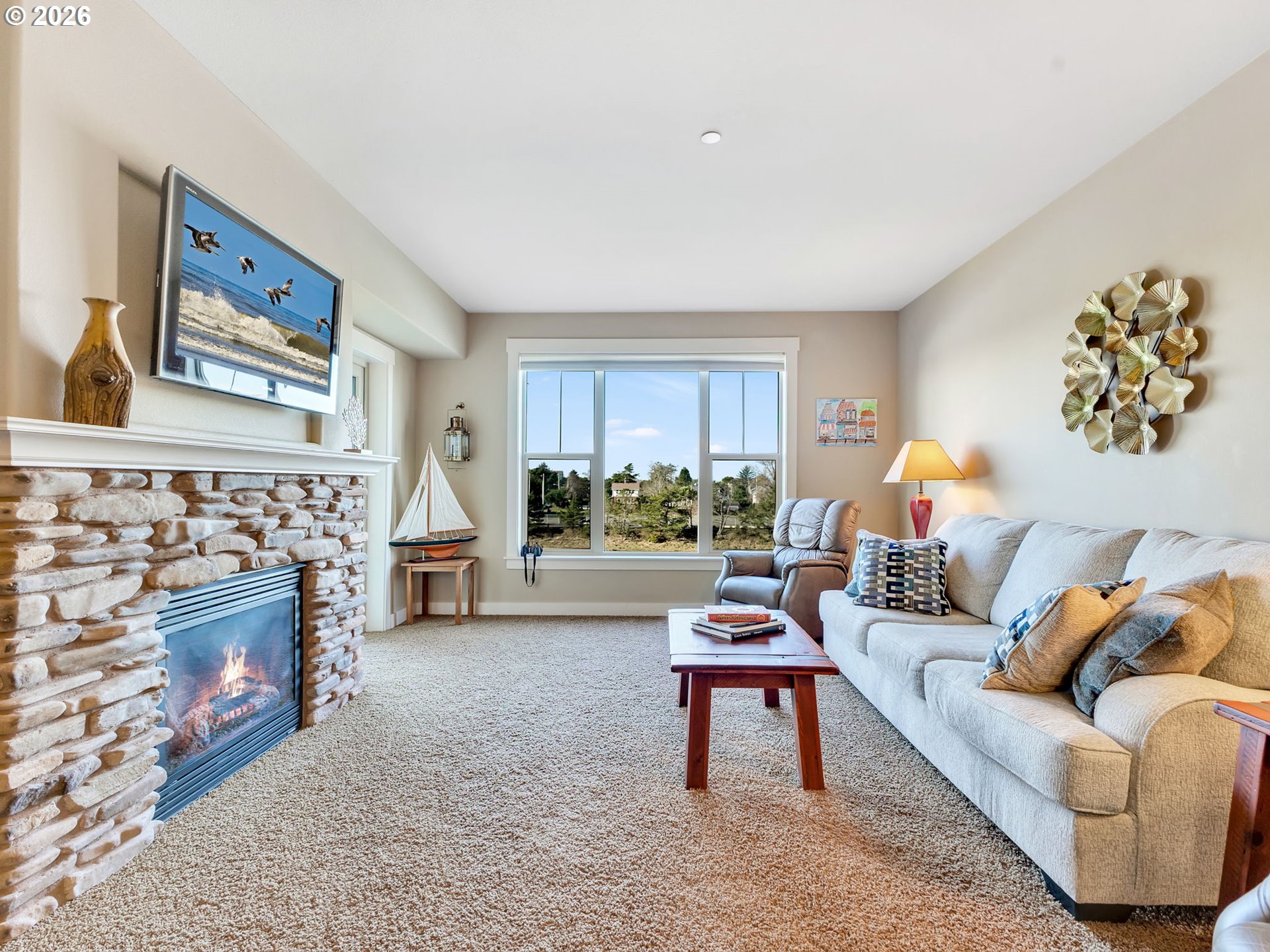 VIEWS, VIEWS, VIEWS. Perched on the 3rd floor, this stylish condo comes furnished, subject to exclusions, and delivers stunning views of the Necanicum River and Tillamook Head and is just a few blocks from downtown Seaside and the Promenade. The open floor plan features a cozy gas fireplace and a stylish kitchen with quartz countertops, under-cabinet lighting, stainless steel appliances, and a raised bar.The primary suite is a true retreat with an oversized walk-in closet, jetted tub, and sliding glass door to a large deck. A guest room with a twin-over-double bunk bed and a second full bath add flexibility. Extras include attached storage, two designated parking spaces, and a well-equipped complex with an elevator, workout room, and community room—plus potential for short-term rental use.