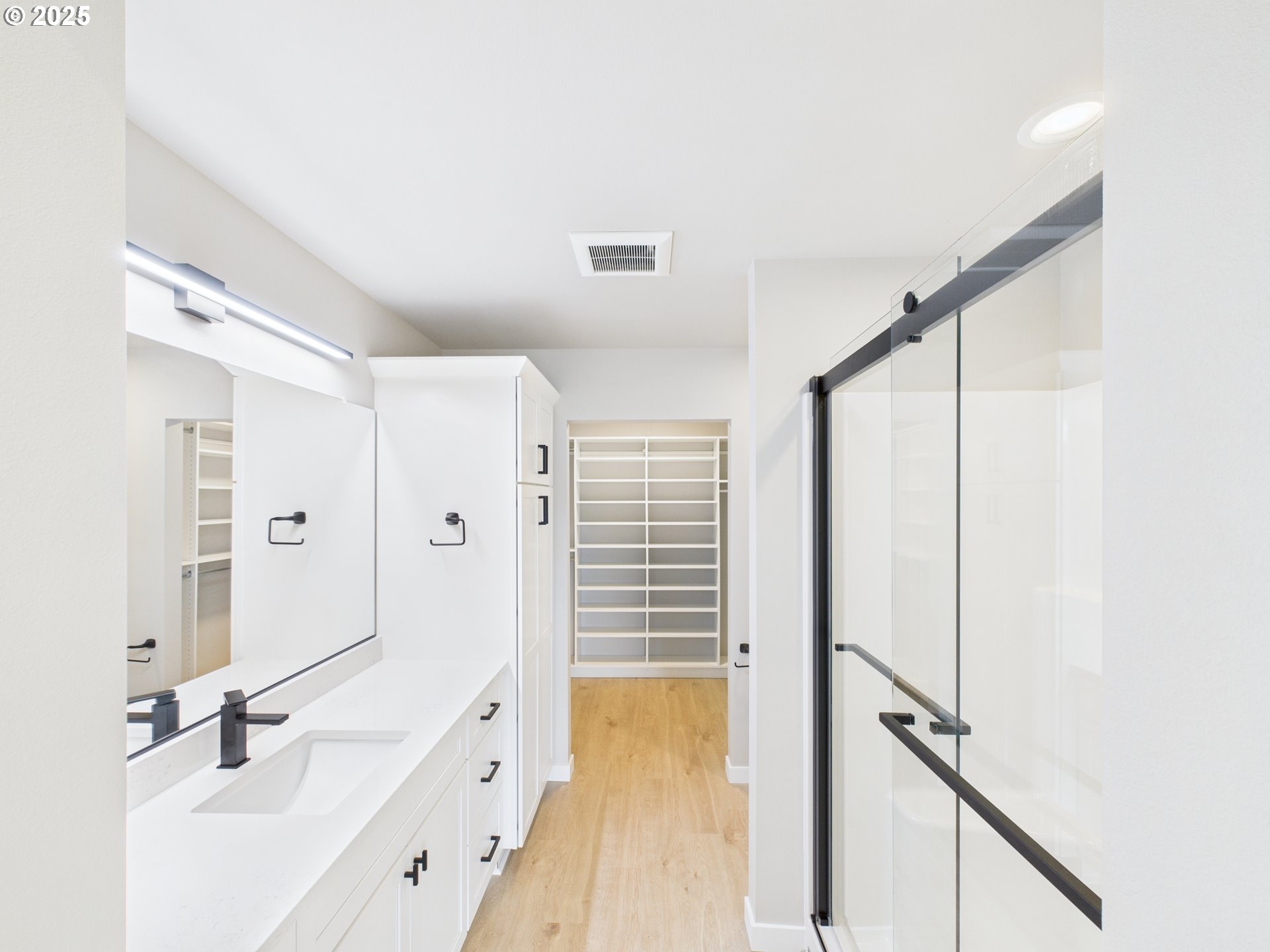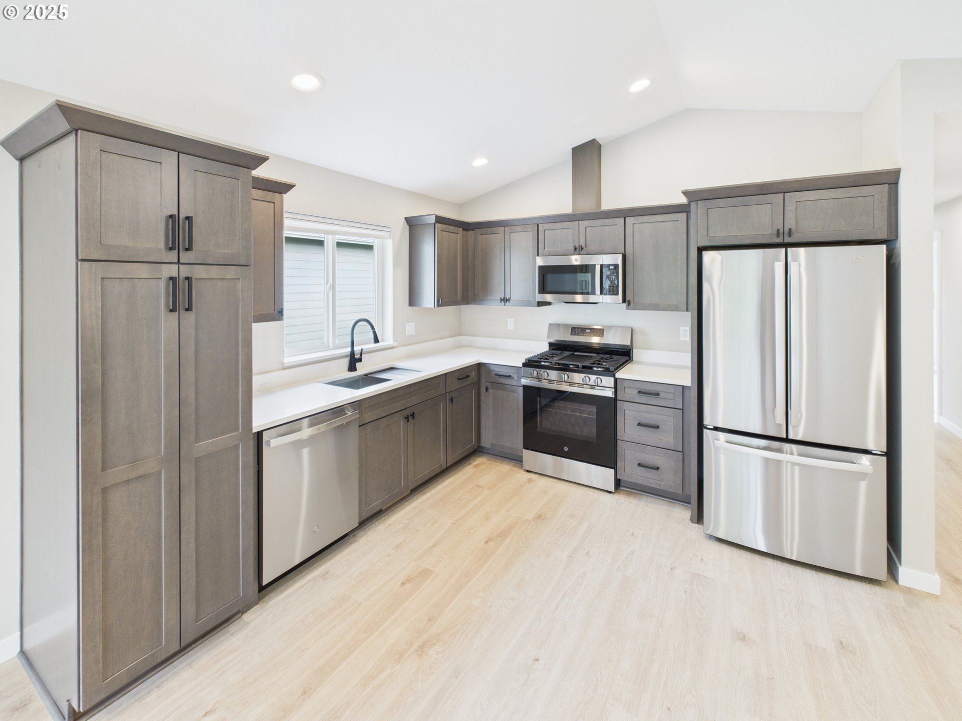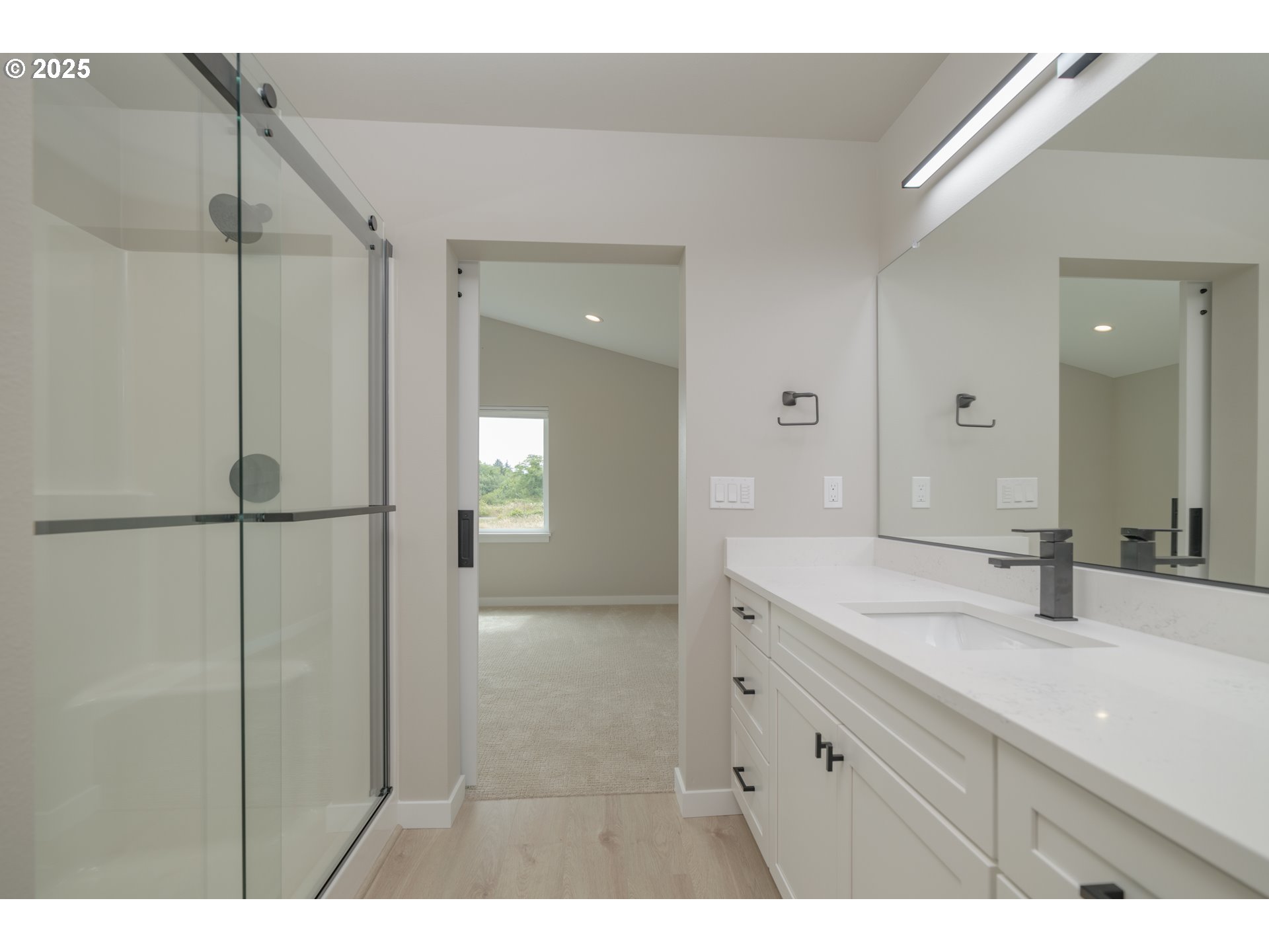 Modern coastal living in Seaside. Built in 2025, this single-level home features a bright, open great room with vaulted ceilings, durable laminate flooring, quartz kitchen counters, stainless steel appliances, and a convenient pantry closet. Board-and-batten siding and a covered front porch add inviting curb appeal and a classic coastal look.The vaulted primary suite sits quietly at the back of the home and includes a barn door into the ensuite bath and a custom built-in walk-in closet for excellent storage. This builder is known for thoughtful extras—including installed shower doors, upgraded finishes, and an automatic garage door opener already in place—offering comfort and ease that stand out in newer construction. Two additional bedrooms provide flexible space for guests, work, or hobbies.The yard has been freshly seeded, giving you a clean, ready-to-grow canvas for future outdoor living. The attached garage adds practical storage and easy parking.Located in a quiet Seaside neighborhood close to beaches, parks, schools, and shopping, this home combines the benefits of new construction with low-maintenance coastal living.Highlights: vaulted great room and vaulted primary bedroom, durable laminate flooring, quartz counters, stainless appliances, pantry closet, covered front porch, board-and-batten siding, barn-door ensuite, custom built-in closet system, installed shower doors, automatic garage door opener, newer 2025 construction, attached garage, freshly seeded yard.