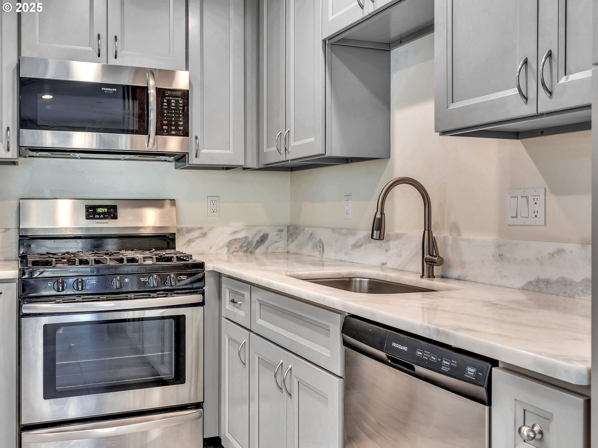 Dishwasher, FreeStandingGasRange, FreeStandingRefrigerator, Island, Microwave, Quartz, StainlessSteelAppli