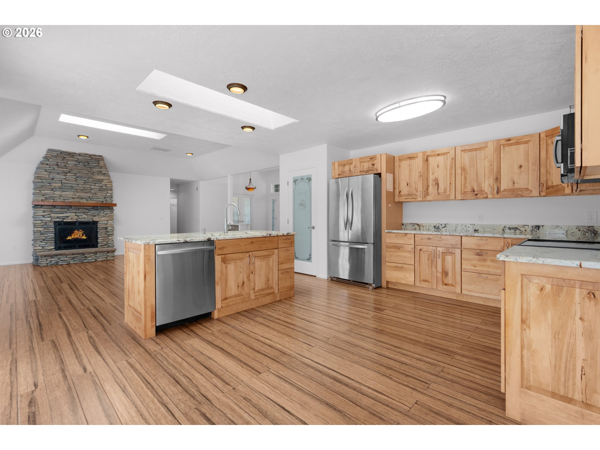 Welcome to this beautifully maintained single-level home offering 1,863 square feet of comfortable living with an open and inviting floor plan. Vaulted ceilings and skylights fill the home with natural light, creating a bright and airy atmosphere throughout. The spacious kitchen features stainless steel appliances, granite counter tops, a pantry, and a convenient cooking island, perfect for entertaining and everyday living. Durable LVP flooring runs throughout the home for a clean, modern feel.This home offers three bedrooms and two full baths, including a well-designed layout that maximizes both privacy and functionality. The cozy cultured stone gas fireplace provides a warm focal point in the living area, while sliding doors lead to a large backyard complete with patio and deck—ideal for outdoor gatherings, relaxation, or gardening. A good-sized shed adds additional storage, and the attached two-car garage offers convenience and practicality.Centrally located in Seaside, this property is close to the middle school, high school, and Providence Hospital, while also positioned between Cannon Beach and Astoria. Enjoy easy access to shopping, dining, and big box stores in Warrenton. This well-appointed single-level home combines comfort, location, and livability—an opportunity you won’t want to miss.