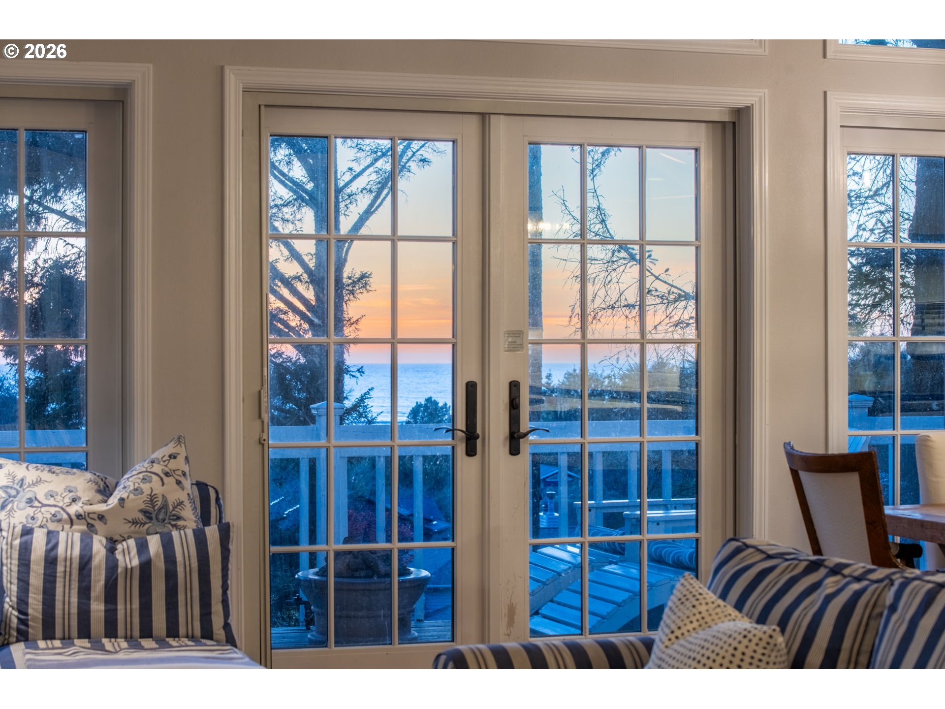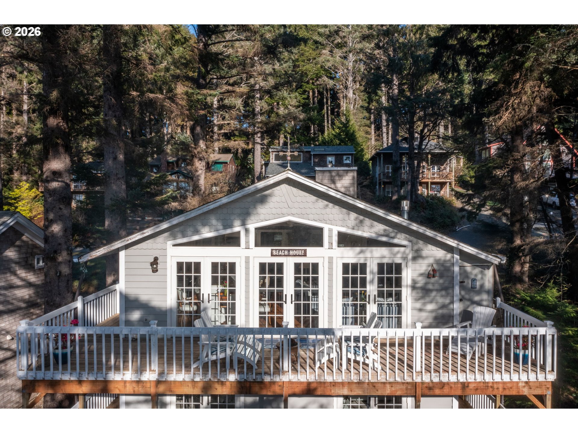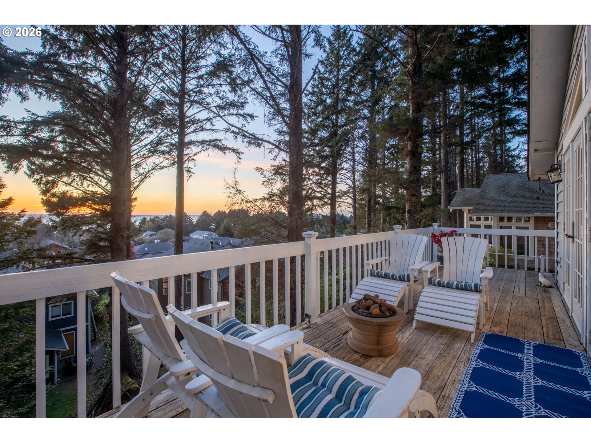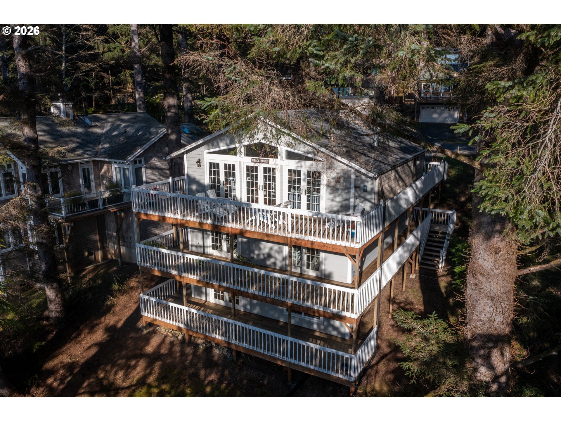 Fully furnished & thoughtfully curated, coastal retreat, blending East Coast elegance with Oregon Coast serenity in Tolovana Beach. Inspired by 'Something's Gotta Give', this 3 level home features vaulted ceilings & expansive west facing windows with distant ocean views. The great room offers a dramatic stone fireplace, custom built-ins, and triple French doors opening to a spacious deck. Gourmet kitchen with industrial gas range, griddle, grill, double ovens, wine cooler, Carrara marble, & custom cabinetry. Luxurious primary suite with fireplace, sitting area, private deck, steam shower, & soaking tub. Three additional bedrooms are thoughtfully designed with custom finishes. Multiple living spaces provide flexibility, including a lower-level game room. Located on a dead-end street, surrounded by forest, the home is approximately half a mile from beach access, minutes to downtown Cannon Beach & Ecola State Park, this property combines privacy, proximity, and lifestyle appeal. Contact your broker to schedule a private showing or to receive the full feature sheet.