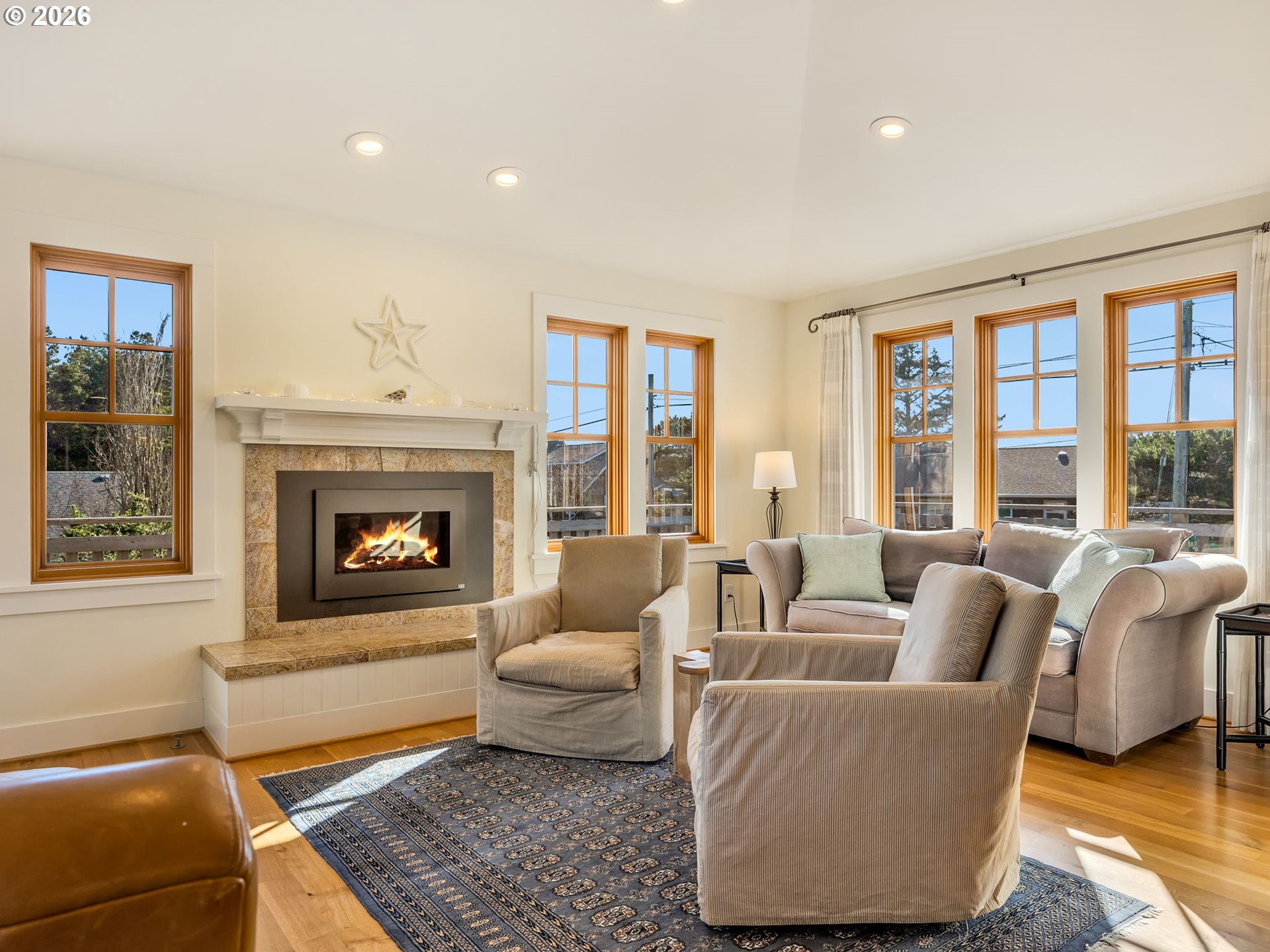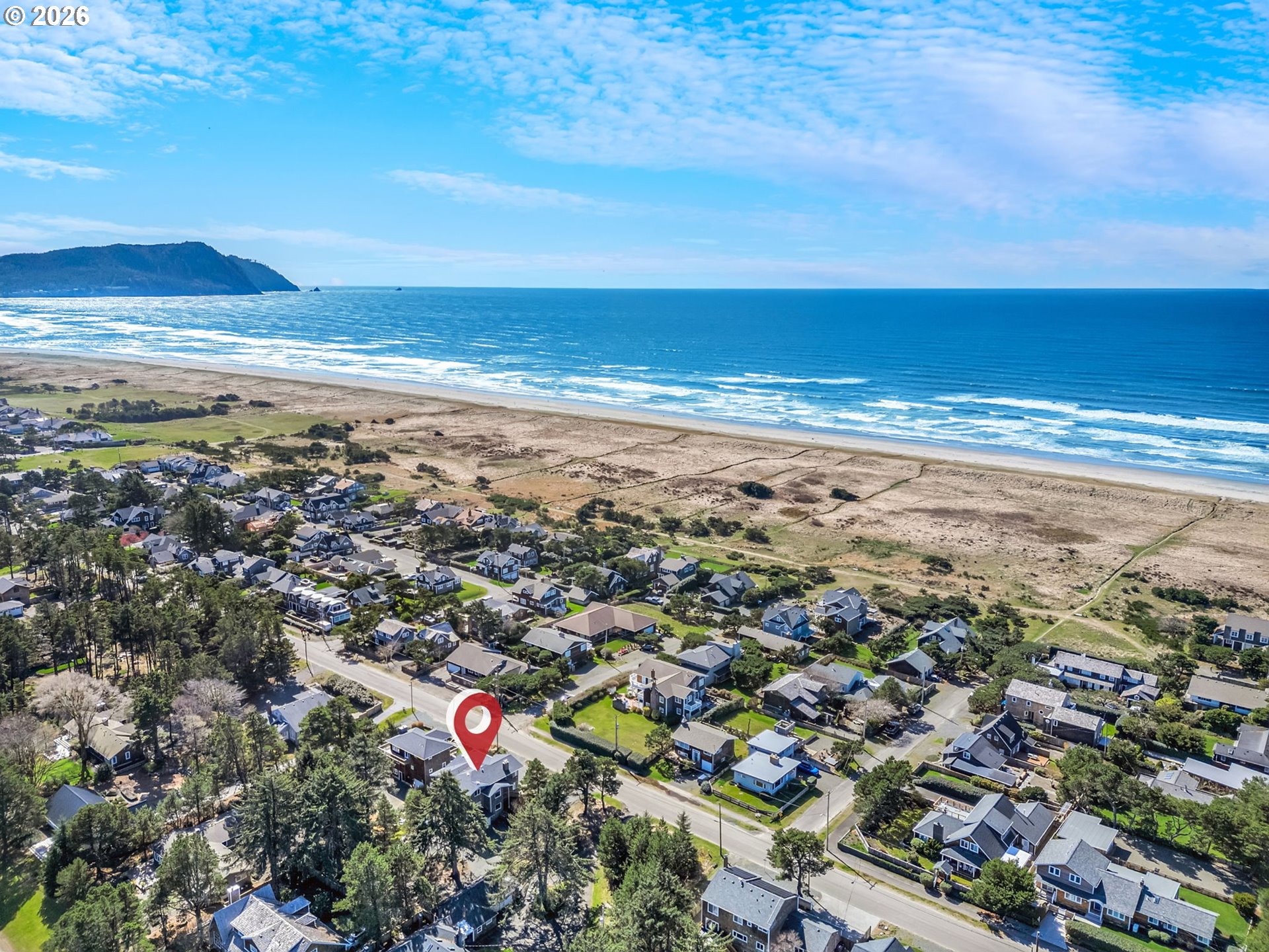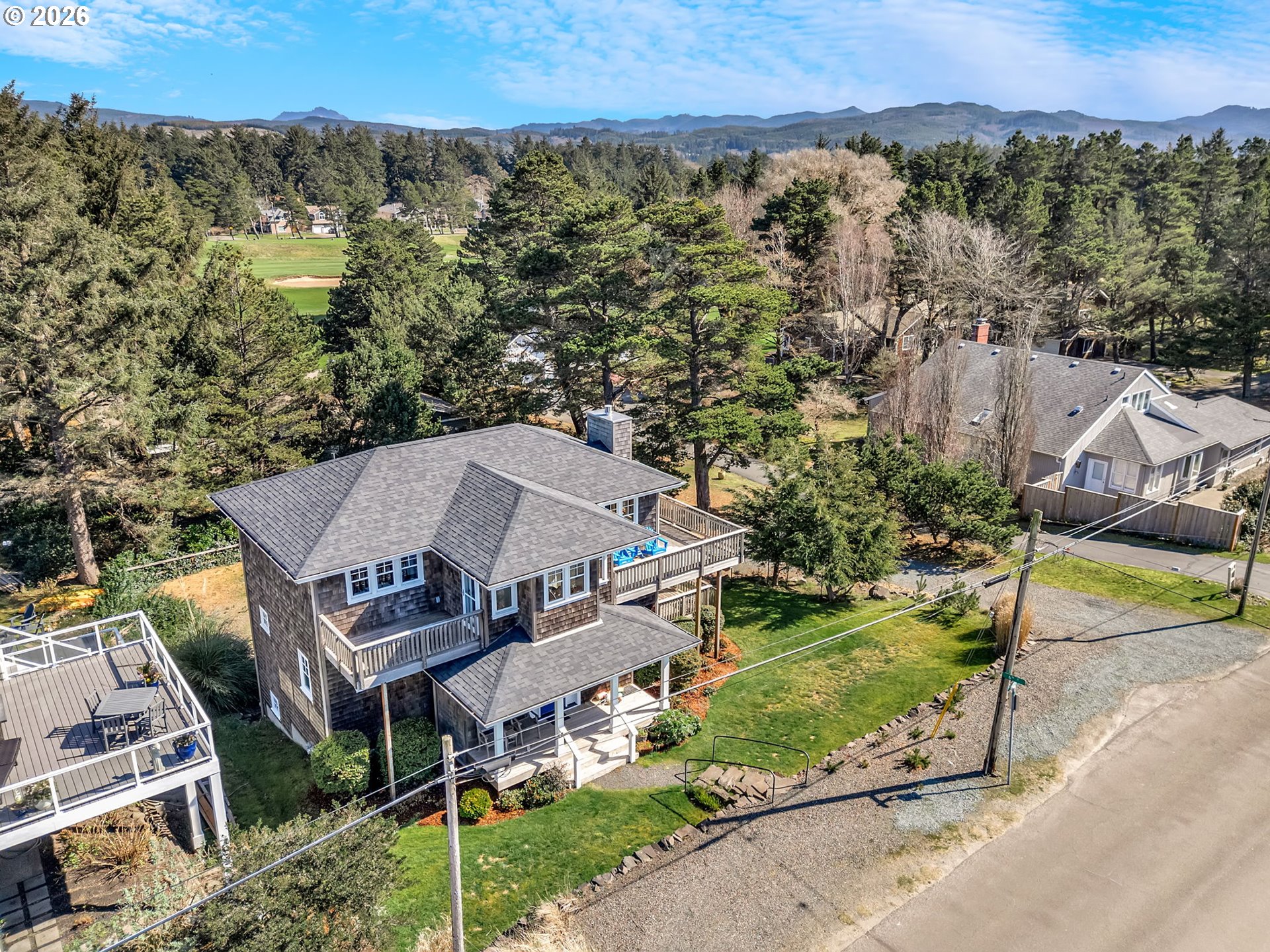 Custom Cape Cod style home built by Paul Carauna exudes charm and warmth throughout. Features rich wood floors, wood trimmed windows, 2 gas fireplaces, and a delightful kitchen with a large butcher-block island - perfect for gathering and conversation. Enjoy ocean and mountain views from the upper main living area. Also featured here is a wrap-around deck with west, south and east exposures for both sun & shade. Enjoy watching the popular Fourth of July Parade from your deck as well. The cozy primary suite includes it's own gas fireplace, reading & library nook and deck access. Downstairs, in the day-light basement is a 400 sq ft, partly-finished, bonus space which would make a great media room, studio, etc. Conveniently located, home is within walking distance to downtown Gearhart, the golf course and local eateries. And 1 block to a beach trail. Updates include a new roof in 2024 & new gas water heater.