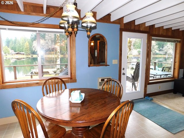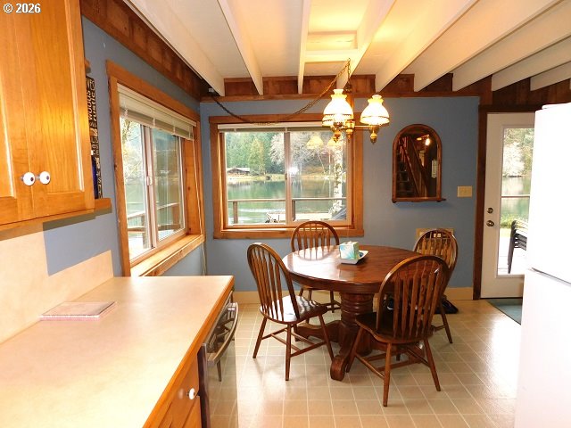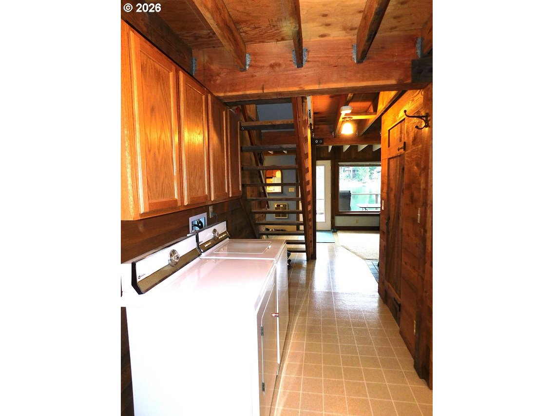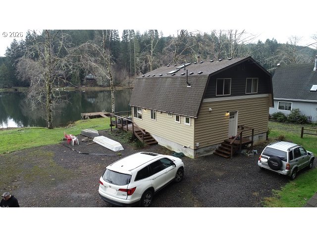 Experience lakefront living in this unique and charming "barn" style home, thoughtfully designed for durability and comfort. Constructed by an expert barn builder, this residence was built with longevity in mind, featuring earthquake-proof construction and specialized bat-proofing for added peace of mind. The home boasts a brand new roof installed in 2020, stylish new doors, and beautifully refinished dock and deck areas, perfect for outdoor enjoyment. The spacious 1,680-square-foot layout includes a primary bedroom conveniently located on the main floor, with three additional bedrooms upstairs—ideal for large groups or hosting guests. High, open-beam ceilings flood the interior with natural light, creating a warm and inviting atmosphere. The dining room opens directly onto a large deck, offering seamless indoor-outdoor flow for relaxing, entertaining, or simply soaking in the views. Upstairs, the bedrooms feature vaulted ceilings and share a Jack and Jill half bath with modern laminate flooring. Cozy up on chilly evenings by the pellet stove in the living room. The generous lot provides ample parking and the home comfortably sleeps 9–10 people, making it perfect for gatherings. Enjoy the tranquility and beauty of lakeside living at Fishhawk Lake—where every day feels like a getaway.