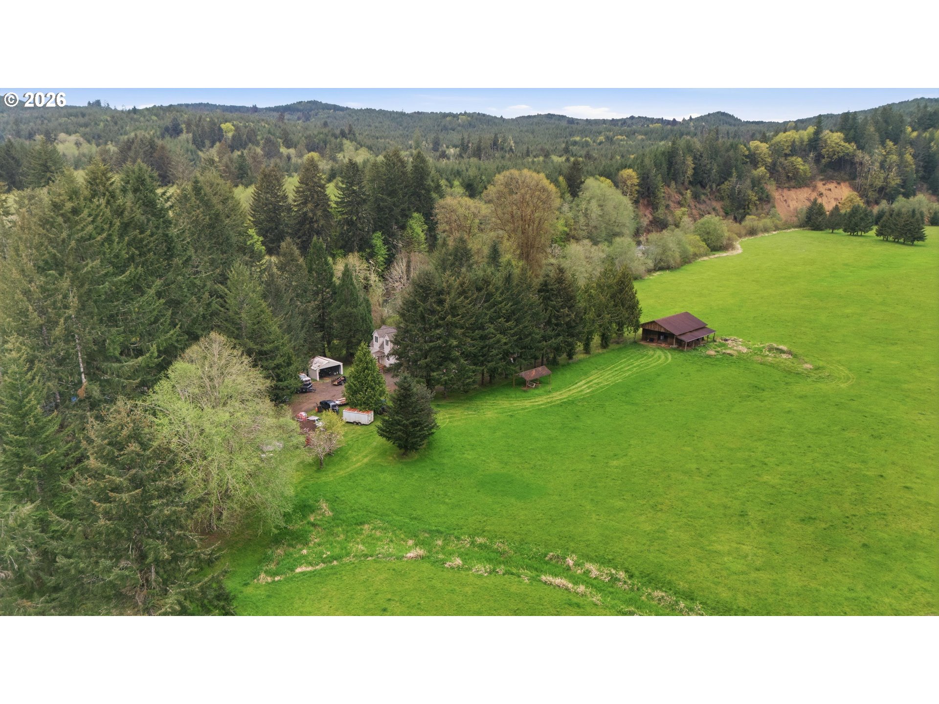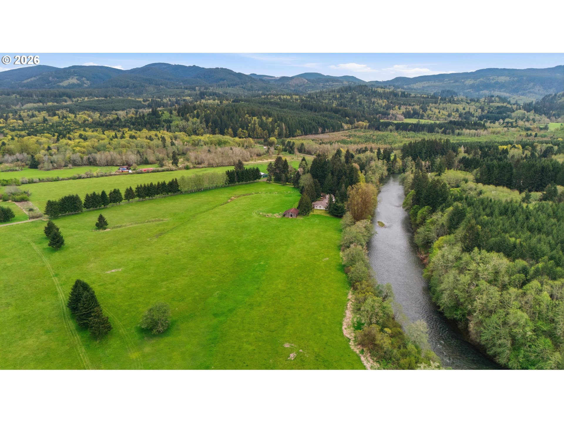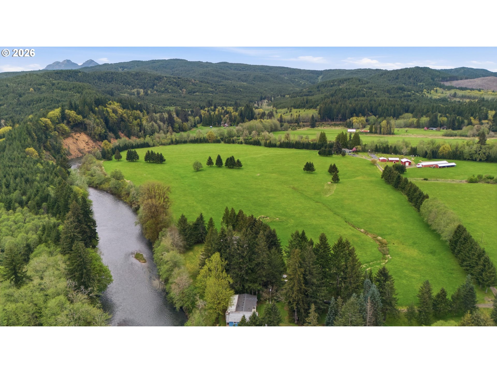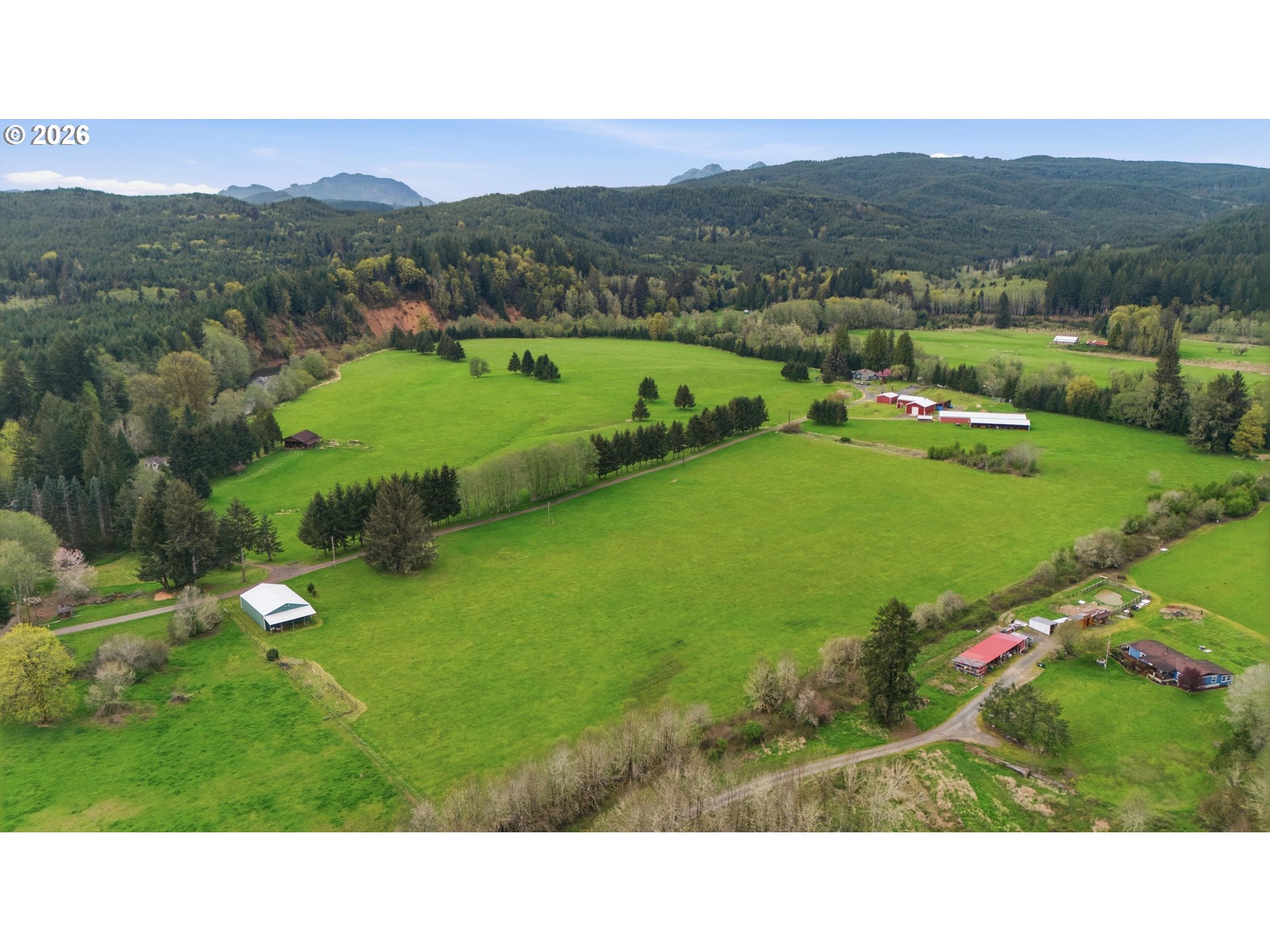 Incredibly serene 37.14 acre property, 3 bed 2 bath 2,254 sqft triple wide manufactured home with large covered front porch. Living room has vaulted ceilings, lots of windows and propane fireplace. Large kitchen with pantry, large bedrooms, primary bed with vaults, walk in closet and ensuite bath with oversized soaker tub, and stand up shower. Seller has new shower base purchased and never installed if someone wanted to remodel primary bath. Slider from dining room to back deck with enclosure around hot tub. Hot tub is newer but has a small leak believed to be around one of the jets. House has full house Generac generator and propane tankless hot water heater. Outbuildings included; 3 stall horse barn with hot and cold water wash stall, hay storage, office/tack room with toilet. 3 car detached Garage is wired 220 with both 220 and 20 amp outlets and wired relay for exterior lights so if there is motion all lights come on. 2 story attached workshop below with studio above with full bath and beautiful hardwood floors from the over 100 year old grange when it was taken down. Buyer to do their own due diligence on the workshop/studio being used as an ADU.Well pump house with backup generator. 40x60 shopLarge wood shed that could be used for boat storageWood shedUtility shed2 car metal car port. Roof on house and 3 car garage new in 2020 with transferrable warranty. Property has 1,000 ft of Nehalem river frontage, stairs down to the river have been started. 32.14 acres in tax deferral and have been hayed for years there is no present lease or contract so that new owner has no immediate obligation. Seller has contacts if new owner would like to engage with someone interested in haying the property. Propane tank is rented, diesel tank is owned. 3 California redwoods, Alder, Fir, Redwood, Cedar, Pear and Apple trees. Wildlife including elk herd that frequent the property.
