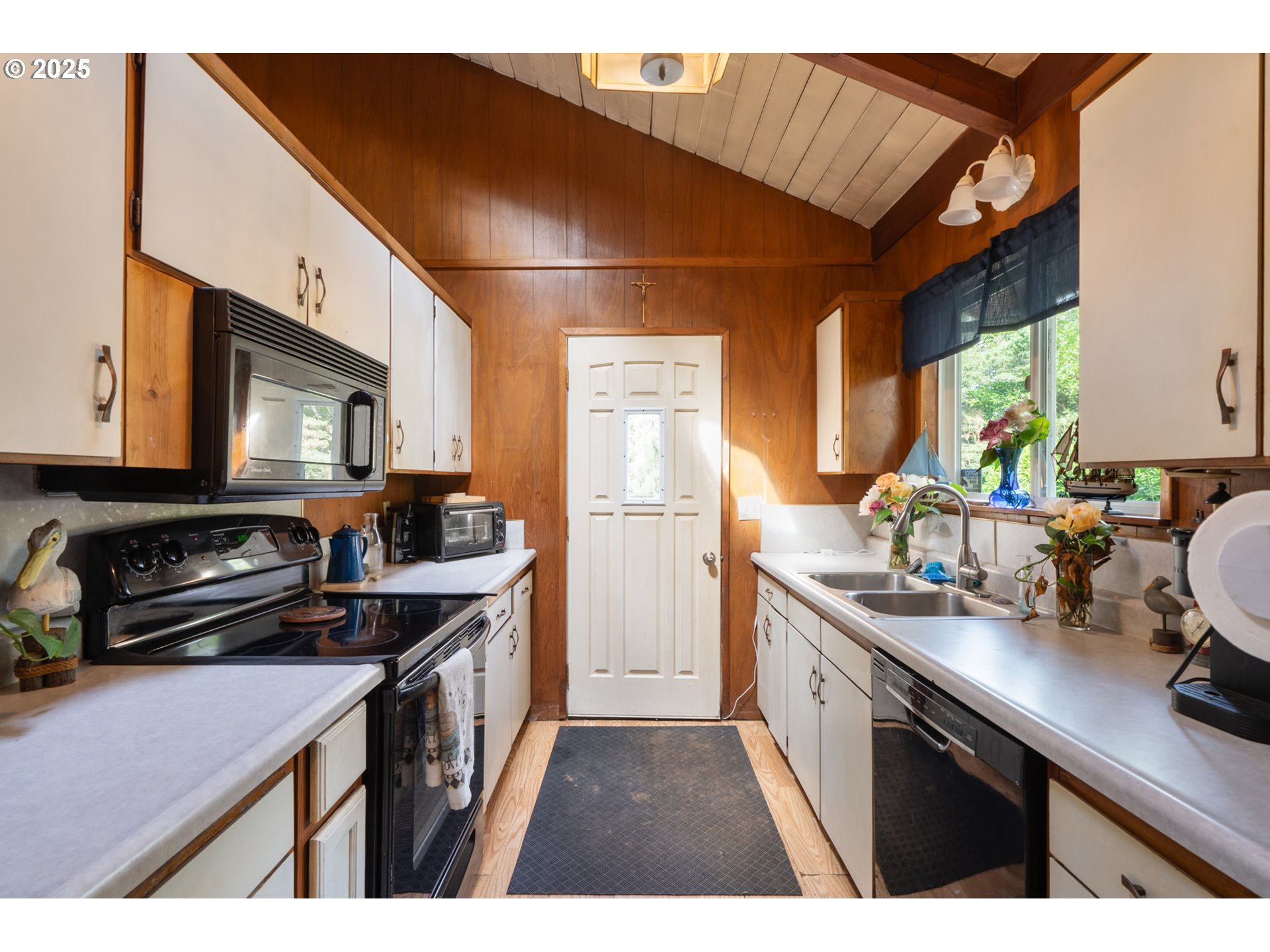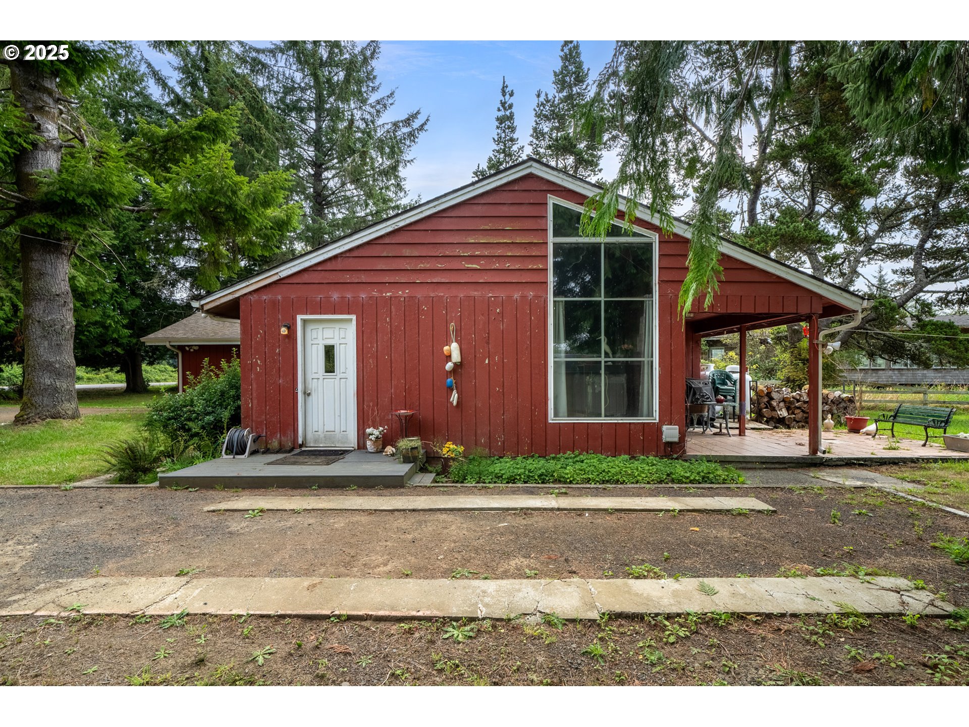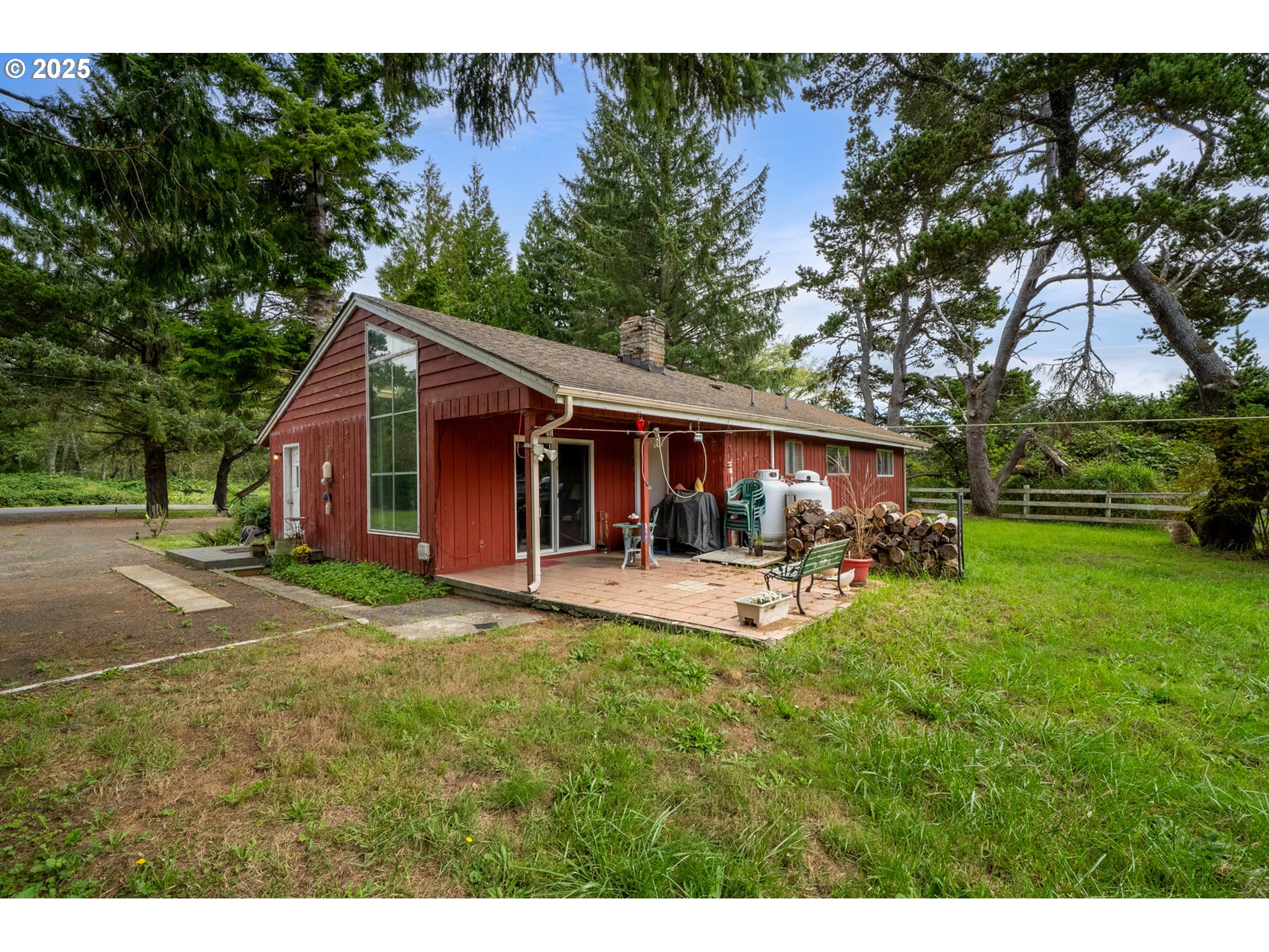 Discover the charm of this cozy coastal gem! This 3 bedroom, 2 bathroom single level home sits on just over an acre, offering space to relax and enjoy nature. Inside, you’ll find beautiful wood plank vaulted ceilings and a stunning floor to ceiling rock fireplace in the living room, creating a warm and inviting atmosphere. Rich wood paneling, the plank ceiling, and the fireplace surround add to the home’s rustic charm, while a built-in shelf provides both character and functionality. The galley style kitchen flows into an attached dining room, making meals and entertaining easy. One bathroom is thoughtfully combined with the laundry room for added convenience, featuring a shower, while the second bathroom includes a tub/shower combo with a classic tile countertop. Step outside through the living room slider to a covered patio, perfect for year round enjoyment. An additional patio space out back provides even more room for relaxing or gathering. With plenty of space to play, garden, or simply soak in the peaceful surroundings, this property offers a wonderful retreat in a serene coastal setting.