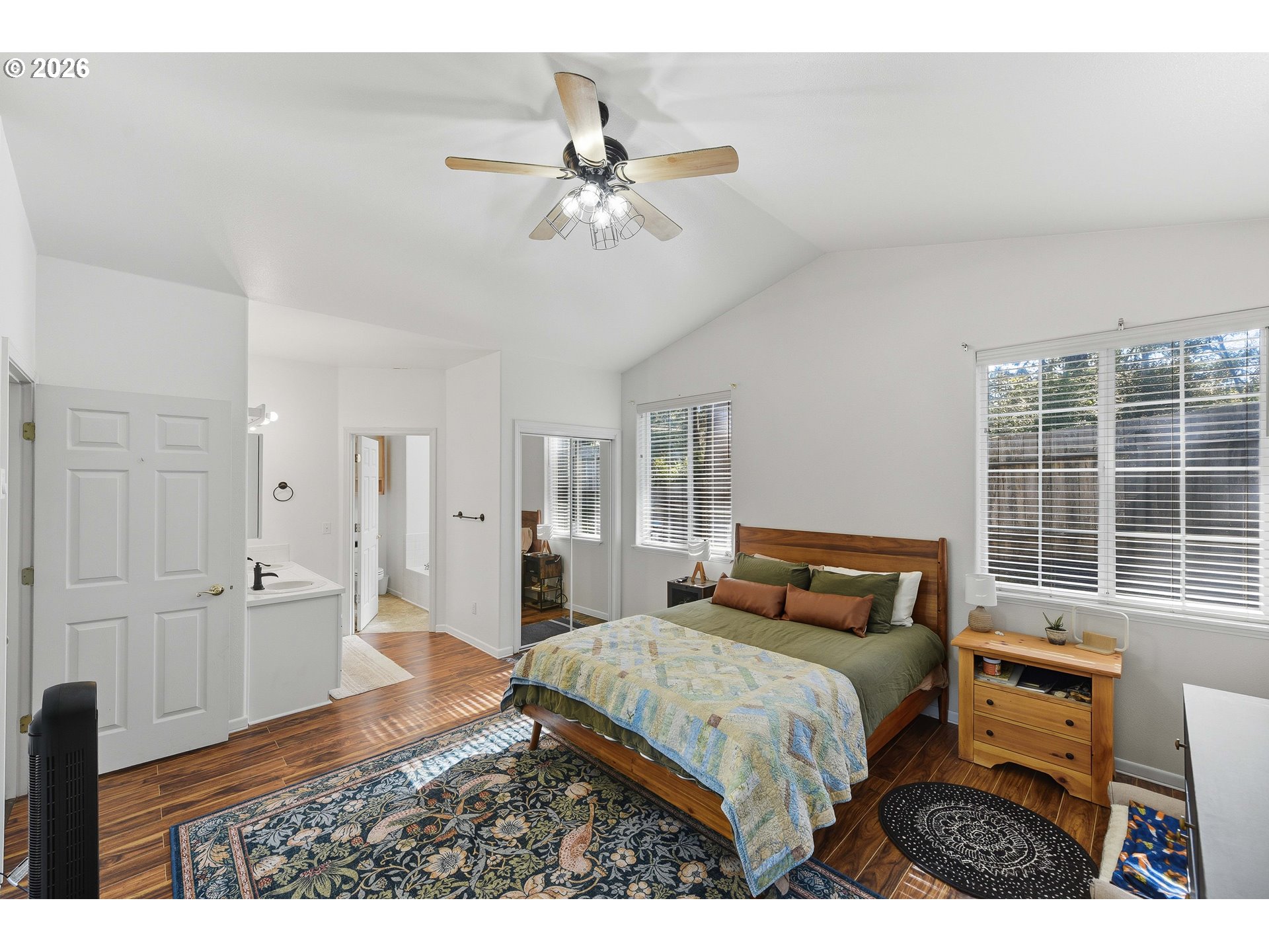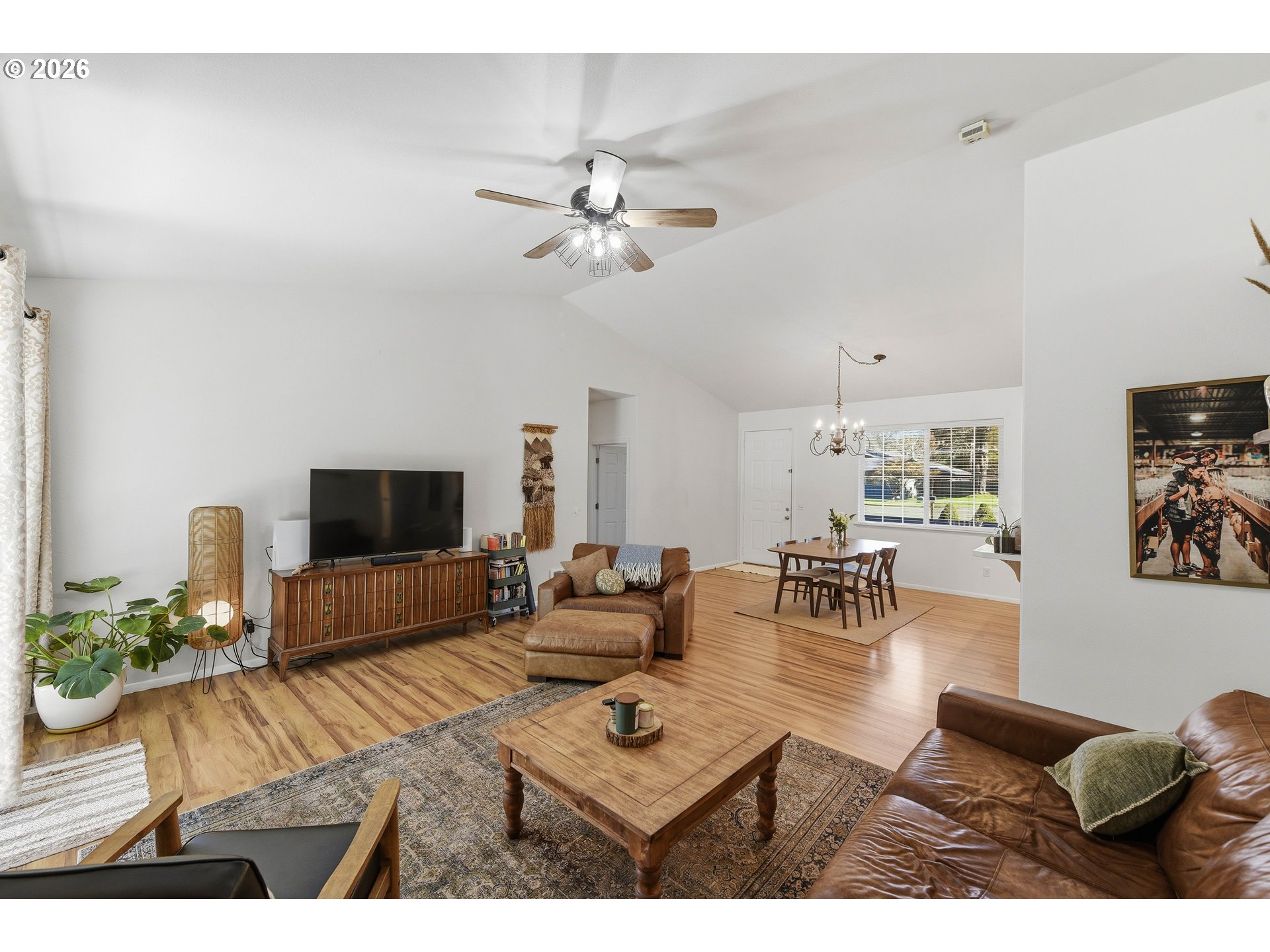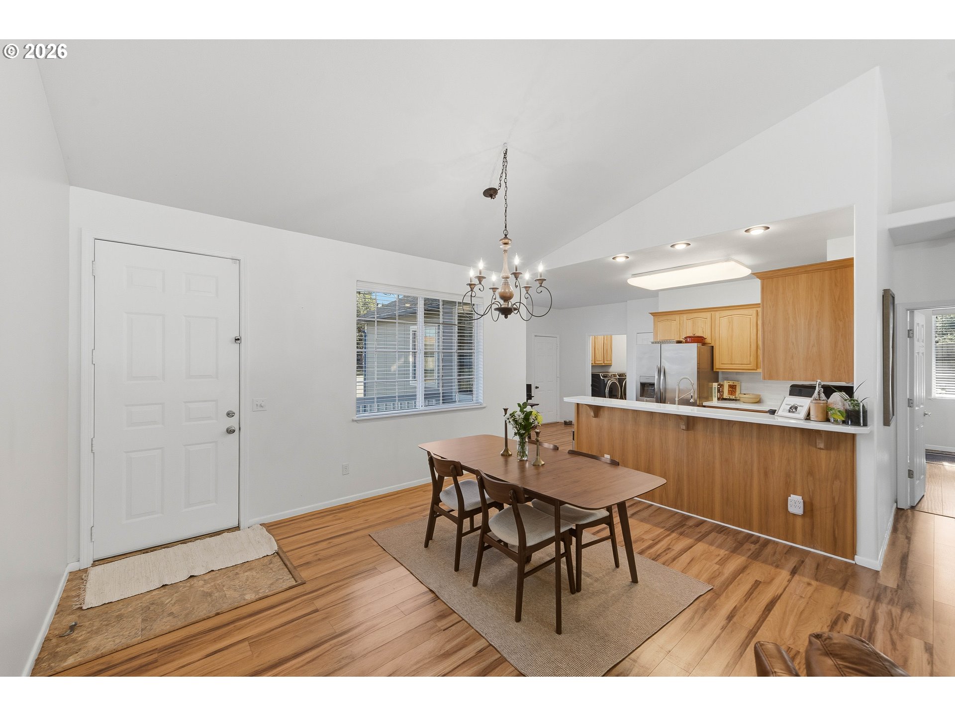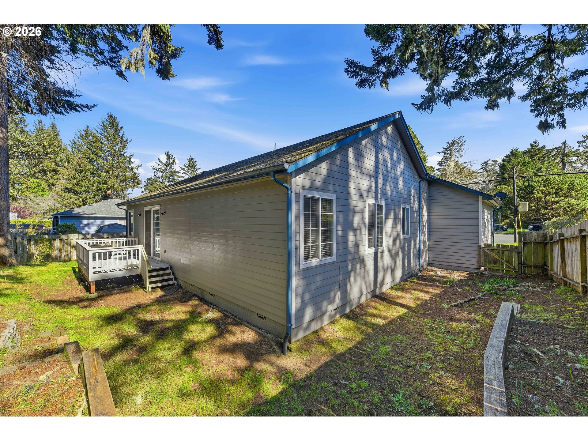 Beautifully maintained three-bedroom, two-bath, 1,562 sq. ft. home, offering an inviting open-concept design with soaring vaulted ceilings and expansive windows that fill the space with natural light. The well-appointed kitchen features stainless steel appliances, a pantry, and a breakfast bar that overlooks the dining space and main living area, creating an ideal setting for gatherings. The living area opens to a private deck with serene wooded views and a fenced backyard. A spacious primary suite includes an attached bath with a walk-in shower & soaking Tub. Recent upgrades include updated flooring and modern lighting, along with a laundry area equipped with washer and dryer. The two-car garage features a new door and provides additional storage space. Situated in a desirable neighborhood, the property also boasts a charming front yard with a circular driveway and convenient access to John Topits Park, scenic lake trails, coastal beaches, sand dunes, and nearby medical services.