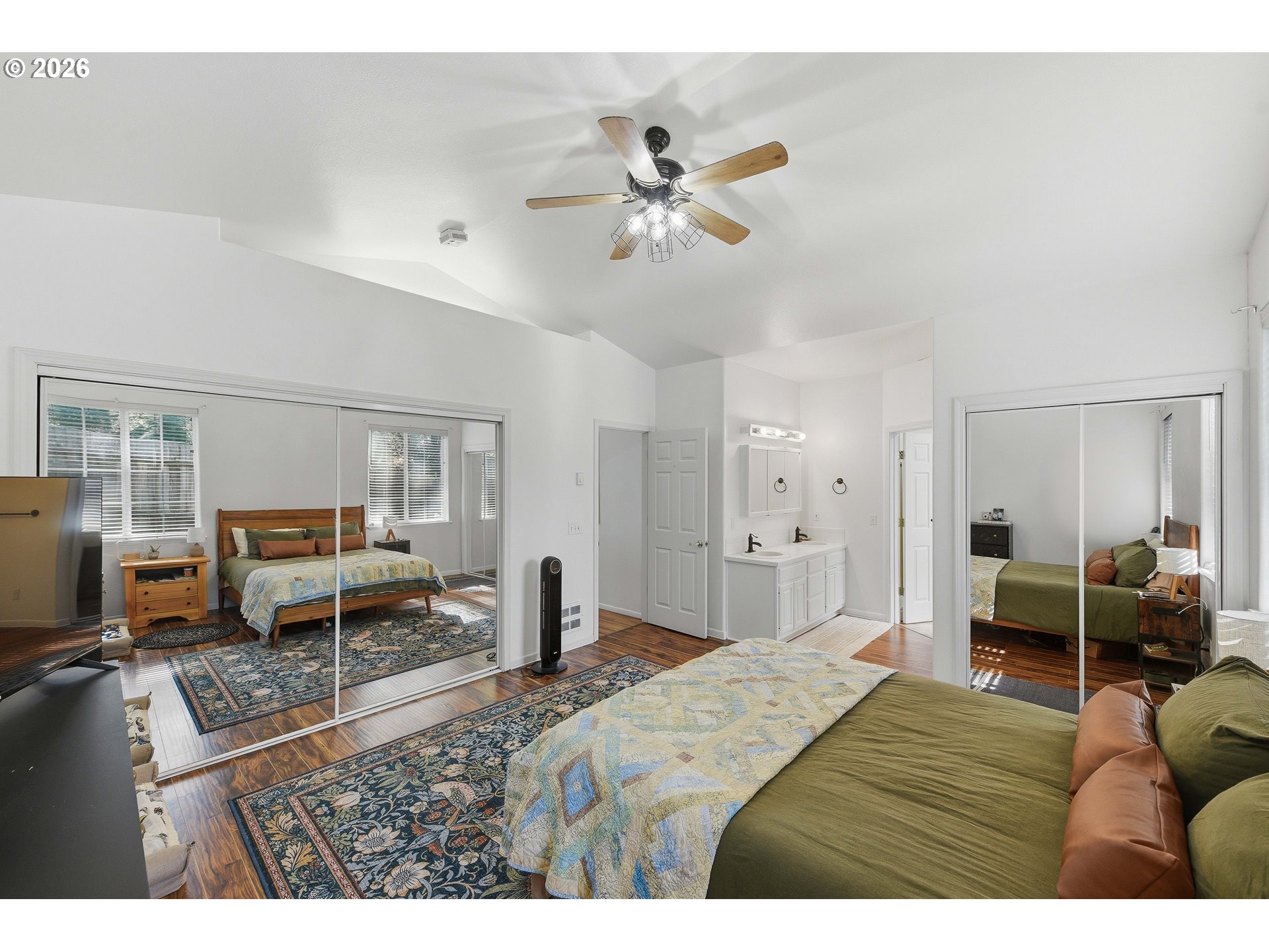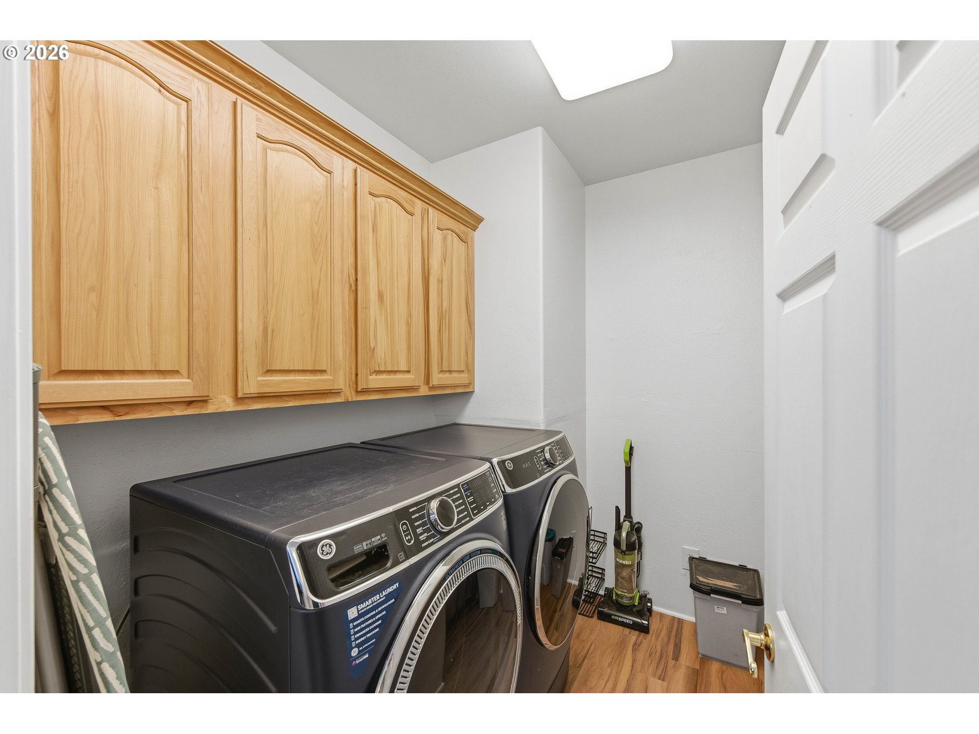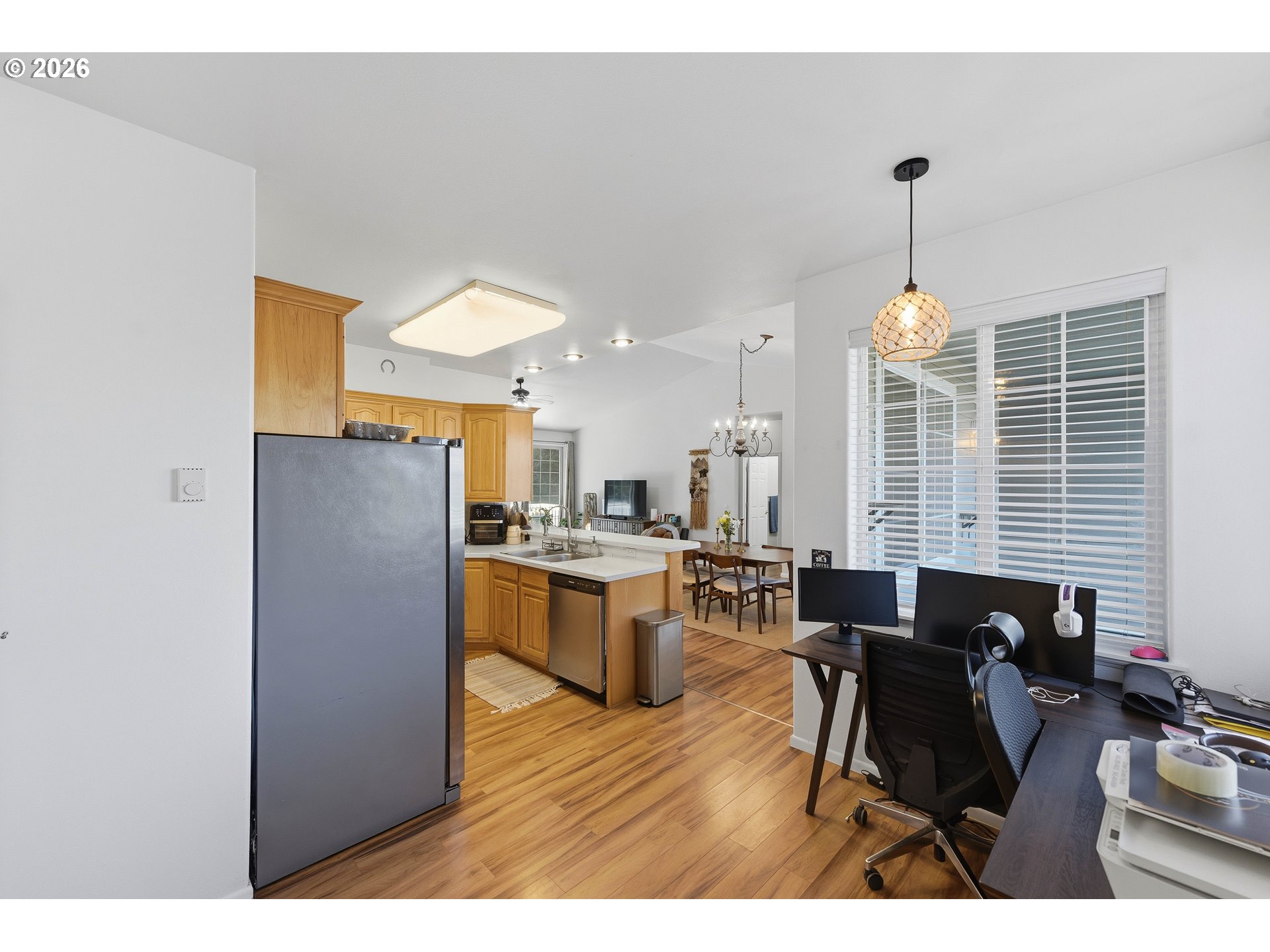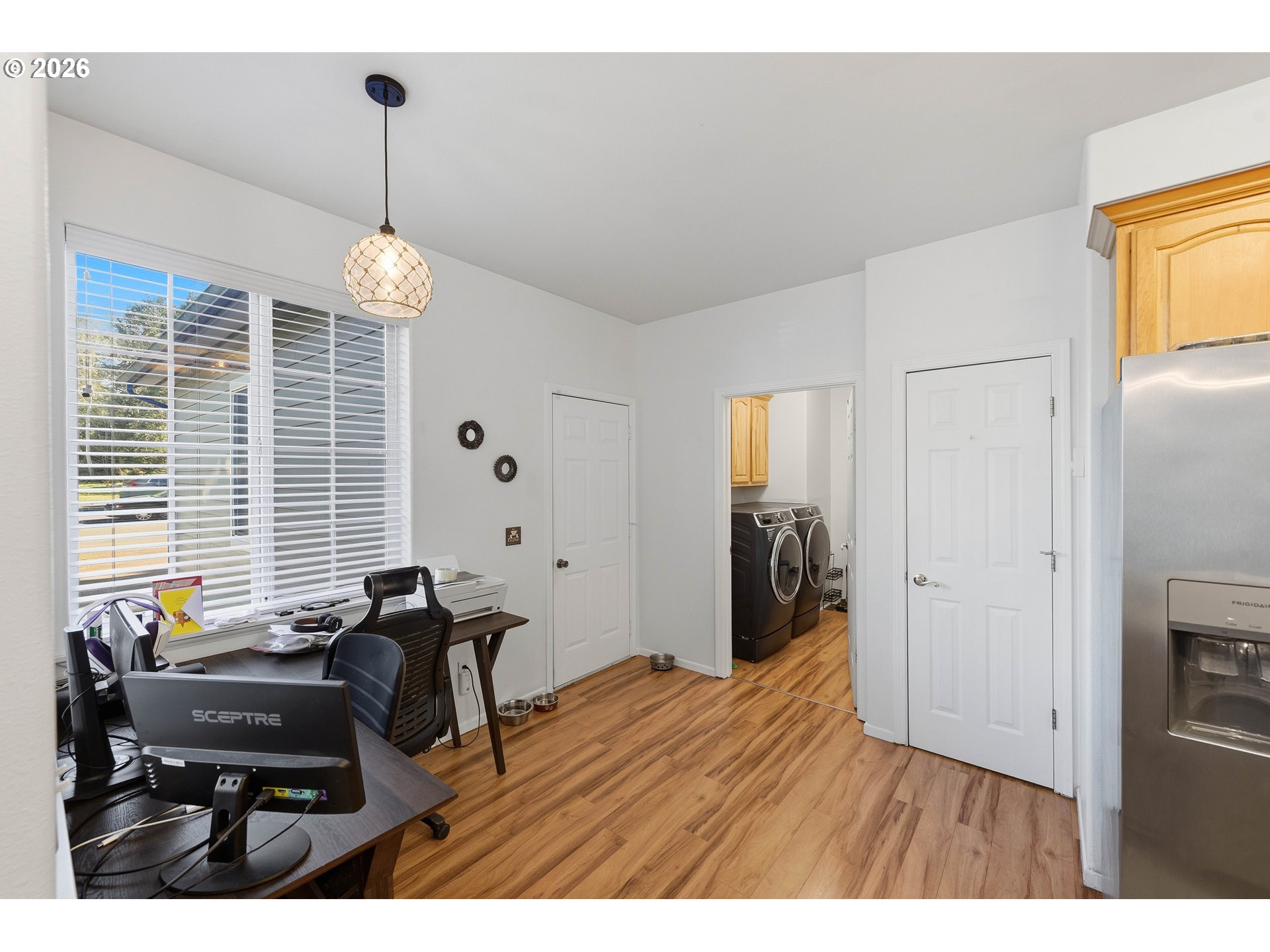 Beautifully maintained three-bedroom, two-bath, 1,562 sq. ft. home, offering an inviting open-concept design with soaring vaulted ceilings and expansive windows that fill the space with natural light. The well-appointed kitchen features stainless steel appliances, a pantry, and a breakfast bar that overlooks the dining space and main living area, creating an ideal setting for gatherings. The living area opens to a private deck with serene wooded views and a fenced backyard. A spacious primary suite includes an attached bath with a walk-in shower & soaking Tub. Recent upgrades include updated flooring and modern lighting, along with a laundry area equipped with washer and dryer. The two-car garage features a new door and provides additional storage space. Situated in a desirable neighborhood, the property also boasts a charming front yard with a circular driveway and convenient access to John Topits Park, scenic lake trails, coastal beaches, sand dunes, and nearby medical services.