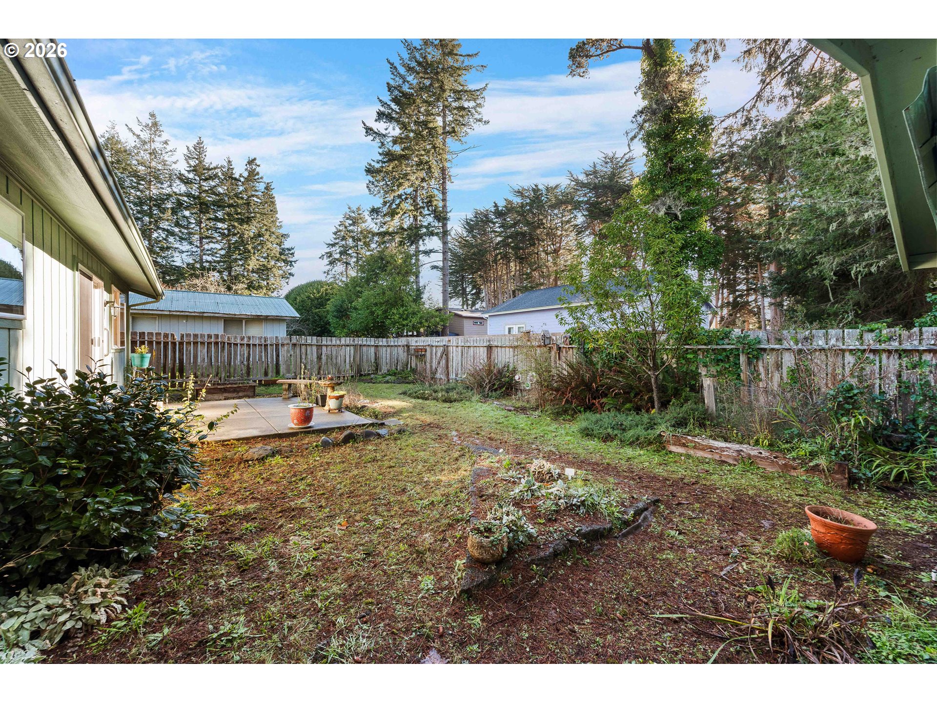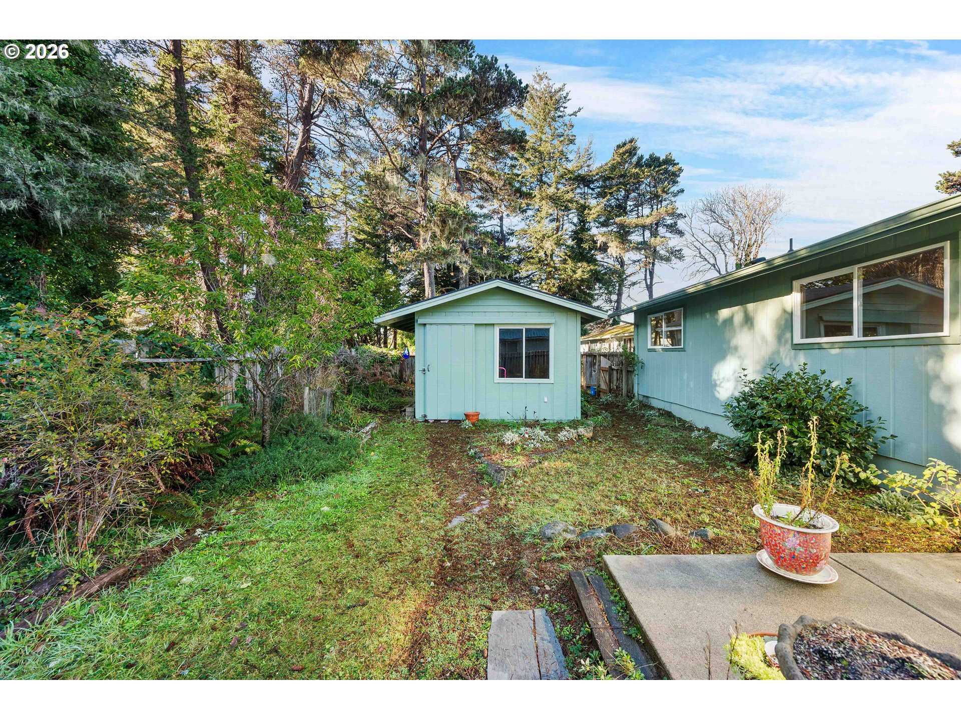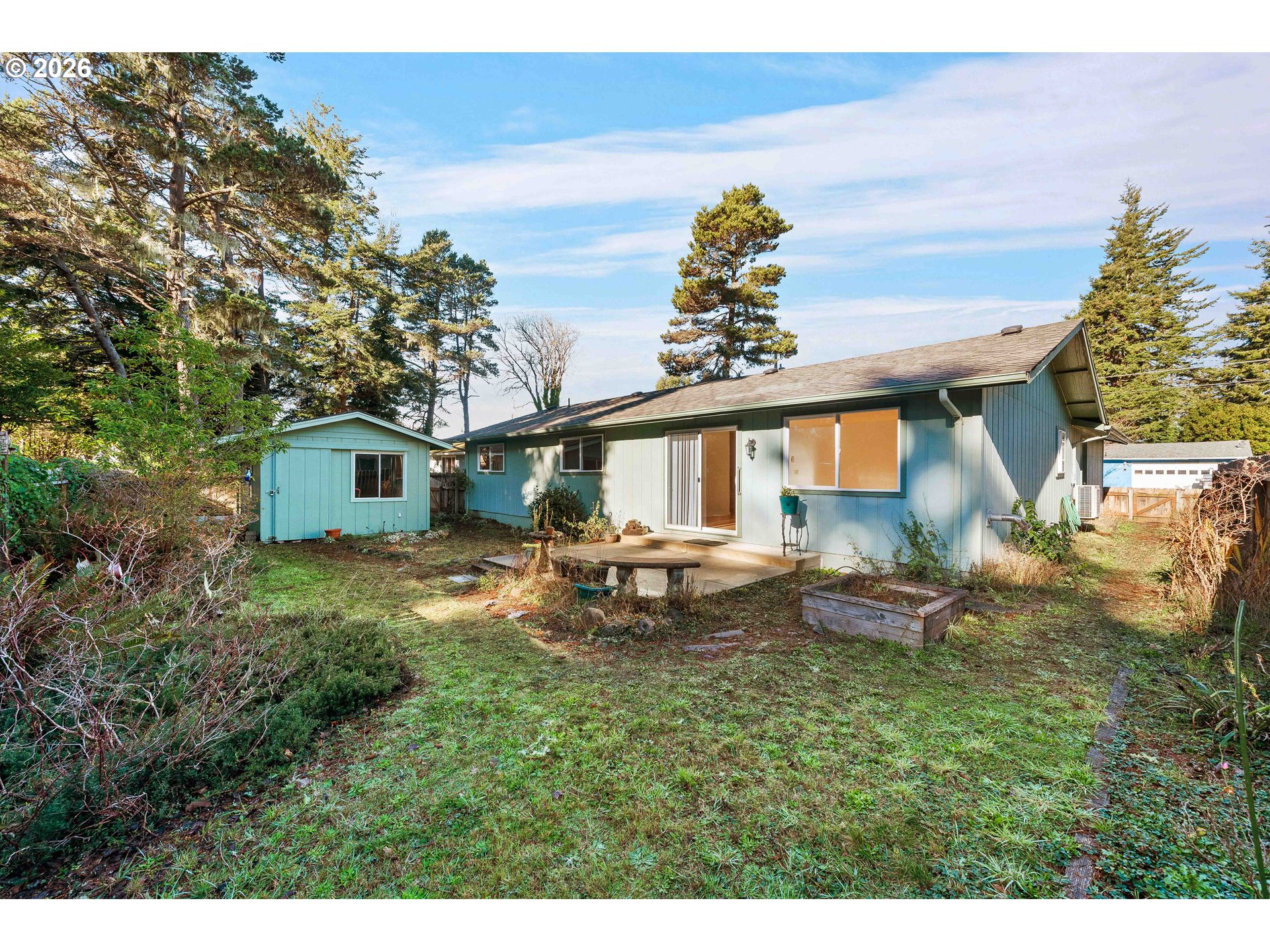 Well-cared-for single-level home in Bandon, Oregon with 3 bedrooms and 1.5 baths—a sweet, inviting place that’s been maintained over the years. Cozy newer pellet stove plus a very nice Daikin in-ceiling heat pump (heat/AC) (with a dehumidifying feature) and zonal wall heaters. Laminate wood flooring through much of the home, with carpet in the primary bedroom and vinyl flooring in the remodeled full bath.The main living areas feel spacious, including the living room, dining room, and kitchen. The layout is very functional as-is, with plenty of room to enjoy right away, and there’s also major potential if someone wants to update or reconfigure the kitchen/dining setup. Step out from the living room slider to a nice concrete patio—simple, usable outdoor space. Appliances stay—refrigerator, electric range, and dishwasher—along with the washer and dryer. The full bath has been remodeled, there are multiple linen closets, and the primary bedroom has a half bath.You’ll appreciate the finished two-car garage with a utility sink and laundry setup. The backyard has a large garden shed and a raised garden bed—it used to be a beautiful garden with roses and flowers and just needs a little TLC to bring it back. All city utilities, and you’re close to grocery stores and around-town amenities in Bandon. Built in 1974 and maintained over the years. Sold as-is.