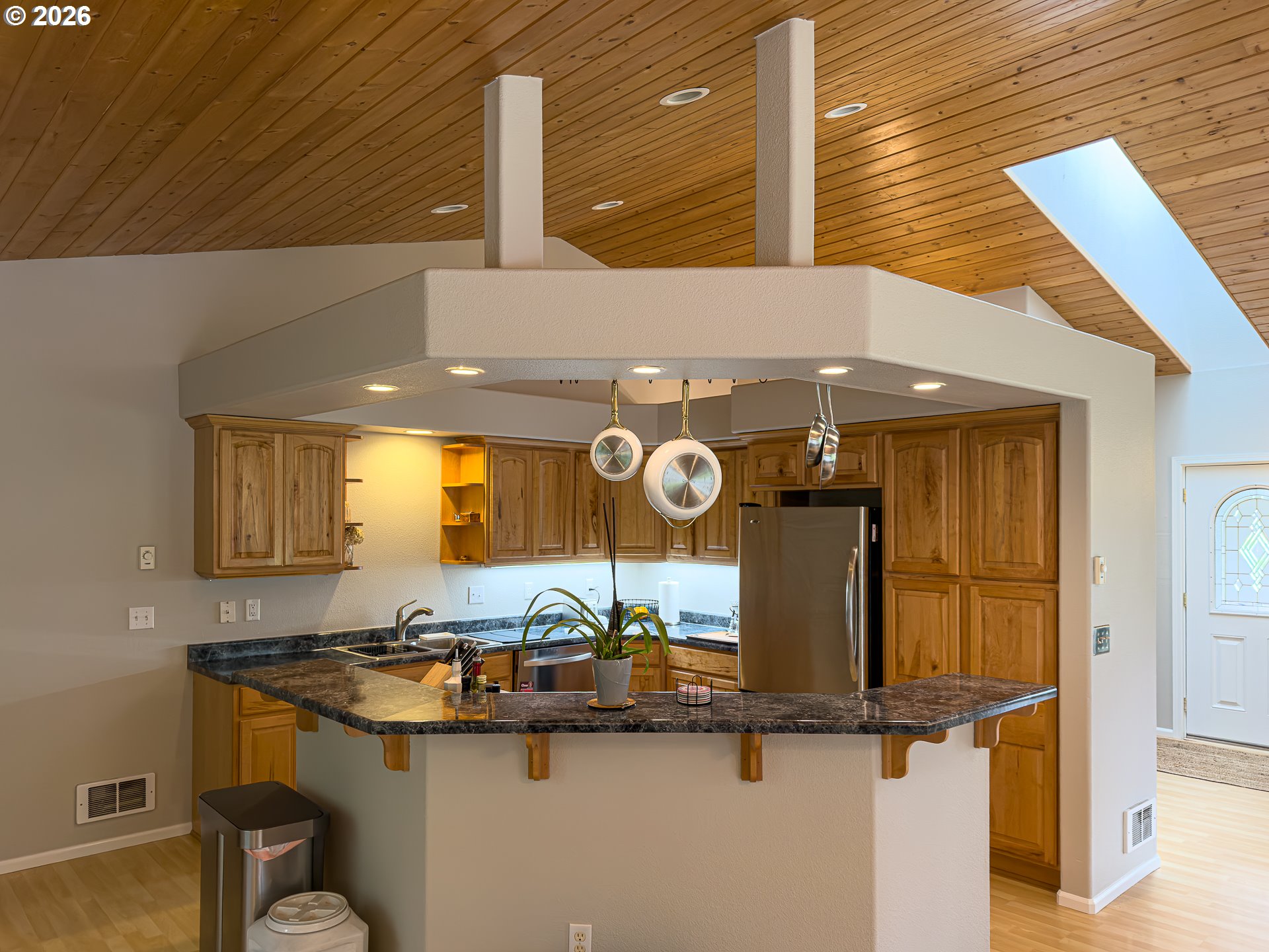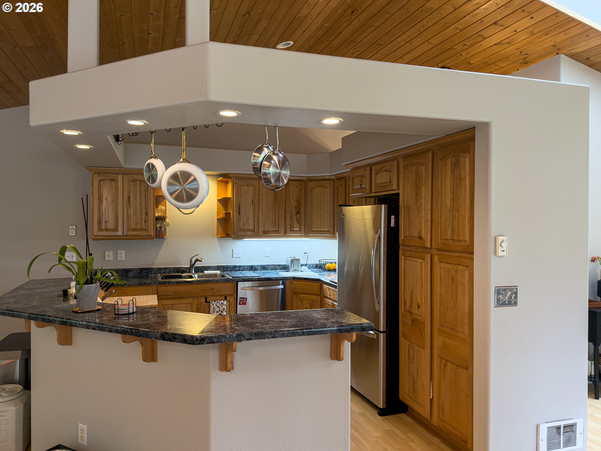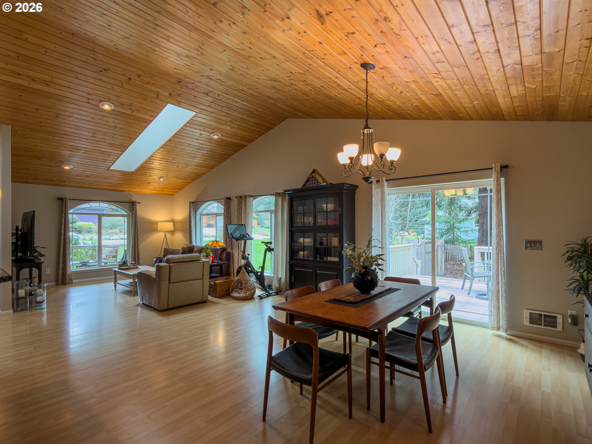 (503) 893-8874Located at 1185 11th St SE in Bandon, Oregon, this custom single-level home offers comfortable living in a desirable East Bandon neighborhood known for newer custom homes and its sheltered setting out of the coastal wind. Situated on a generous 0.27-acre lot, the property features a sprawling yard with mature landscaping ideal for outdoor enjoyment and gardening. A welcoming covered front porch invites you into this home comprised of three bedrooms and two bathrooms, with an open-concept living and dining area enhanced by abundant natural light exuding from skylights and large picture windows. Warm interior finishes, including knotty pine tongue-and-groove vaulted ceilings and laminate wood flooring, create an inviting atmosphere throughout. The kitchen is thoughtfully designed for both everyday use and entertaining, featuring under-lit oak cabinetry, a central island with cooktop and downdraft. The primary suite offers a walk-in closet and a private ensuite bath. A sliding glass door off the dining area leads to a deck with warm southern exposure and a peaceful, treed backdrop. The backyard blends with nature and includes a practical tool shed for storage and other uses. This well-located property combines functionality, comfort, and a setting that makes the most of Bandon’s coastal lifestyle. Be sure to watch the video tour!