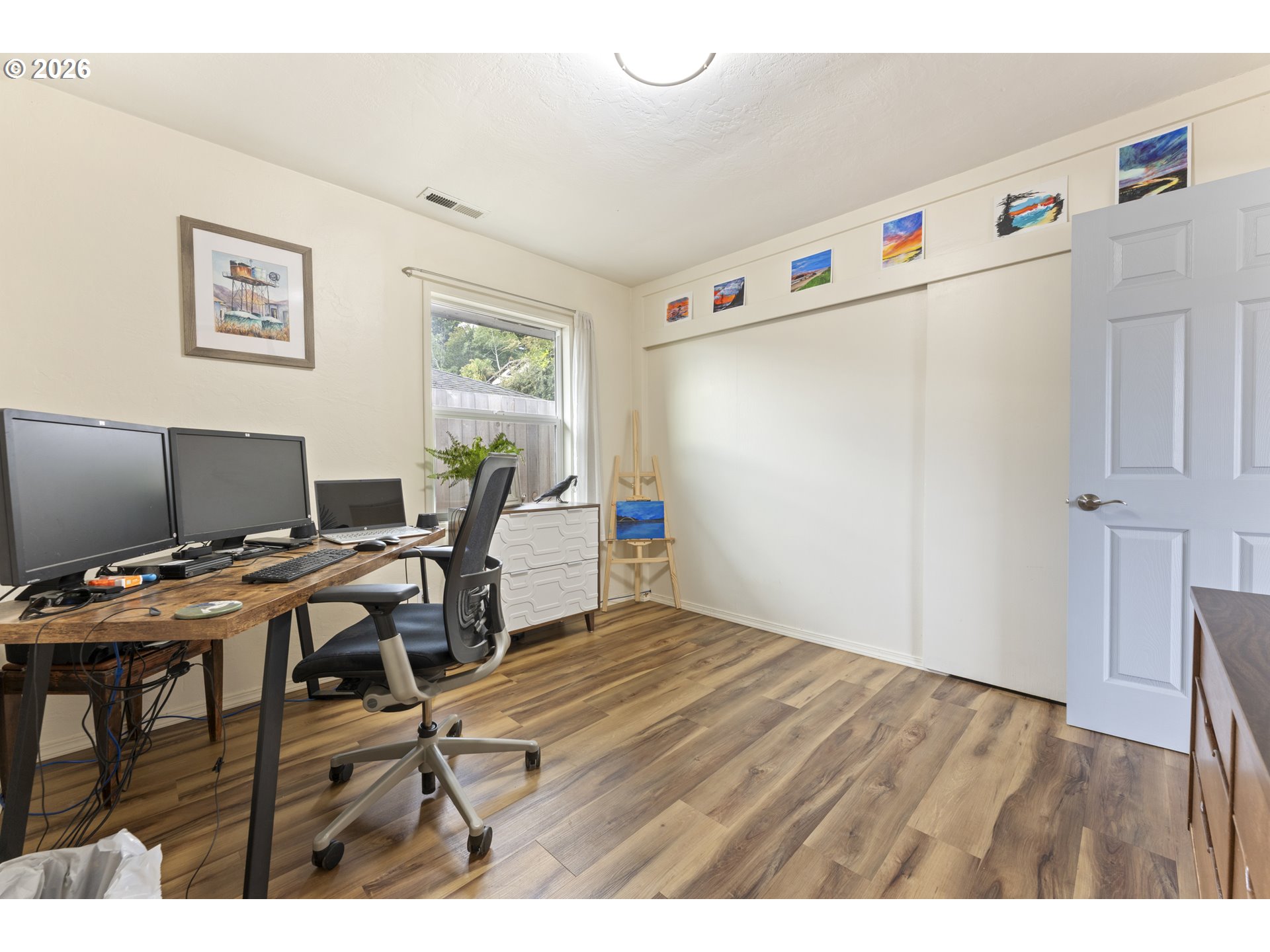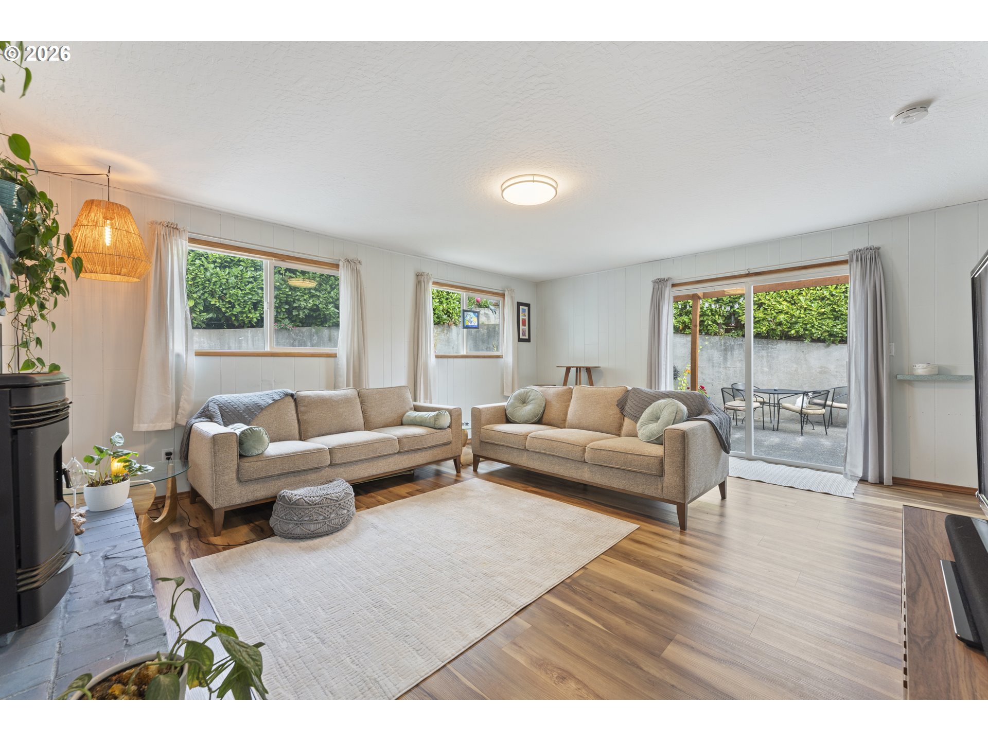 Beautifully maintained 3-bedroom, 1.5-bath home featuring a charming, private fenced courtyard with a paved patio—perfect for relaxing or entertaining. The spacious kitchen offers stainless steel appliances, solid surface countertops, and a generous pantry for ample storage. The light-filled living area showcases a large window, dining space, seamlessly connecting to the kitchen. A sizable and inviting family room highlights a newer pellet stove, creating a warm, comfortable atmosphere. The main level also includes two additional rooms ideal for guest space or a home office, along with a convenient laundry area. Upstairs, the expansive primary suite provides a sitting area, cozy reading nook. 2022 upgrades include waterproof flooring throughout, updated cabinetry, counters, refreshed bathroom finishes, newer electrical service with panel, switches, and outlets, plus a newer water heater, windows, roofing, plumbing, and gutters. Exterior amenities include RV or boat parking, a recently added backyard shed, and a heat pump for year-round comfort. The sewer line has also been updated. Ideally situated near the exciting new waterfront development in downtown Coos Bay.