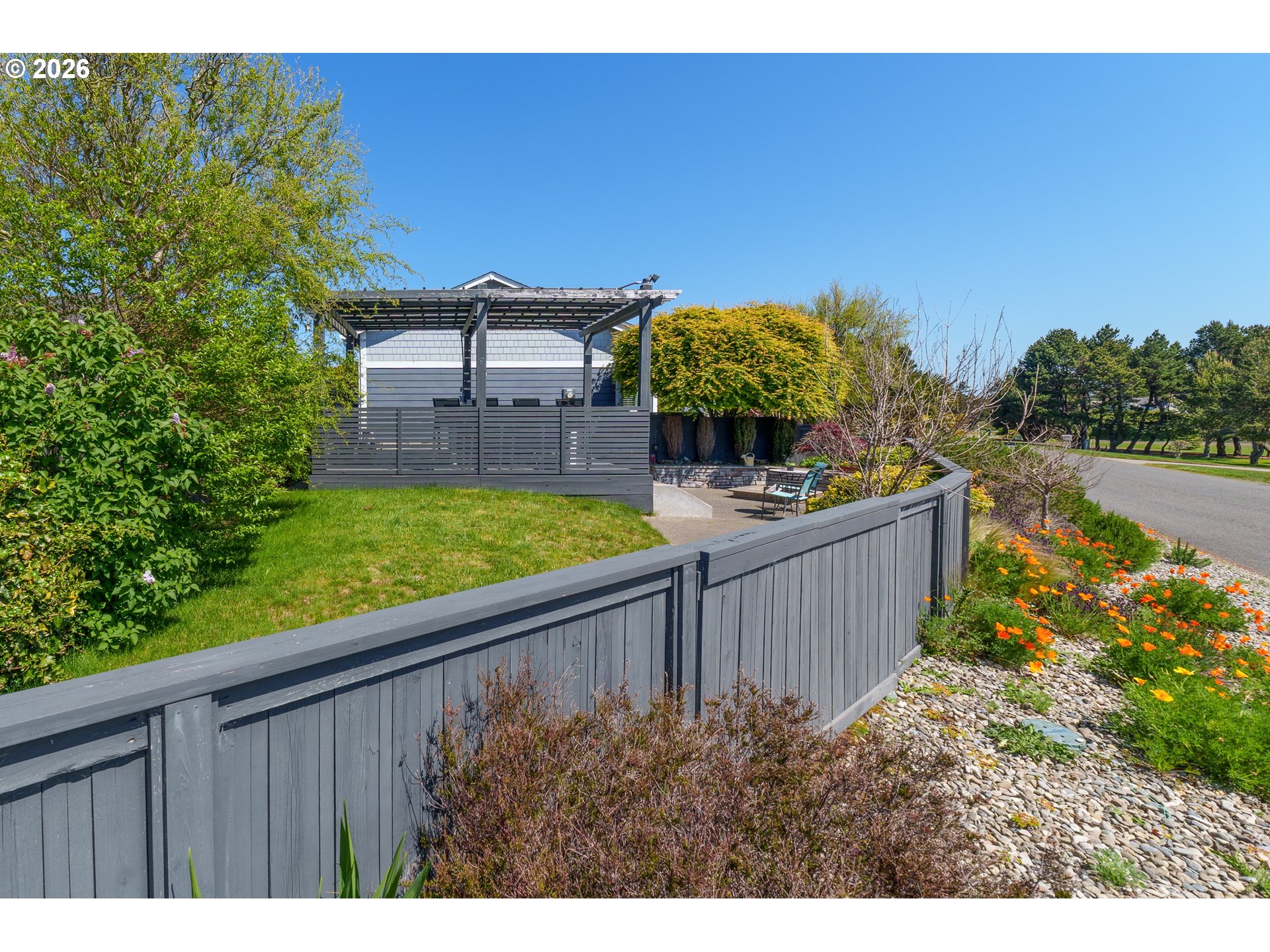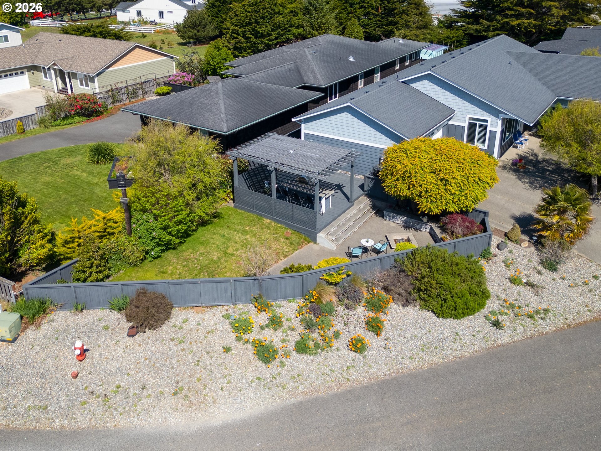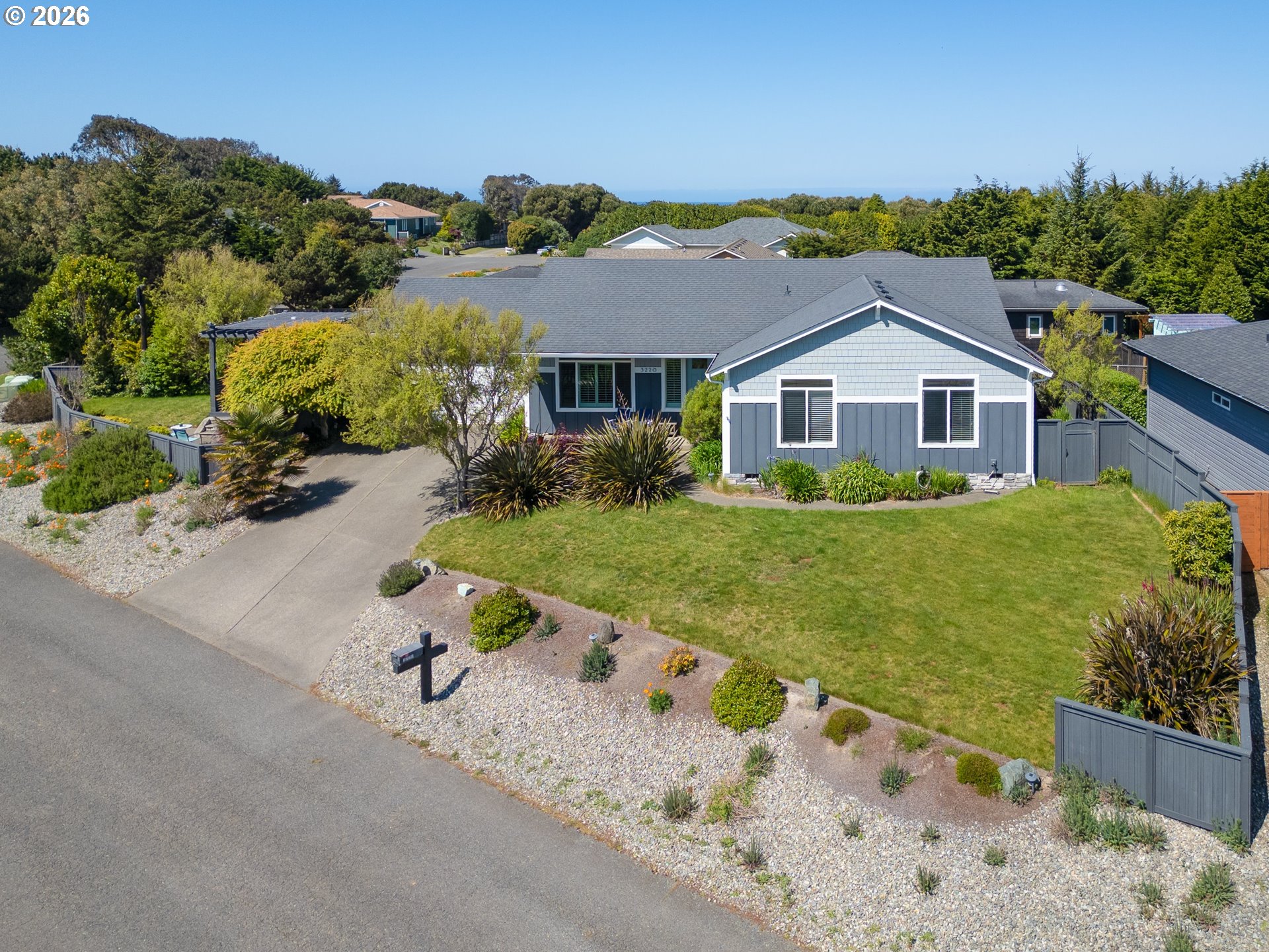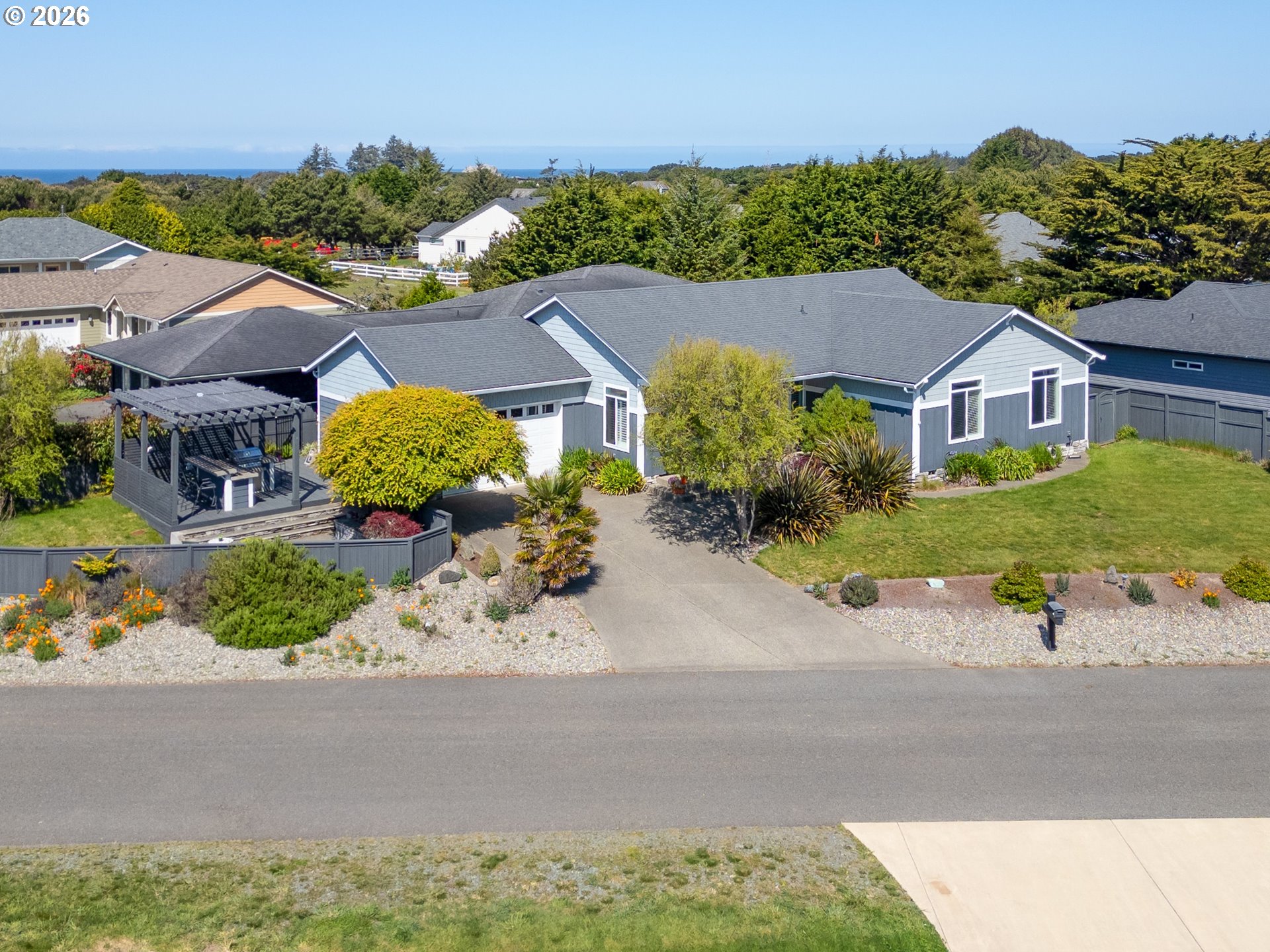Upscale landscaping frames this beautifully maintained 2,080 sq ft coastal retreat, ideally located within an easy stroll to the beach and just minutes from Bandon Dunes Golf Resort, local dining, shopping, and Old Town Bandon. Thoughtfully designed and filled with natural light, the home offers 4 bedrooms, 2 bathrooms, and a versatile bonus room perfect for a home office, library, or creative studio. The attached two-car garage includes a built-in workbench and convenient hanging bike storage. The fully fenced backyard is designed for both relaxation and entertaining, featuring a multi-level deck and patio, fire pit, built-in Lion 32" BBQ, sink with dedicated hot water heater, and a concrete bar beneath a pergola. Inside, the open-concept living area features vaulted ceilings, an electric fireplace, and plantation shutters, flowing seamlessly into the kitchen and dining area. The gourmet kitchen is anchored by an oversized granite island with seating and appointed with GE Monogram stainless steel appliances, an induction range, and granite countertops with matching backsplash. A sliding glass door enhances indoor-outdoor flow, while the nearby laundry room with Electrolux washer and dryer offers additional storage. The primary suite is a private retreat with a newly remodeled walk-in closet and direct access to a secluded deck and patio. The en-suite bathroom features a large walk-in shower, deep soaking tub, and dual vanities. Meticulously cared for and thoughtfully designed, this coastal home is move-in ready.