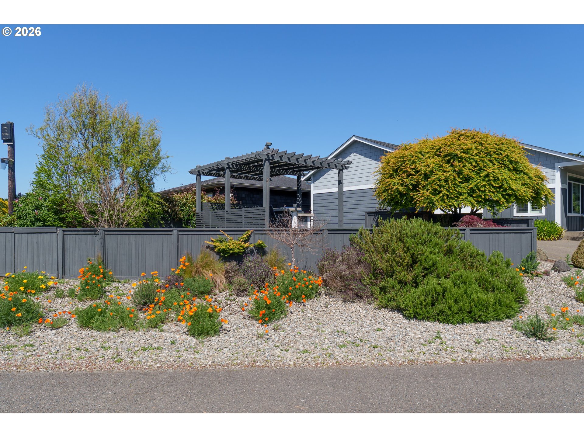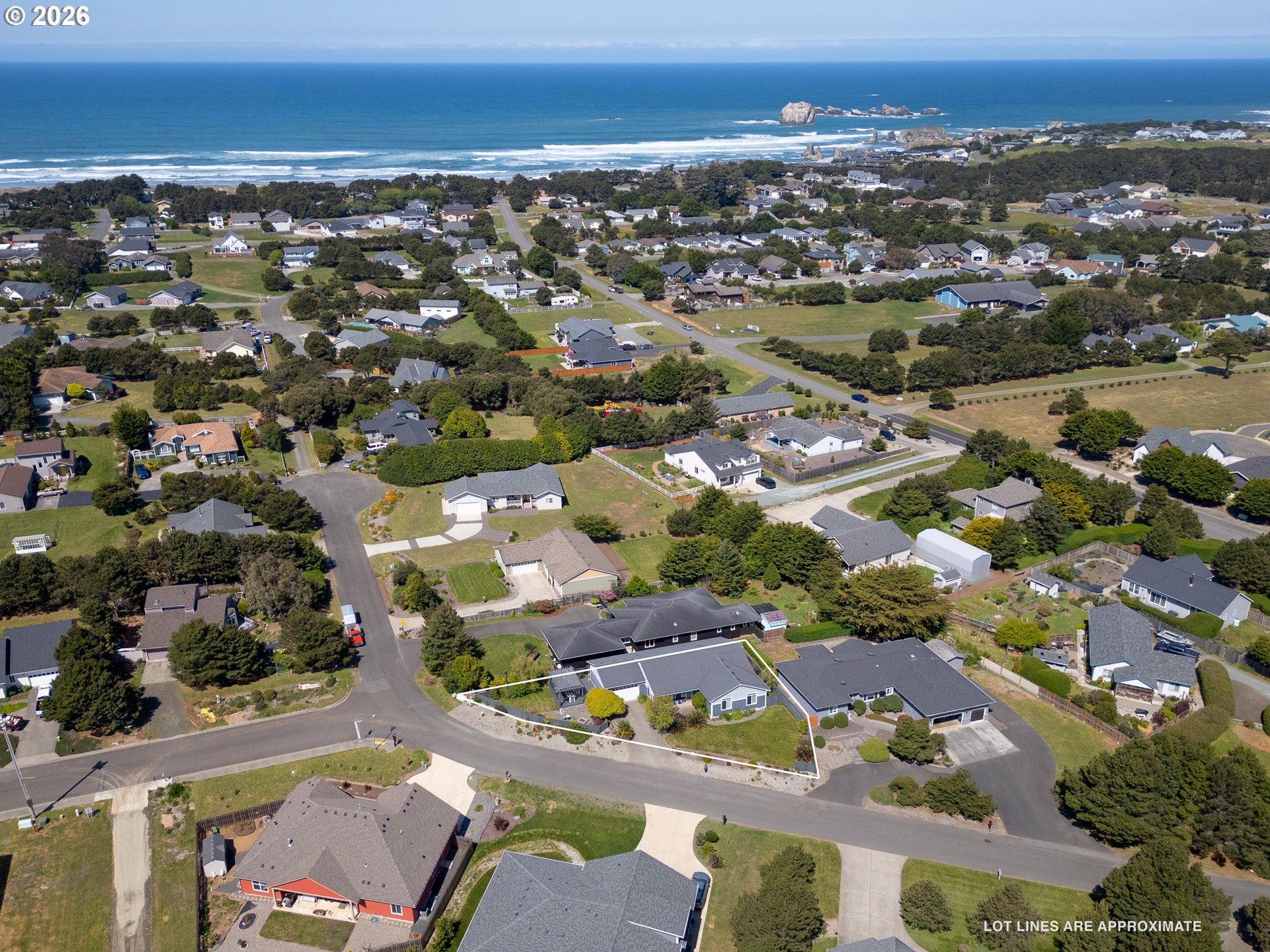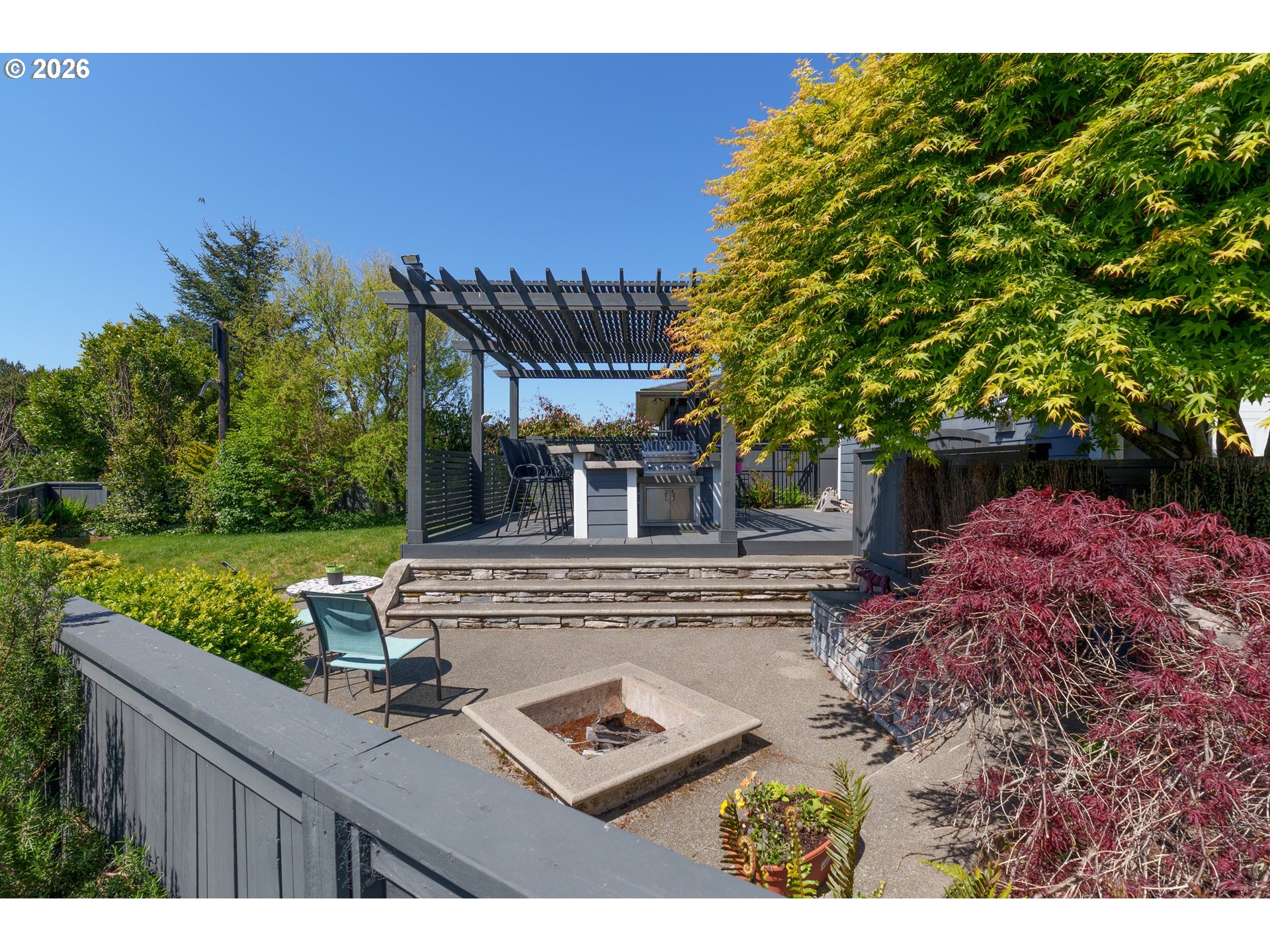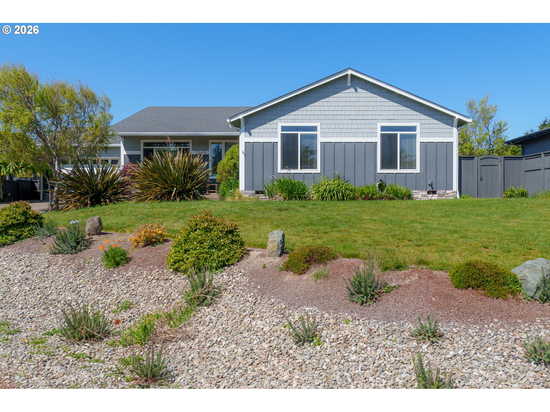 Upscale landscaping frames this beautifully maintained 2,080 sq ft coastal retreat, ideally located within an easy stroll to the beach and just minutes from Bandon Dunes Golf Resort, local dining, shopping, and Old Town Bandon. Thoughtfully designed and filled with natural light, the home offers 4 bedrooms, 2 bathrooms, and a versatile bonus room perfect for a home office, library, or creative studio. The attached two-car garage includes a built-in workbench and convenient hanging bike storage. The fully fenced backyard is designed for both relaxation and entertaining, featuring a multi-level deck and patio, fire pit, built-in Lion 32" BBQ, sink with dedicated hot water heater, and a concrete bar beneath a pergola. Inside, the open-concept living area features vaulted ceilings, an electric fireplace, and plantation shutters, flowing seamlessly into the kitchen and dining area. The gourmet kitchen is anchored by an oversized granite island with seating and appointed with GE Monogram stainless steel appliances, an induction range, and granite countertops with matching backsplash. A sliding glass door enhances indoor-outdoor flow, while the nearby laundry room with Electrolux washer and dryer offers additional storage. The primary suite is a private retreat with a newly remodeled walk-in closet and direct access to a secluded deck and patio. The en-suite bathroom features a large walk-in shower, deep soaking tub, and dual vanities. Meticulously cared for and thoughtfully designed, this coastal home is move-in ready.