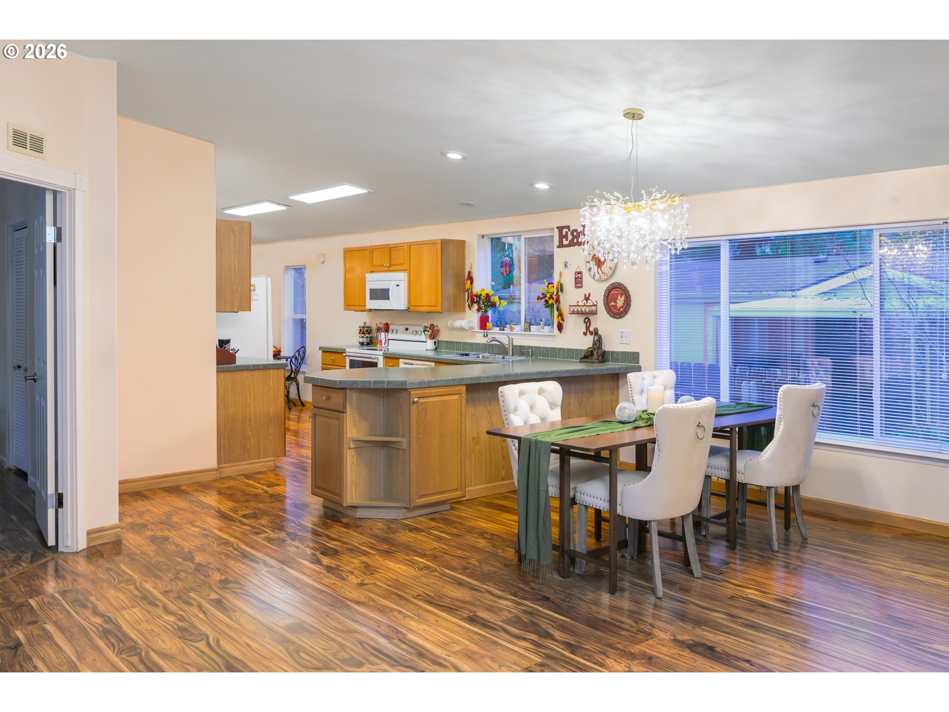 Immaculate home on a corner lot in a desirable 55+ park that is move in ready! The front porch with ramp leads you into the open floor plan of this 1620SF 3bedroom, 2bath home full of natural light with large windows. High quality laminate flooring throughout, primary bathroom with a soaking tub and walk in shower, bonus office space with French doors, a large kitchen and dining area with lots of storage. Outside offers a large covered patio for get-togethers, a shop and a shed, private fenced backyard, as well as space for you four-legged friends! There is a carport as well as ample parking. Fresh interior paint in 2025 and new roof in 2022. Current space rent is $532.00; utilities are separate through the park. Schedule a showing today!