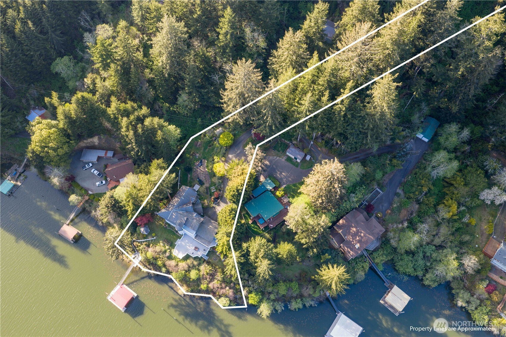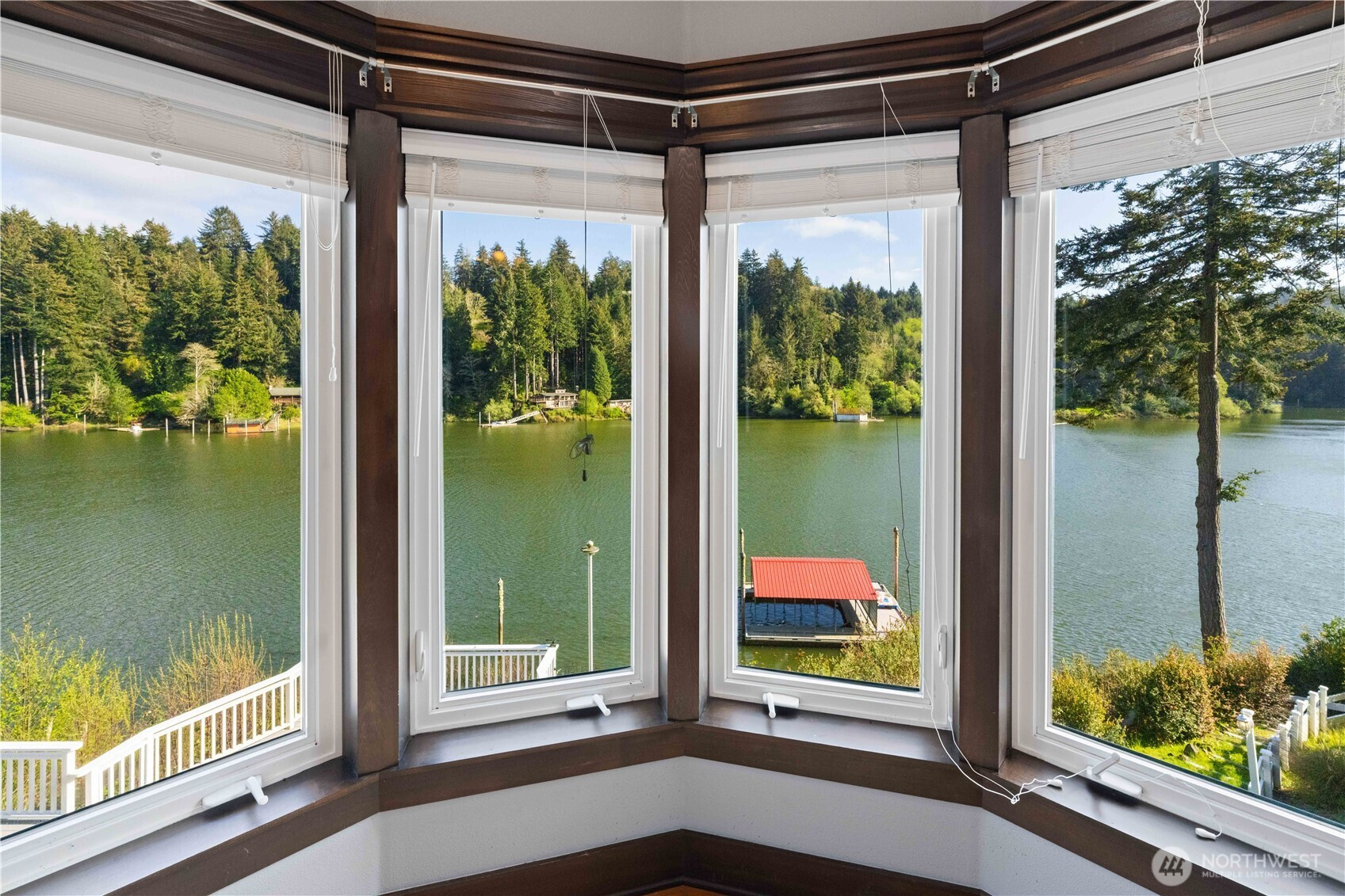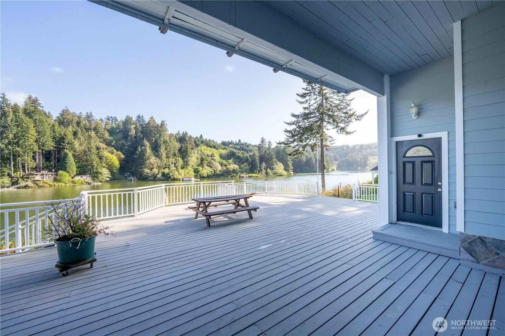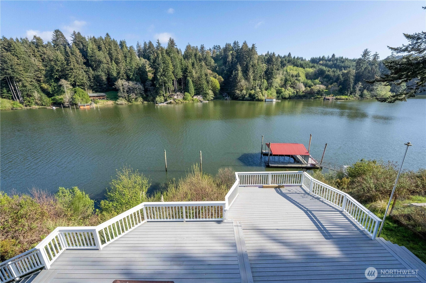 This exceptional lakefront estate blends quality craftsmanship with comfort and versatility, creating a truly unique living experience. A stone entry opens to Myrtlewood floors and Canadian Red Cedar vaulted ceilings that highlight a great room with water views and a fireplace. The kitchen features dual sinks, double ovens, a gas cooktop with pot filler, granite counters, and a pantry. Each bedroom includes a private bath, with heated tile floors adding comfort. Four sitting areas and a centrally located wet bar offer flexible gathering space. Additional features include built-ins, dual laundry areas, a recreation room, generous storage, and a detached ADU with custom bunks. Outside, expansive decks, a gazebo, mature landscaping, fruit trees, and a private pond with fountain enhance the waterfront setting. A 1,000± sq. ft. barn, tool shed with utilities, two-car garage, and covered two-boat slip add convenience. Located near renowned fishing, dining, shopping, dunes, golf, hiking, and crabbing, the property offers both tranquility and adventure. The county has verbally indicated potential vacation rental approval, and a spring water purity test is available.