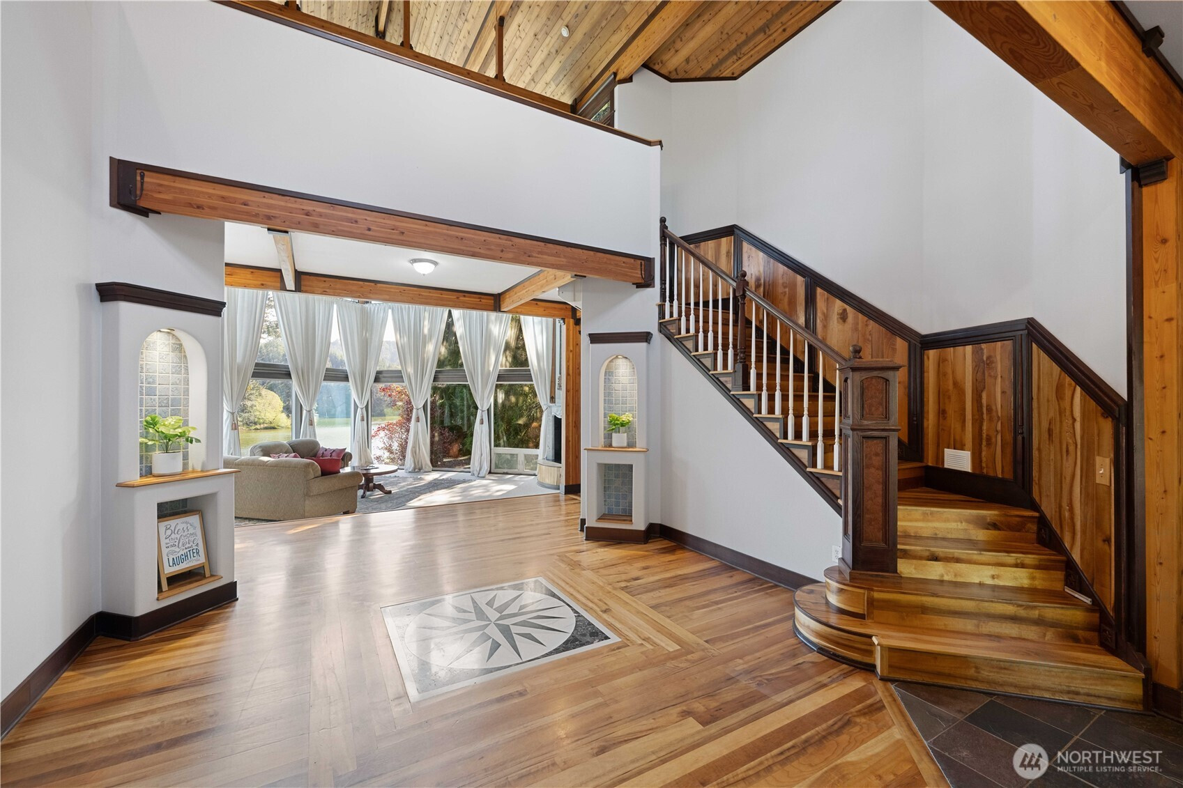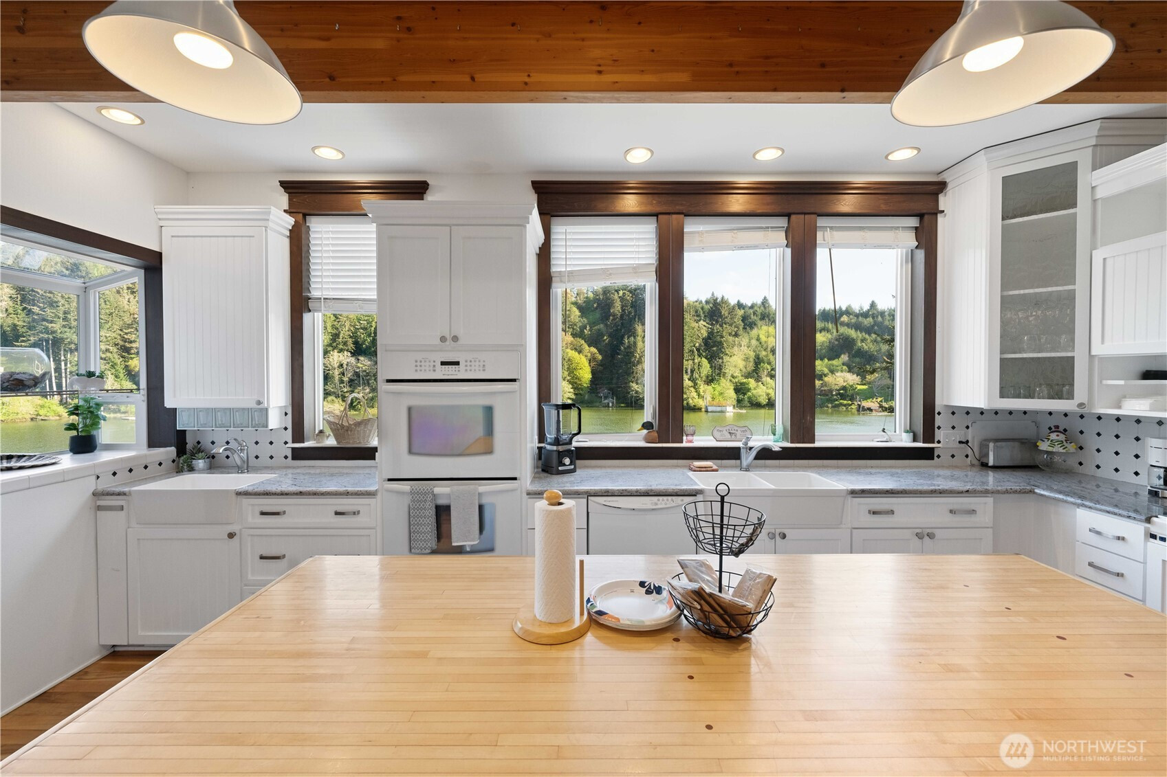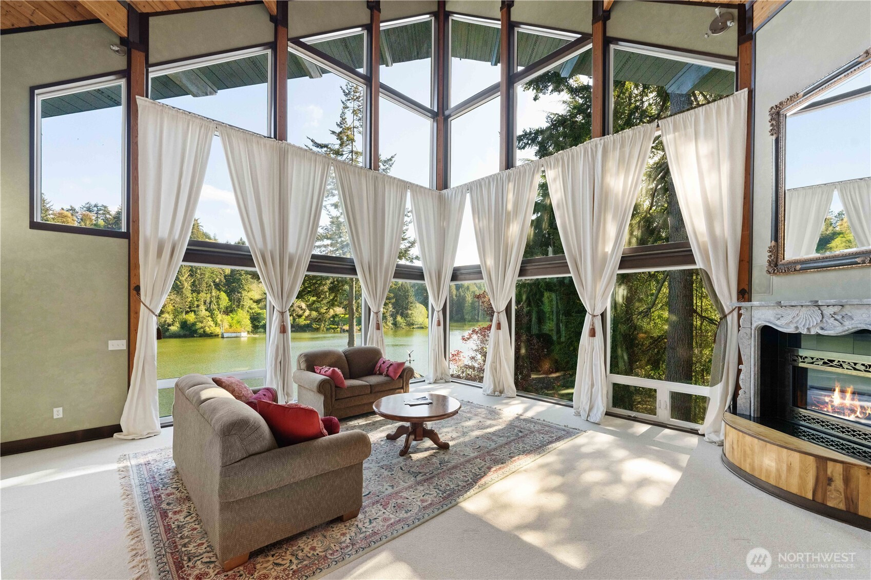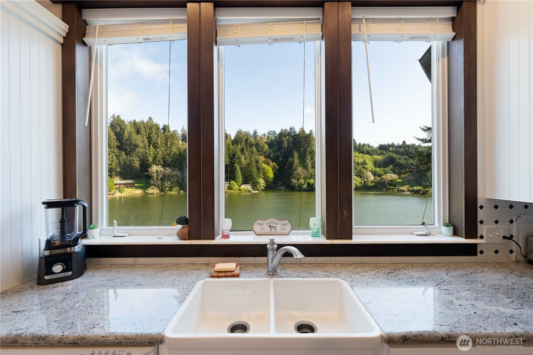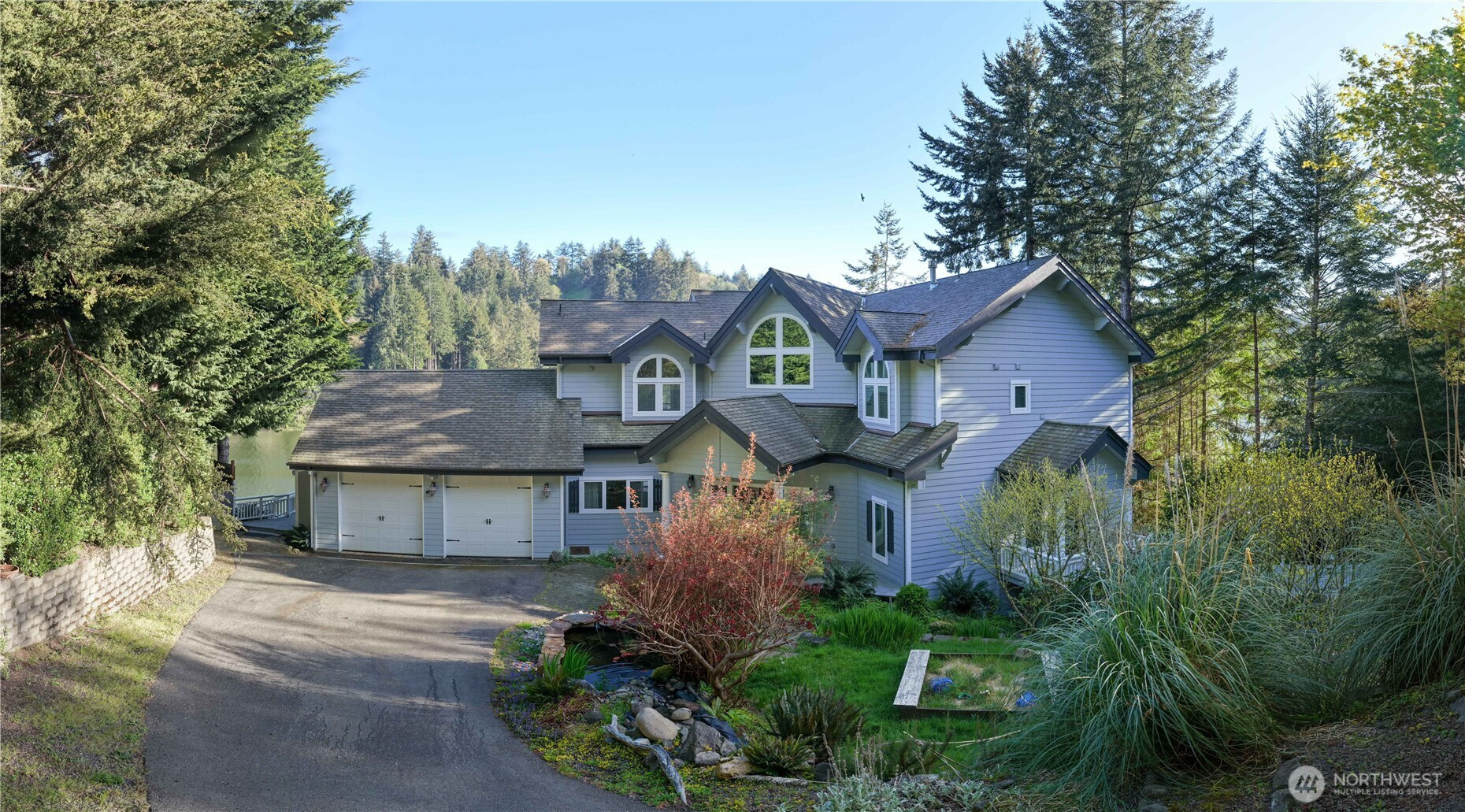 This exceptional lakefront estate blends quality craftsmanship with comfort and versatility, creating a truly unique living experience. A stone entry opens to Myrtlewood floors and Canadian Red Cedar vaulted ceilings that highlight a great room with water views and a fireplace. The kitchen features dual sinks, double ovens, a gas cooktop with pot filler, granite counters, and a pantry. Each bedroom includes a private bath, with heated tile floors adding comfort. Four sitting areas and a centrally located wet bar offer flexible gathering space. Additional features include built-ins, dual laundry areas, a recreation room, generous storage, and a detached ADU with custom bunks. Outside, expansive decks, a gazebo, mature landscaping, fruit trees, and a private pond with fountain enhance the waterfront setting. A 1,000± sq. ft. barn, tool shed with utilities, two-car garage, and covered two-boat slip add convenience. Located near renowned fishing, dining, shopping, dunes, golf, hiking, and crabbing, the property offers both tranquility and adventure. The county has verbally indicated potential vacation rental approval, and a spring water purity test is available.