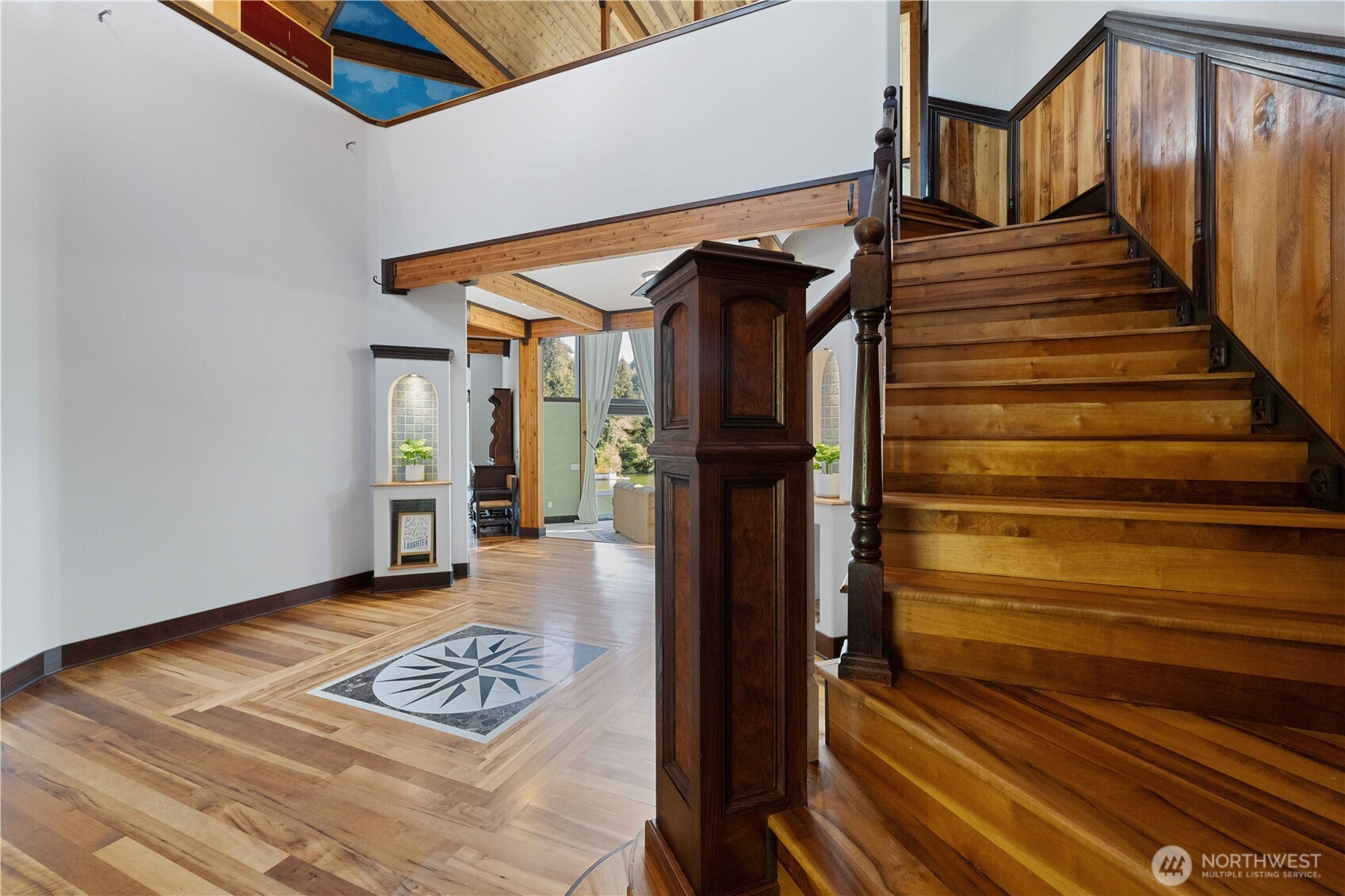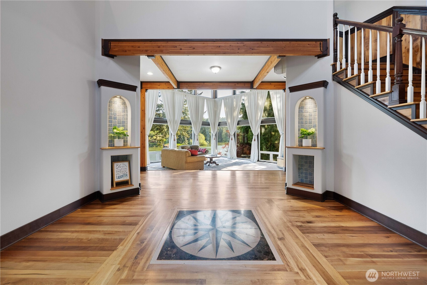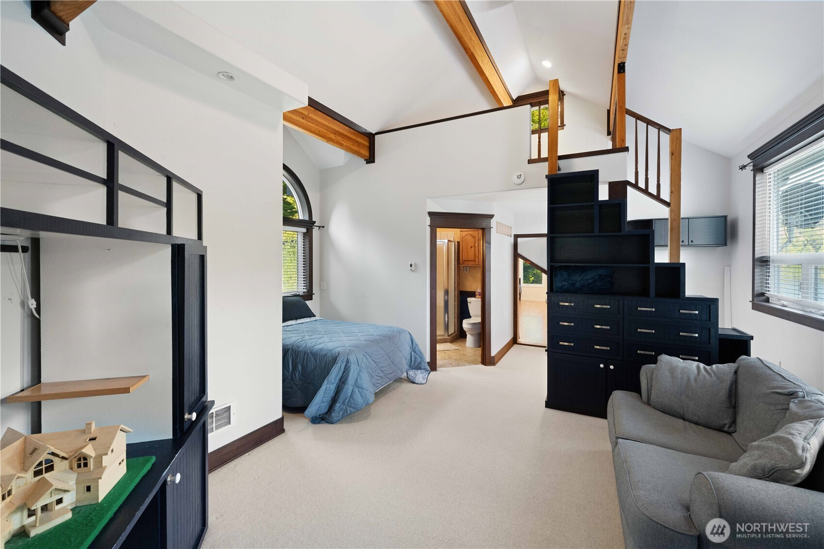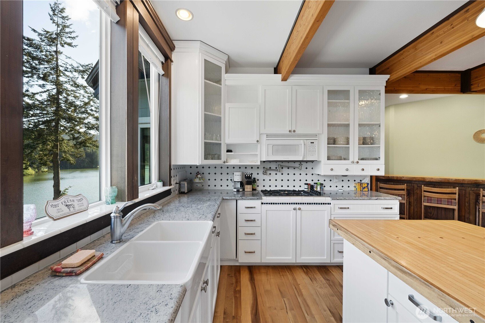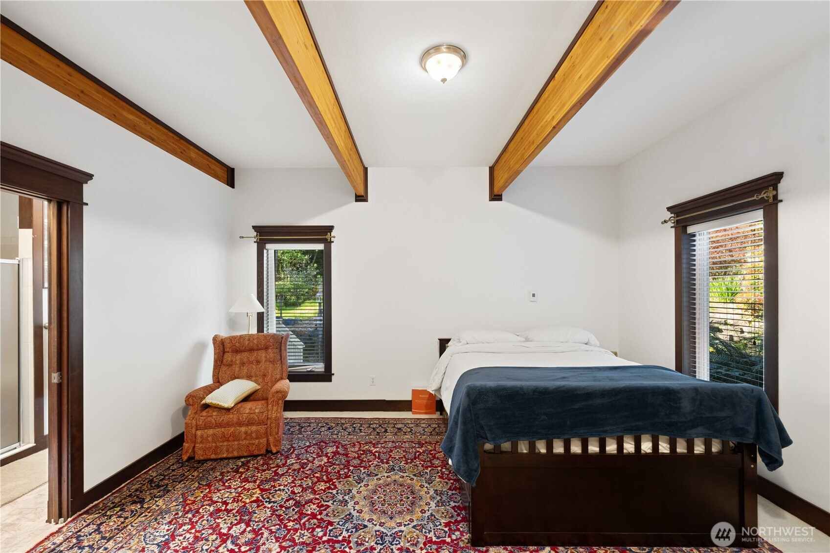 This exceptional lakefront estate blends quality craftsmanship with comfort and versatility, creating a truly unique living experience. A stone entry opens to Myrtlewood floors and Canadian Red Cedar vaulted ceilings that highlight a great room with water views and a fireplace. The kitchen features dual sinks, double ovens, a gas cooktop with pot filler, granite counters, and a pantry. Each bedroom includes a private bath, with heated tile floors adding comfort. Four sitting areas and a centrally located wet bar offer flexible gathering space. Additional features include built-ins, dual laundry areas, a recreation room, generous storage, and a detached ADU with custom bunks. Outside, expansive decks, a gazebo, mature landscaping, fruit trees, and a private pond with fountain enhance the waterfront setting. A 1,000± sq. ft. barn, tool shed with utilities, two-car garage, and covered two-boat slip add convenience. Located near renowned fishing, dining, shopping, dunes, golf, hiking, and crabbing, the property offers both tranquility and adventure. The county has verbally indicated potential vacation rental approval, and a spring water purity test is available.
