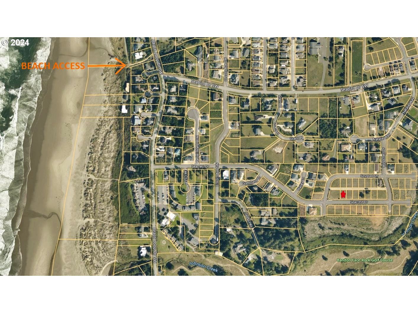 OCEAN TERRACE! Coveted Ocean Terrace lot near Bandon's world class golf & beaches. This elevated lot has some possible distant ocean views with a 2-story home as the neighbor did. Also has some mountain & tree views to the south. All underground city utilities, NO HOA, paved street, garage access from wide paved alley at rear of home in center of the block, site built homes only, 1600 sq. ft. min. including garage & outbuildings, 10 ft front & rear setbacks, surveyed. The alley garage access leaves the front of the house free to be designed without a garage. Homes in this neighborhood have sold for over $900k. Enjoy beach walks, golf, fishing, biking, seafood & fresh, clean ocean air!