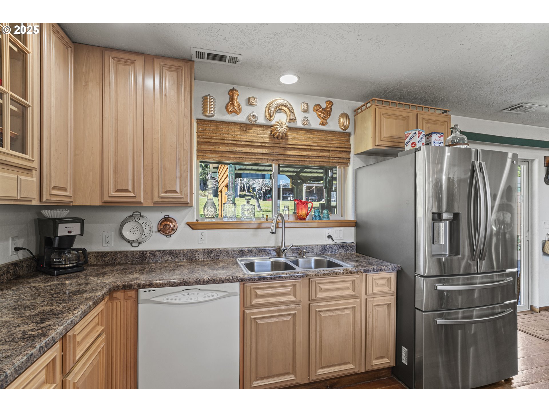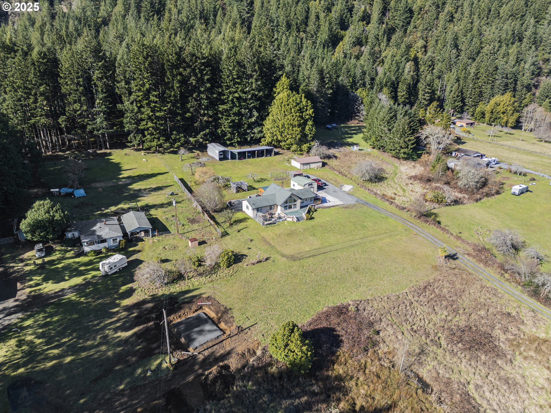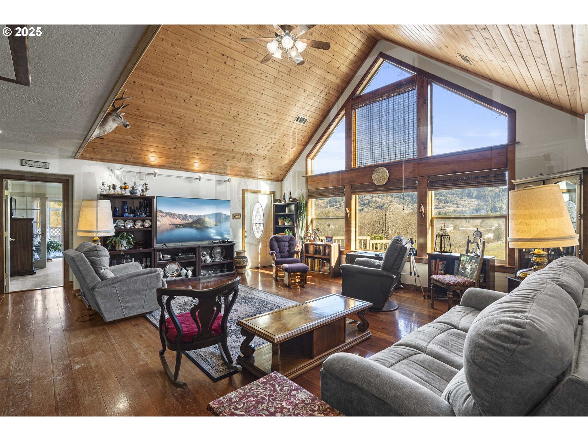 Stunning Country Retreat on 1.41 Acres – Two Tax Lots! Escape to tranquility with this fantastic country home offering breathtaking distant mountain and pond views. Enjoy the outdoors from the expansive front deck or relax in the red cedar gazebo with a luxurious swim spa (16’ x 5’ deep, flow jets, fountains, and lights). The private outdoor space also features a large patio, seating areas, and room for a garden. Inside, the living room showcases vaulted wood ceilings, floor-to-ceiling windows, and hardwood floors, creating a bright and inviting space. The kitchen has formica countertops, an eat-in bar, and custom cabinetry, flowing into the adjacent dining area with a wood-burning stove and sliders to the back deck. The primary suite features private deck access, a spa-like en-suite with double sinks, and French doors leading to a cozy office/reading nook. Two additional bedrooms, a full bathroom, and a laundry room with extra storage and backyard access complete the home. A charming loft space with tongue and groove ceiling and walls is accessible via a trap door in the dining area ceiling. This property is a dream for hobbyists and outdoor enthusiasts with a 1,568 SF machine shop, large detached garage, tool shed, RV/boat carport, and a 4-bay parking shed. Additional amenities include a heat pump for heating and cooling, and security cameras. Just minutes from Powers County Park, where you can enjoy fishing, kayaking, and canoeing on the pond, plus picnic areas for the perfect outdoor getaway.