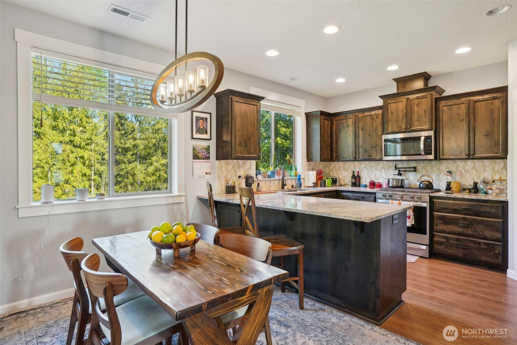 Welcome to one of the most private & desirable homes in Silverlake Village—backing to peaceful greenbelt & a wildlife-filled retention pond-deer, birds, and serene natural views become part of everyday life. This beautifully maintained ranch offers 1,651 sq ft of thoughtfully designed living w/upscale finishes & a flowing open layout. Expansive windows frame tranquil forest views & fill the home w/natural light, creating a seamless connection to the outdoors. The stunning kitchen is the heart of the home, featuring granite countertops, full tile backsplash, SS appliances, gas range with pot filler, & charming custom pantry door. The great room invites relaxation with its floor-to-ceiling stone fireplace, custom built-ins, & inviting atmosphere. Step outside to your covered Trex deck with heater & gas BBQ hookup—perfect for year-round enjoyment. The fully fenced and landscaped backyard offers rare privacy within the community, creating a peaceful retreat with no rear neighbors. The spacious primary suite overlooks the greenbelt & features a walk-in closet, dual sinks, & tiled walk-in shower. Luxury vinyl plank flooring, heat pump with heating & cooling, finished 2-car garage & quality craftsmanship throughout. Located just minutes from Silverlake’s public boat launch, fishing, hiking & year-round recreation, this home offers the ideal blend of modern convenience, low-maintenance living & PNW beauty. Enjoy newer construction, privacy & nature—without the upkeep of acreage.