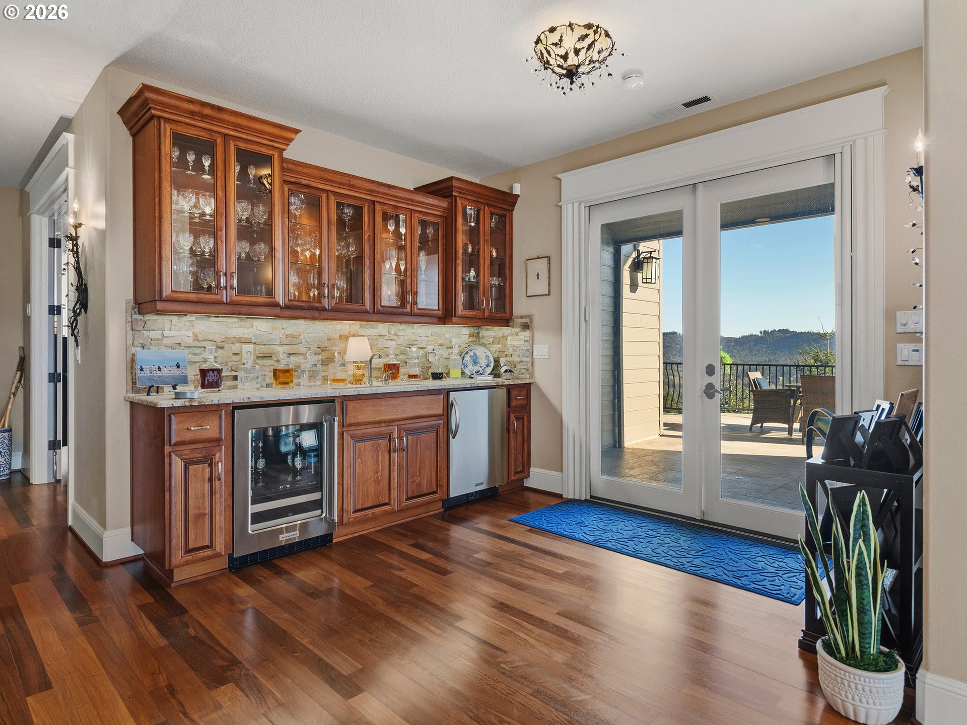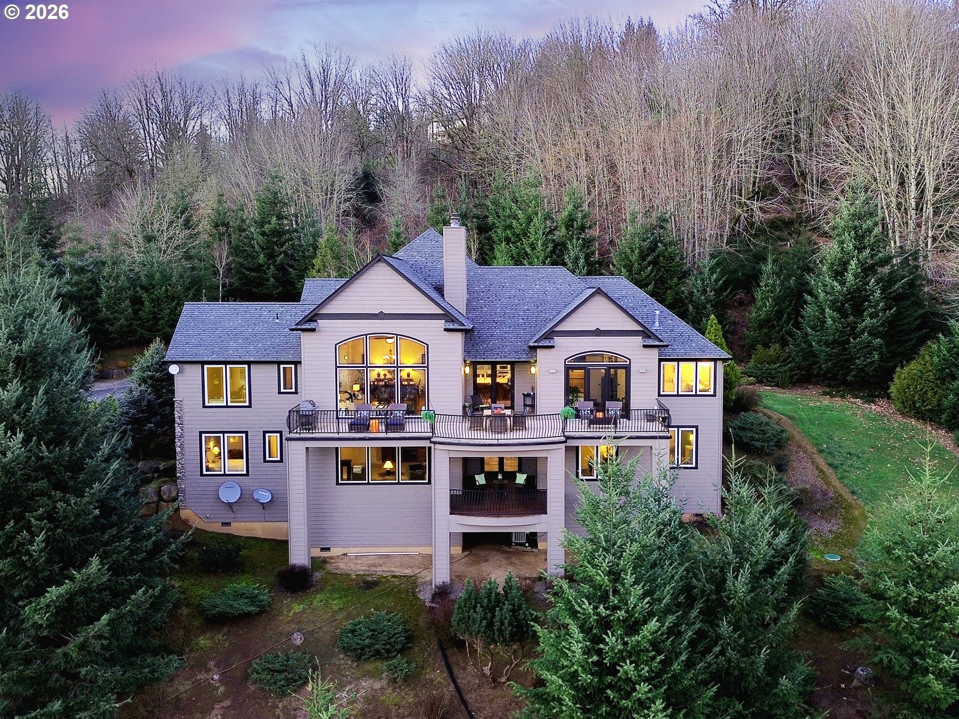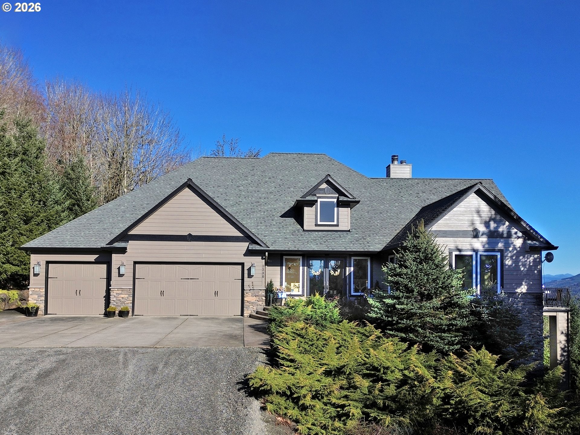 Perched to capture sweeping views from nearly every room, this stunning custom residence delivers an exceptional blend of craftsmanship, and serenity. A grand entry welcomes you with soaring ceilings and luxury hardwood floors that lead gracefully into an elegant formal dining area, perfectly sized for gatherings. The great room exudes warmth with a cozy gas fireplace wrapped in custom granite, crown molding, and beautifully integrated built-ins that elevate the space. The kitchen is a true showpiece, offering double dishwashers, built-in oven, six-burner range with an additional oven, expansive island, massive walk-in pantry, and a wet bar designed for entertaining. The bar features two beverage refrigerators, glass-front cabinetry for display, and sink that doubles as an ice well. The main-level primary suite is a private retreat, anchored by a double-sided fireplace and framed by breathtaking views. The ensuite invites relaxation with a large temperature-controlled jetted tub, spacious walk-in shower, and refined finishes throughout. The daylight basement is an entertainer’s dream, featuring a state-of-the-art home theater, family room, kitchenette, and 3 additional bedrooms and ensuites. Direct access to the lower patio creates seamless indoor-outdoor living. The property is equally impressive outdoors, offering RV parking with hookups, and a massive five-car garage. The panoramic vistas stretch across PDX, Lewis River, and mountains. A must-see!