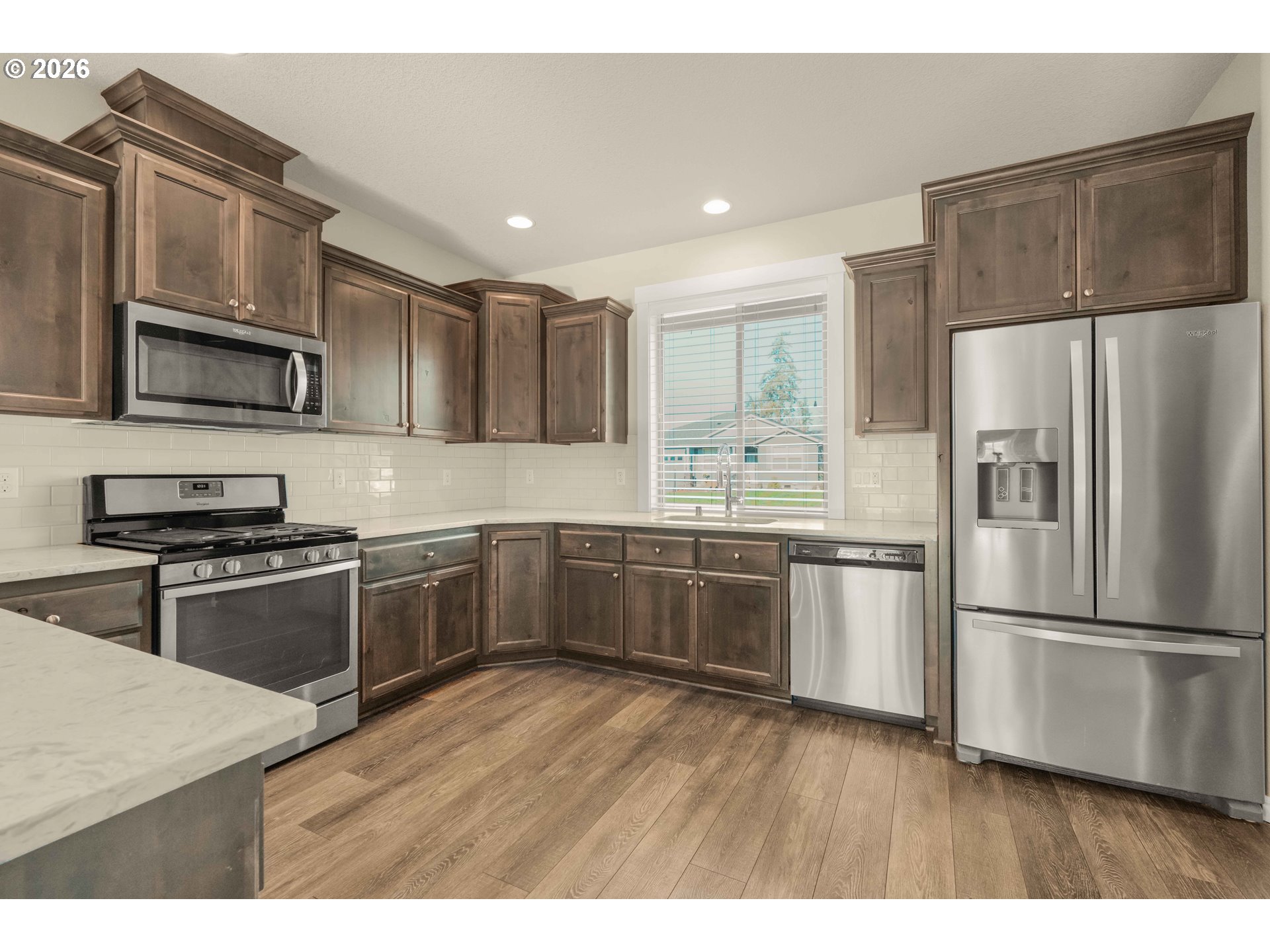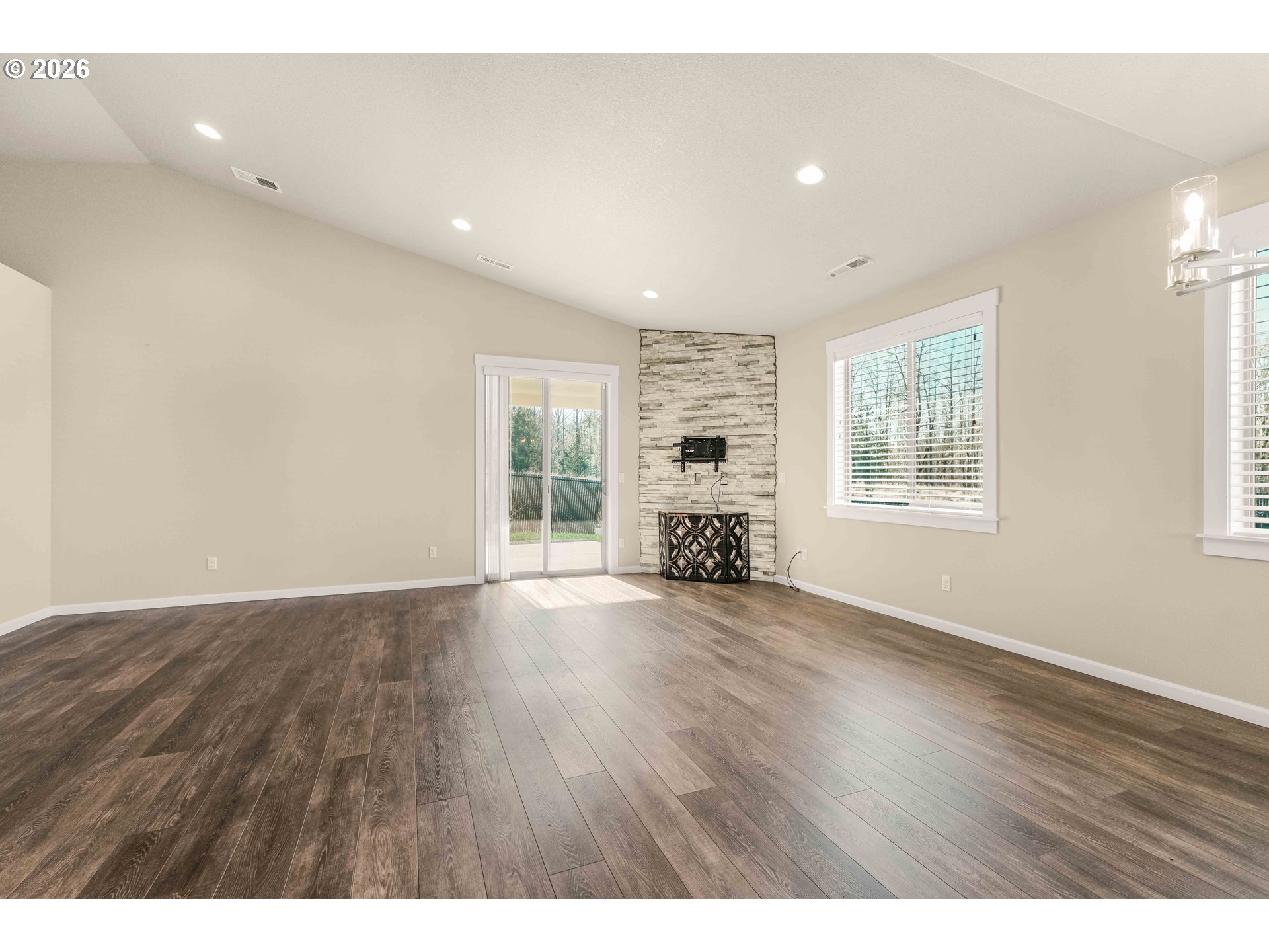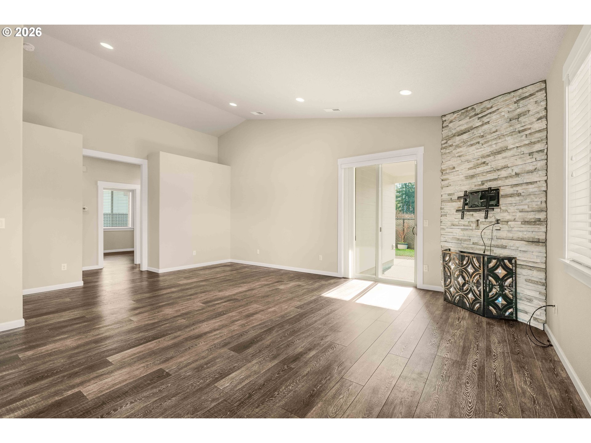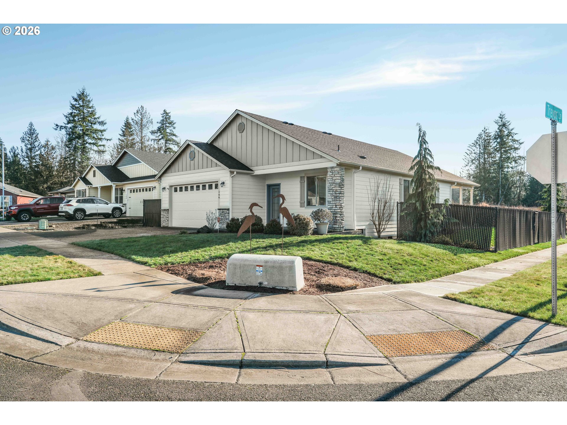 Move-in ready and thoughtfully designed, this 2017-built home offers modern finishes, functional space, and effortless livability. Featuring 3 bedrooms and 3 bathrooms, the open layout is filled with natural light and enhanced by vaulted ceilings and durable LVP flooring throughout the main living areas. The kitchen is well-appointed with quartz countertops, stainless steel appliances, an eat-in bar, pantry, and excellent flow into the dining and living spaces—ideal for everyday living and entertaining.The living room centers around a striking floor-to-ceiling stone fireplace and opens to the fully fenced backyard through sliding glass doors, creating a seamless indoor-outdoor connection. Enjoy a covered patio, additional open patio space, RV parking, and a tool shed—perfect for storage, hobbies, or outdoor enjoyment.The primary suite features vaulted ceilings, abundant natural light, a walk-in closet, and a private bath with double sinks, tile flooring, and a beautifully tiled walk-in shower. Two additional bedrooms offer good closet space and natural light. A large laundry room with built-in storage adds convenience and functionality. A desirable corner lot home with modern finishes, appealing outdoor spaces, and turnkey readiness