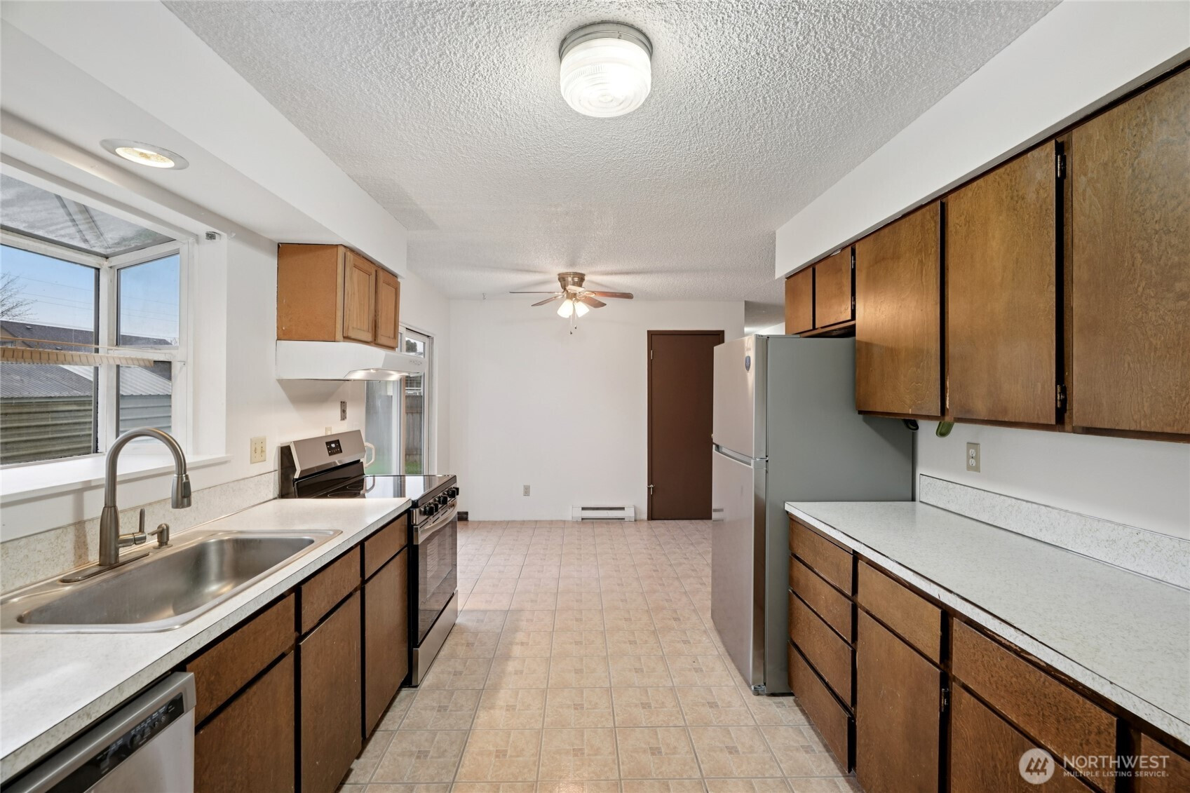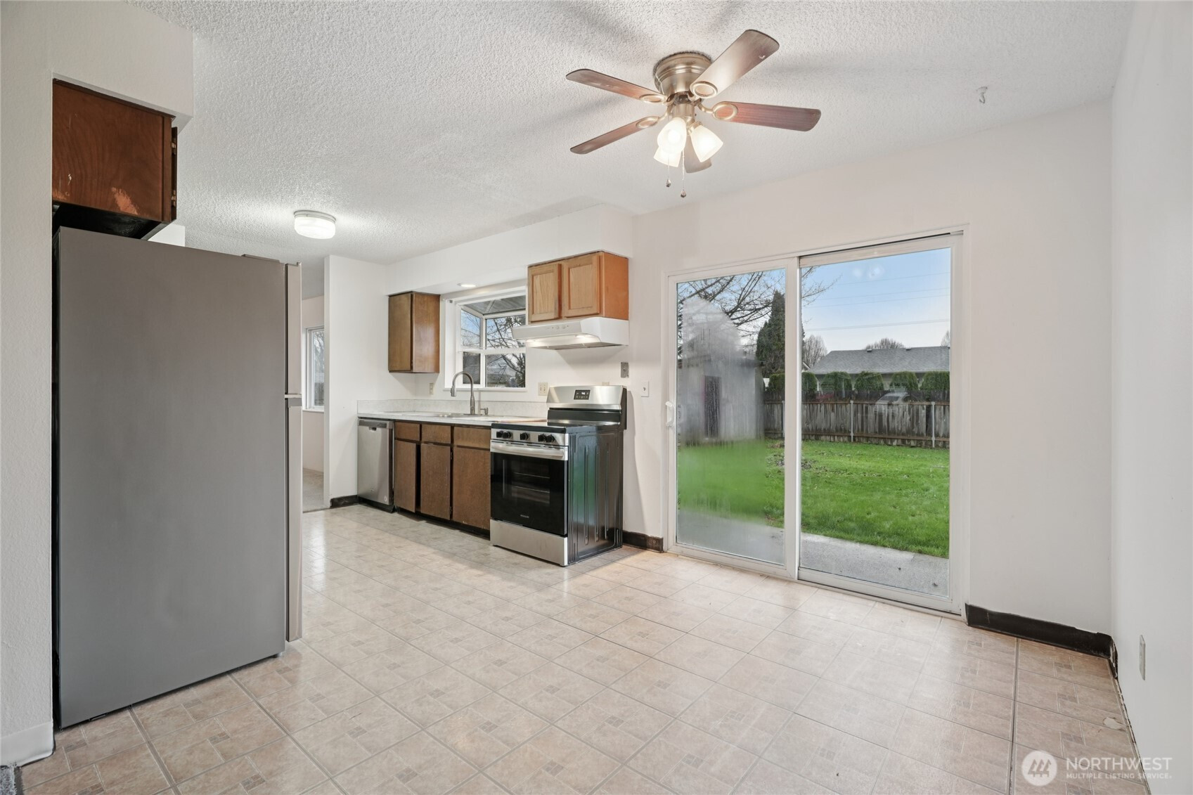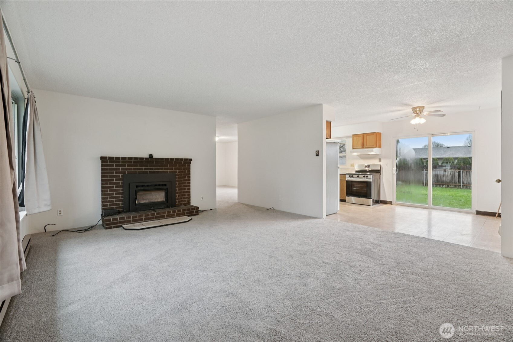 Super cute and exceptionally clean 3-bedroom, 1.75-bath home in the heart of Longview. This well-maintained home features a newer roof, woodstove that heats the entire home & hot water heater, fresh interior paint and brand-new carpet. The welcoming floor plan offers a spacious living room centered around the cozy woodstove. Generously sized kitchen opens to an attached dining area & slider to backyard. Huge family room off kitchen provides flexible space for gatherings, home office or playroom. Back of the home offers privacy w/a primary bedroom & 1.75 bath, plus two additional bedrooms and a full bath. Outside, enjoy a large fully fenced backyard w/room for gardening, pets & outdoor activities, complete with fruit trees & a greenhouse.