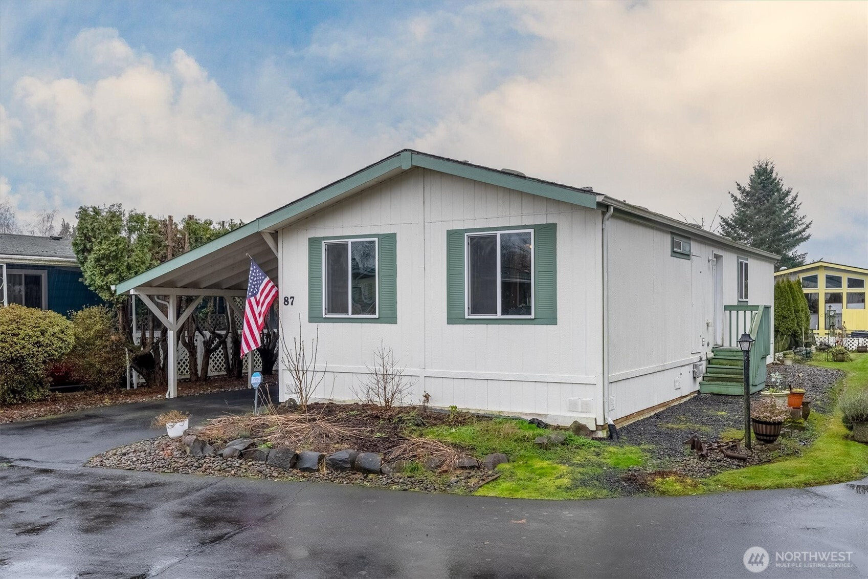 Nice 3 bedroom 2 full bath home in TimWa 55+ manufactured home park. Primary has an attached full bathroom with a large closet. Kitchen comes with stove and dishwasher. Washer/Dryer included. 2 additional bedrooms and another full size bathroom with a vaulted spacious living room and dining area round out this clean and move in ready home. Newer laminate wood floors and neutral paint colors will make for a calm and peaceful home. The yard has a tool shed and a covered carport.