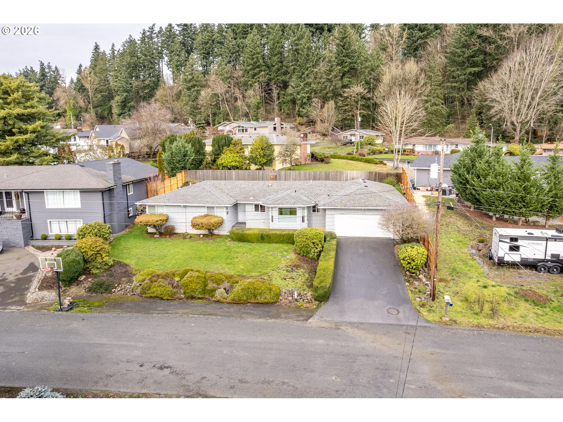 One level home located on a quiet dead end street in the desirable Cascade Way neighborhood. 4 Bedroom, 1.75 bath home. Living room with wood burning fireplace, Family room with woodstove plus a rec room with a pool table. Kitchen with wall oven, cooktop and dining area. Primary bedroom has 2 closets- one a walk in. Sewer line was replaced in 2005. It appears there are hardwoods under the carpets. Large private fenced lot. Double car garage. Walking distance to schools, restaurants and shopping.