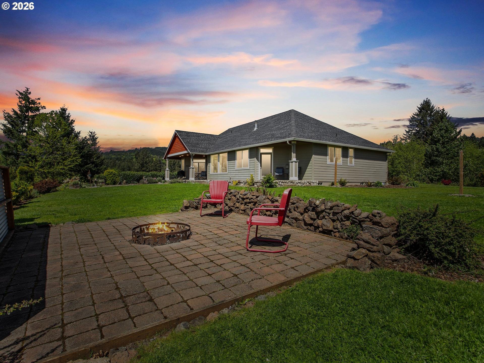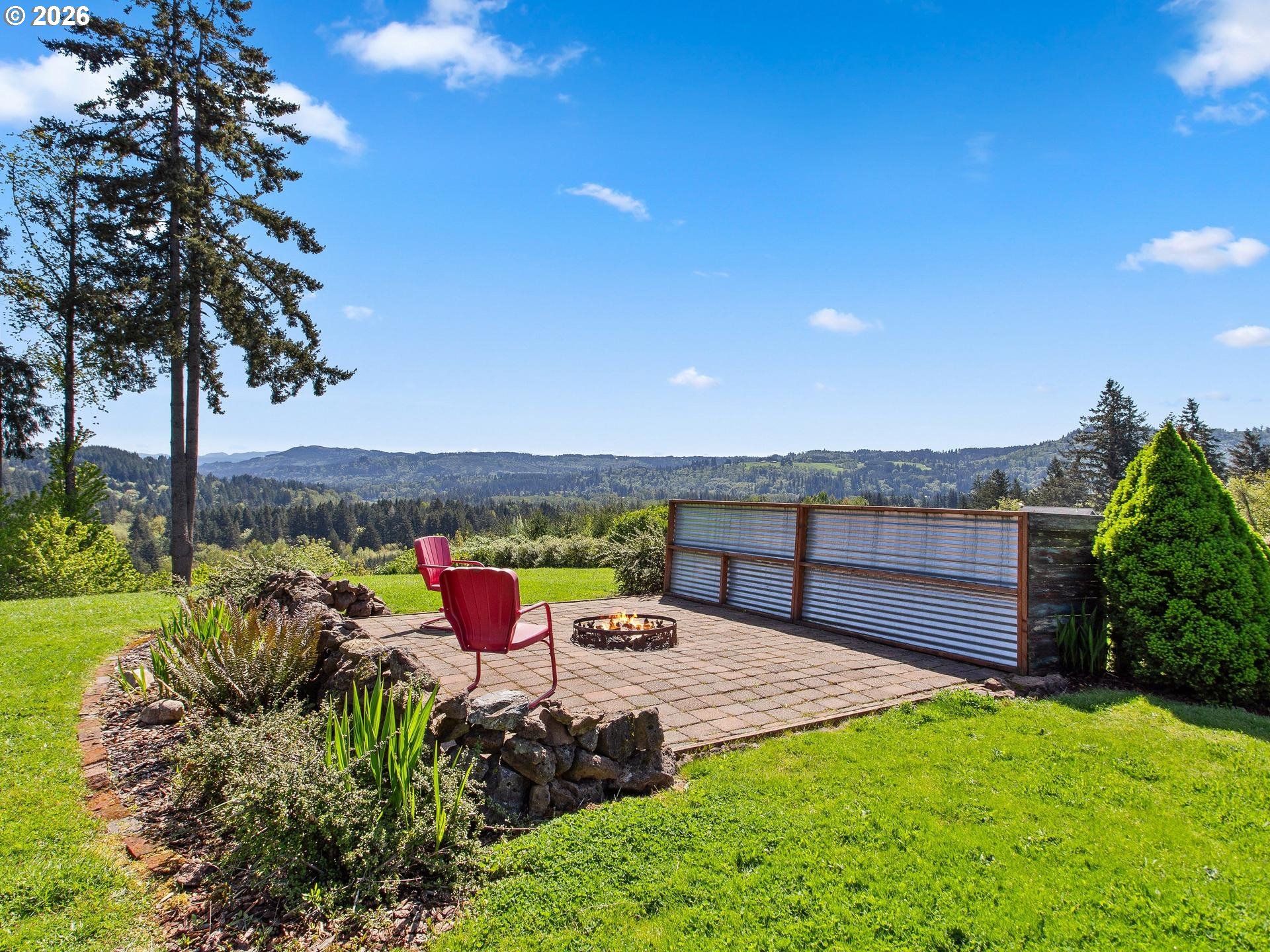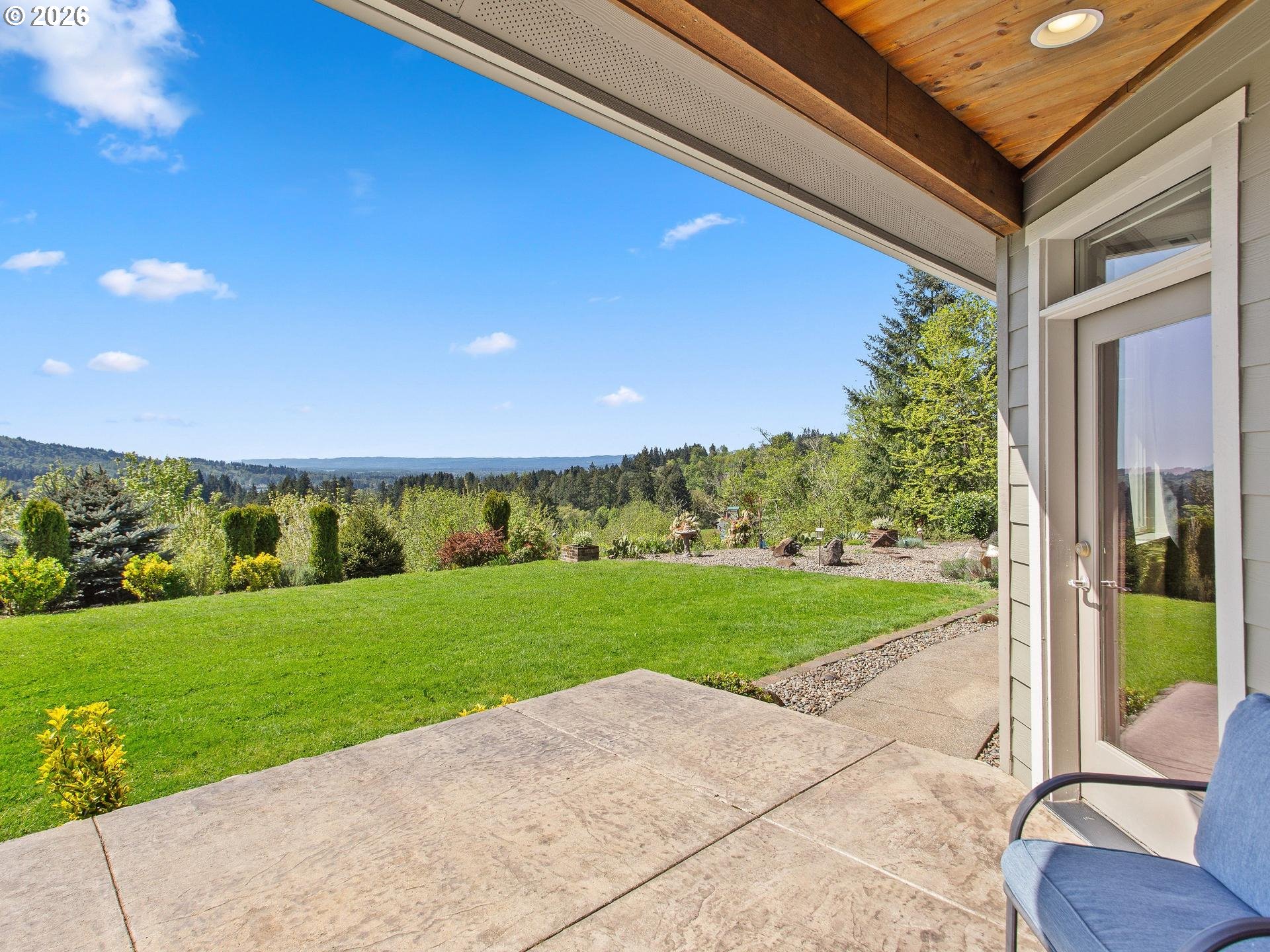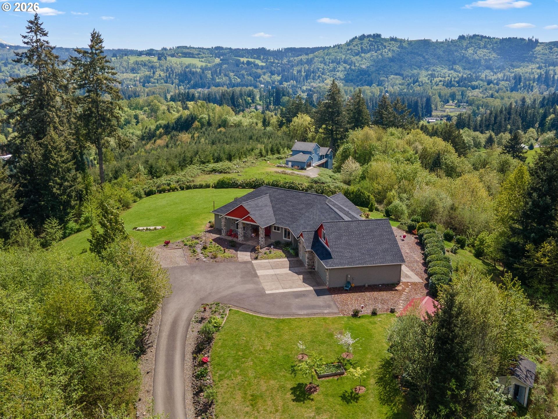 Perched in a truly breathtaking one of a kind setting, this exceptional Woodland home offers panoramic views that include The Valley, Mt. Hood, The City Lights, The Lewis River, and The Columbia River—creating a daily backdrop that feels nothing short of extraordinary. The Sunsets AND Sunrises will leave you breathless. It's a million dollar view with fruit trees and a strawberry patch. Every window has a view. From soaring Bald Eagles to Osprey, Hawks and Deer, the surrounding wildlife adds to the serenity and natural beauty of this one-of-a-kind fully fenced property. Inside, rich Brazilian Cherry hardwood floors with elegant maple inlay flow seamlessly throughout the home, setting a warm and refined tone that match the elevated ceilings. The chef’s kitchen is designed to impress, featuring granite countertops, stainless steel appliances, a spacious cook island perfect for entertaining, custom shelving, built-in features, and abundant storage. The luxurious primary suite is a private retreat, complete with direct outdoor access, a romantic Fireplace and a spa-inspired bathroom offering a steam shower, jetted soaking tub, tile flooring, double vanity with granite countertops, and an expansive walk-in closet that deserves it's own Zip Code. Additional features include a dedicated den with French doors, two oversized bedrooms, and an upstairs bonus room with its own bathroom—ideal for guests or flexible living space. A new roof (2025) and new shed add value and peace of mind, while the private drive enhances the sense of seclusion. Car enthusiasts and hobbyists will appreciate the oversized, extra-deep 3-car garage with ample storage. This is a rare opportunity to own a home where luxury, comfort, and unforgettable views come together in perfect harmony.