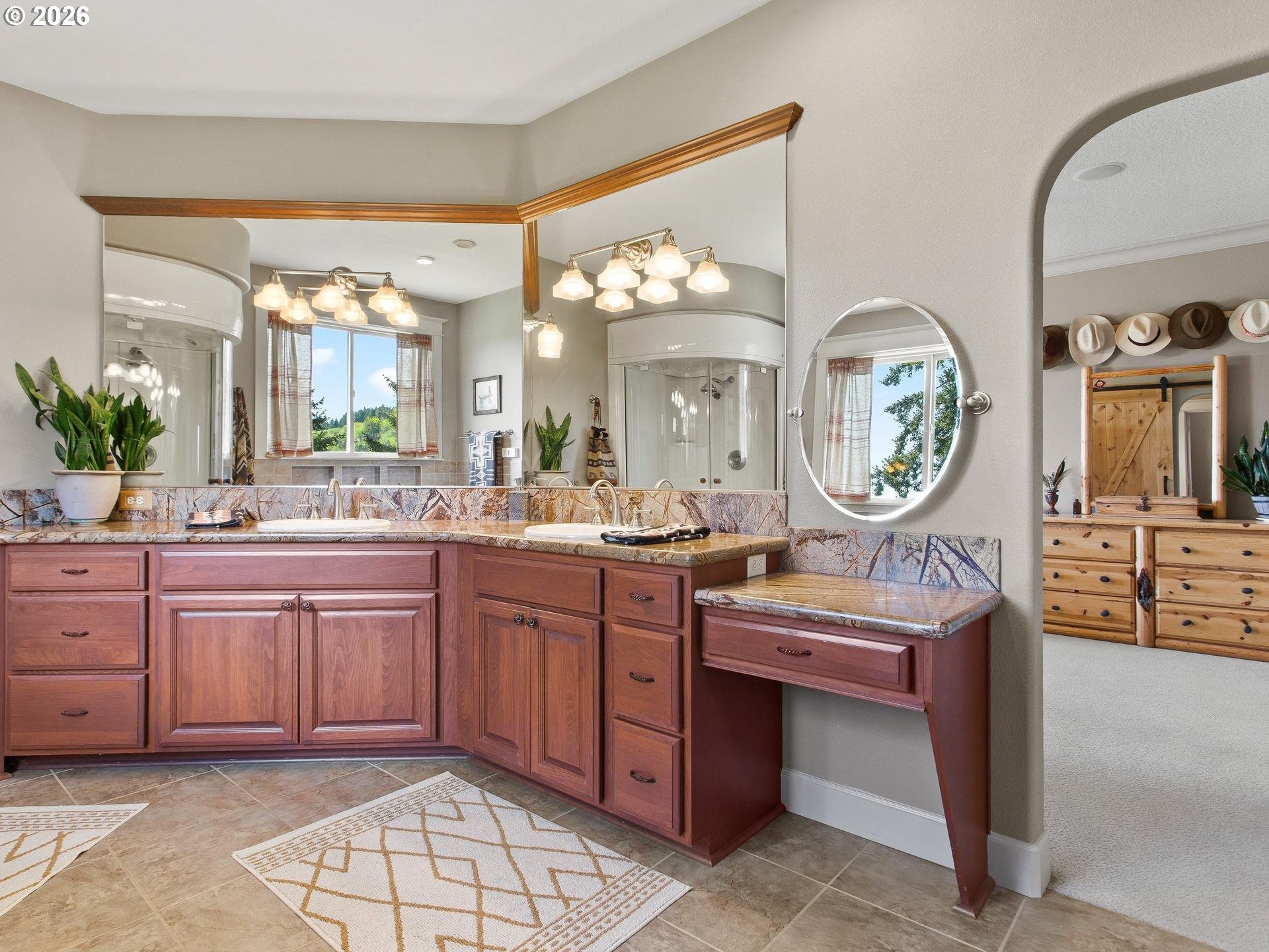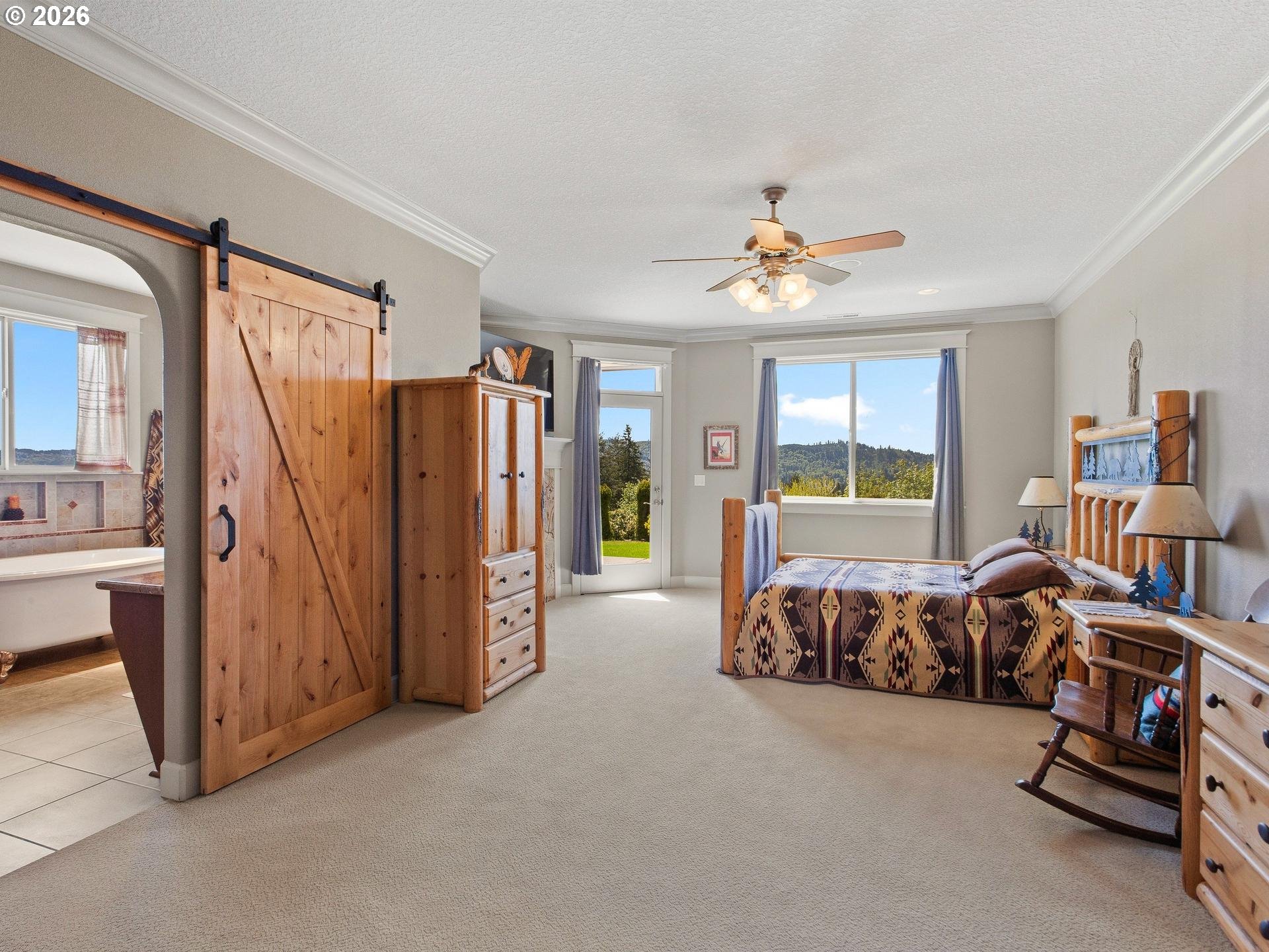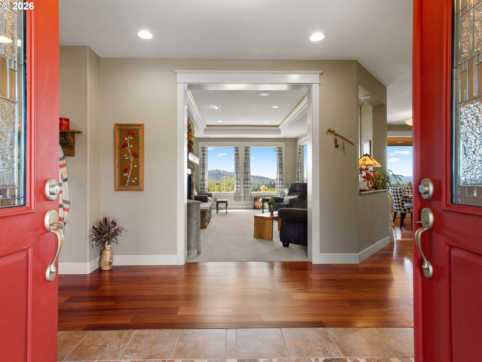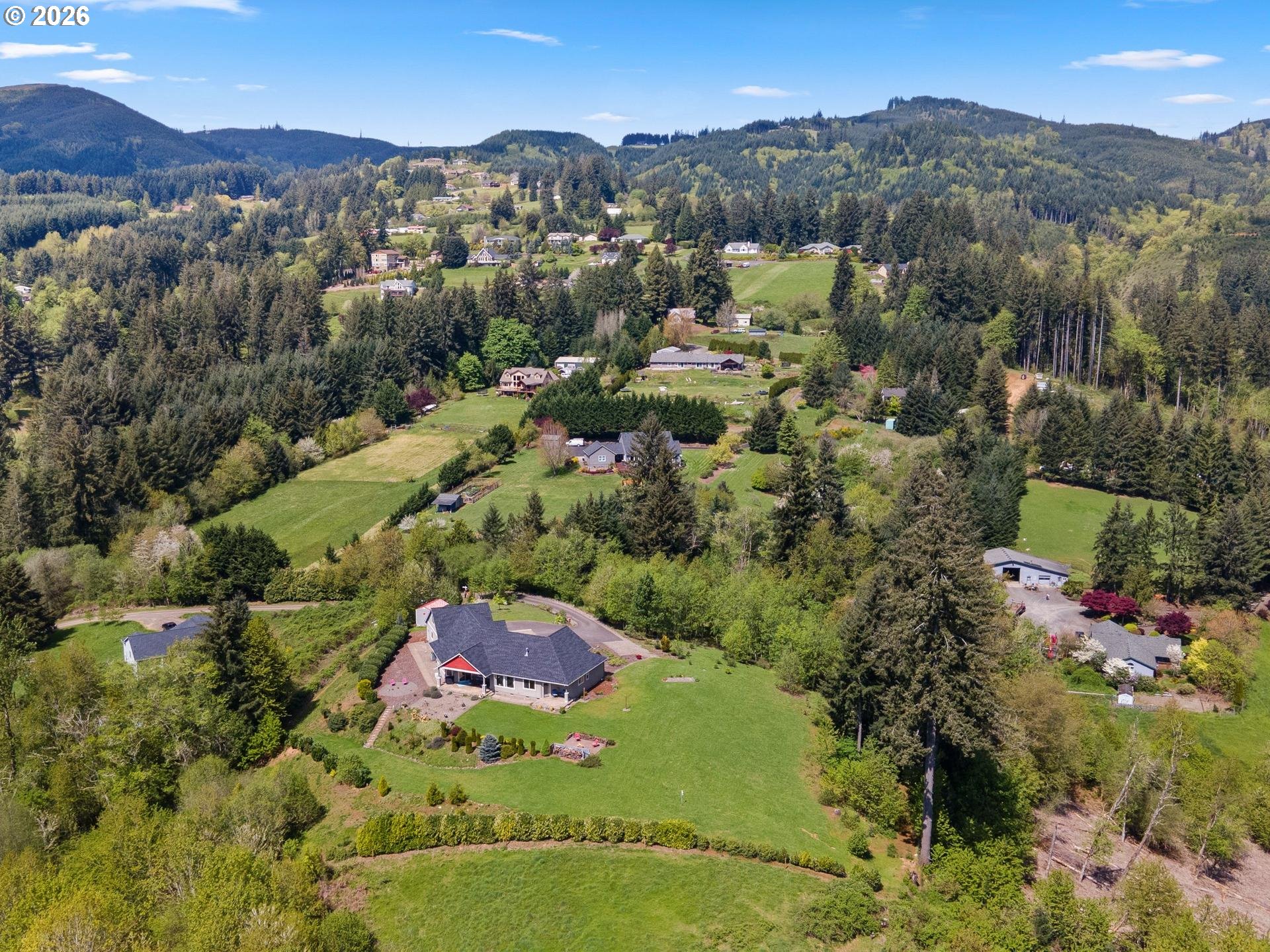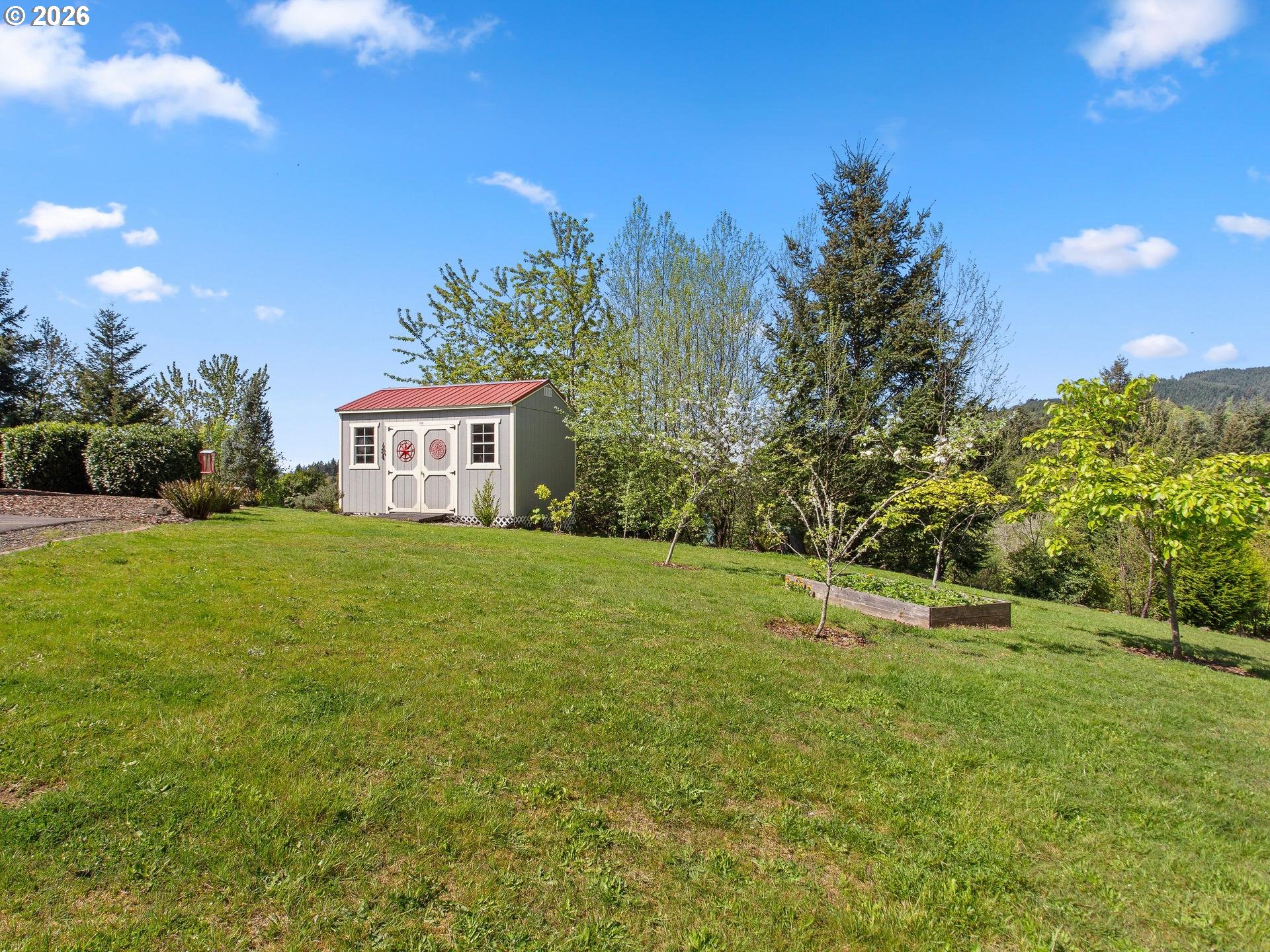 Perched in a truly breathtaking one of a kind setting, this exceptional Woodland home offers panoramic views that include The Valley, Mt. Hood, The City Lights, The Lewis River, and The Columbia River—creating a daily backdrop that feels nothing short of extraordinary. The Sunsets AND Sunrises will leave you breathless. It's a million dollar view with fruit trees and a strawberry patch. Every window has a view. From soaring Bald Eagles to Osprey, Hawks and Deer, the surrounding wildlife adds to the serenity and natural beauty of this one-of-a-kind fully fenced property. Inside, rich Brazilian Cherry hardwood floors with elegant maple inlay flow seamlessly throughout the home, setting a warm and refined tone that match the elevated ceilings. The chef’s kitchen is designed to impress, featuring granite countertops, stainless steel appliances, a spacious cook island perfect for entertaining, custom shelving, built-in features, and abundant storage. The luxurious primary suite is a private retreat, complete with direct outdoor access, a romantic Fireplace and a spa-inspired bathroom offering a steam shower, jetted soaking tub, tile flooring, double vanity with granite countertops, and an expansive walk-in closet that deserves it's own Zip Code. Additional features include a dedicated den with French doors, two oversized bedrooms, and an upstairs bonus room with its own bathroom—ideal for guests or flexible living space. A new roof (2025) and new shed add value and peace of mind, while the private drive enhances the sense of seclusion. Car enthusiasts and hobbyists will appreciate the oversized, extra-deep 3-car garage with ample storage. This is a rare opportunity to own a home where luxury, comfort, and unforgettable views come together in perfect harmony.