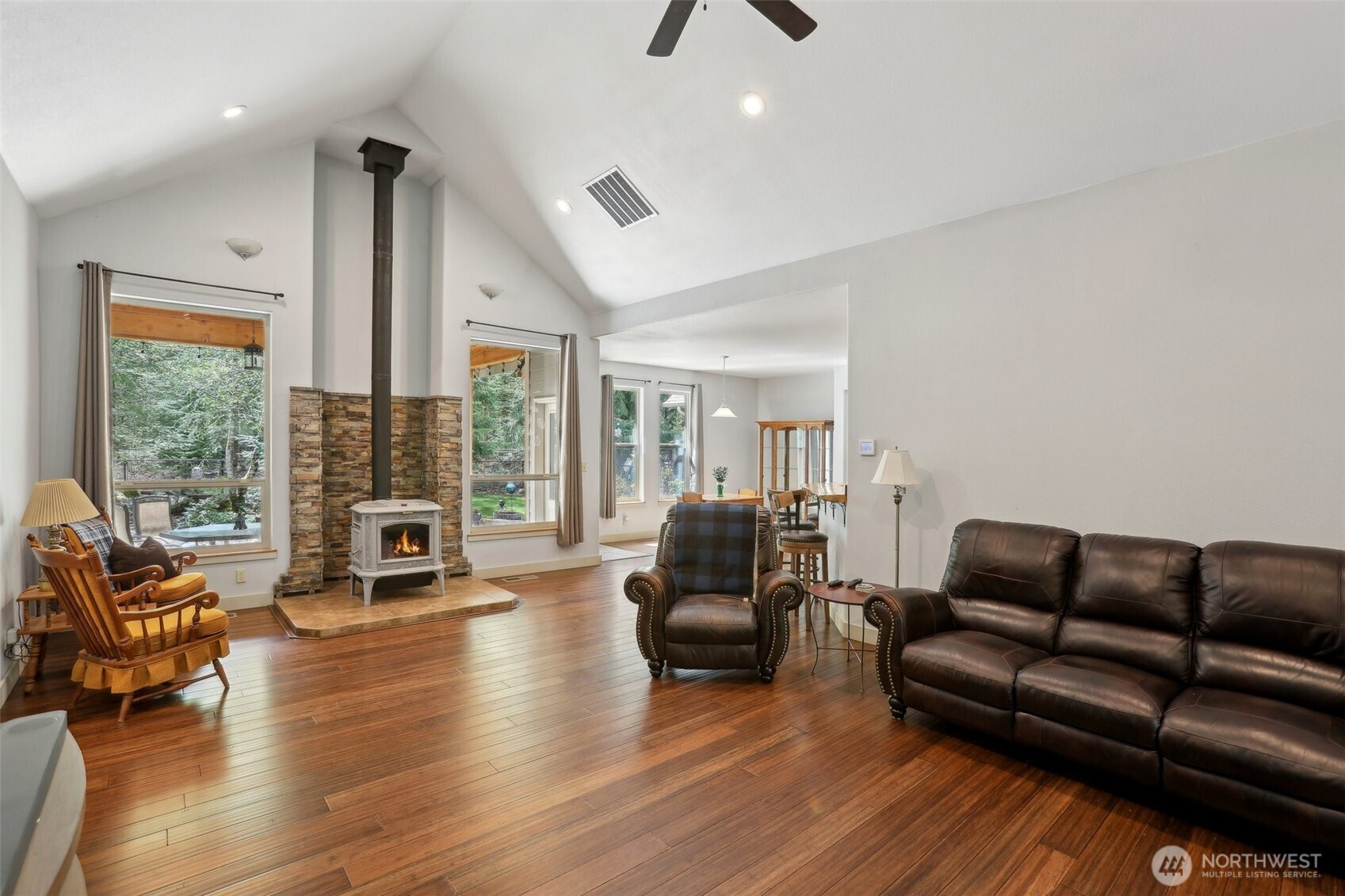 Secluded home with main floor living in scenic Toutle on South Fork Toutle River with access via common area and includes use of the picnic shelter. The property is backed by Weyerhaeuser land. 3 possible 4-bed or bonus room, 2.5 bath with office, and storage area: gated entry, vaulted ceilings, stranded bamboo floor. Features walk-in closet, a large pantry, and a cozy soapstone woodstove. Enjoy wooded territorial views from your large windows. plenty of room in your attached 3-car garage, detached 2-car garage, shop/outbuilding, fenced yard, garden space, and patio. Traditional design offers comfort and privacy with space to relax, entertain, or explore nature. A rare opportunity to own a peaceful retreat with modern conveniences in the Pacific Northwest.