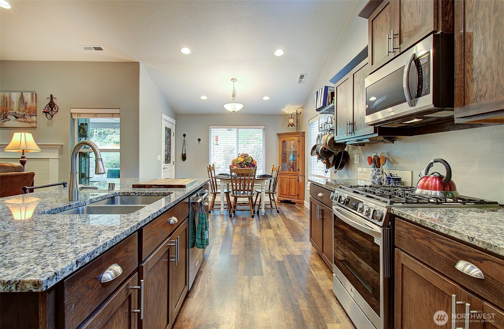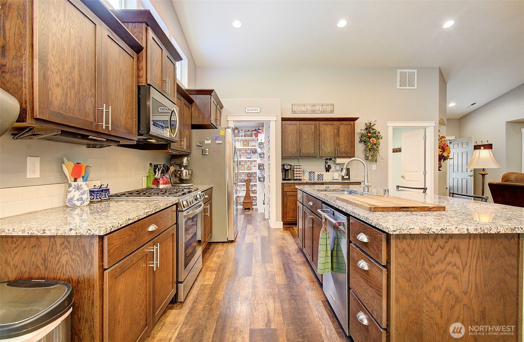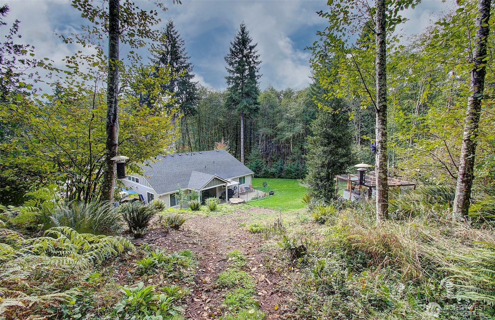 Come and see this beautiful sprawling 3 bedroom ranch home with a den situated on a generous 5+ acre wooded lot in a private gated community. Serene location with an abundance of wildlife. This well maintained, thoughtfully designed home offers space, comfort and charm in every corner. Enjoy a well-landscaped yard filled with perennials and an irrigation system already in place. Take a walk or a 4-wheeler ride on the private trails that wind throughout the property. Property already has a cleared area just waiting for an outbuilding or pole barn if you’d like to expand and another cleared area for an additional garden. Natural light floods the family room with its vaulted ceiling, gas fireplace, and beautiful LVP flooring throughout. The large granite island in the kitchen is perfect for gatherings or baking your favorite holiday treats. The well designed custom butlers pantry features soft close cabinets with a butcher block counter top and an abundance of storage space. The dining room leads out to a covered porch and a large yard with mature trees and landscaping with an abundance of perennials including roses, peonies, and azaleas.