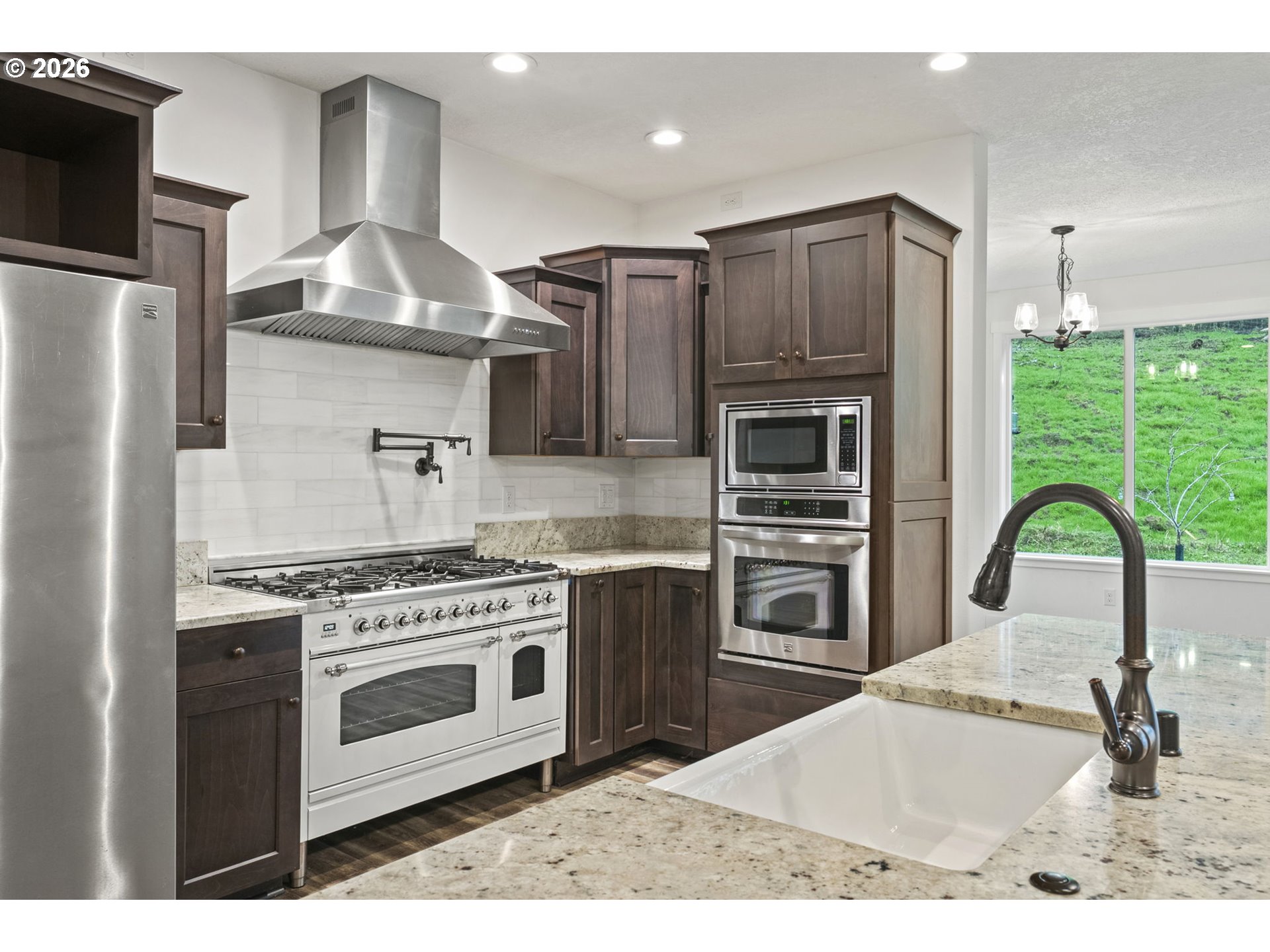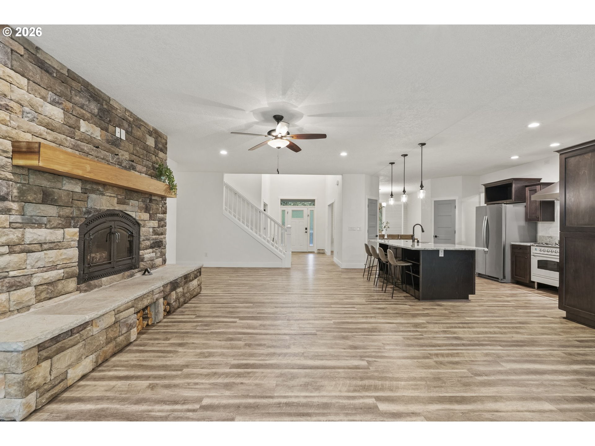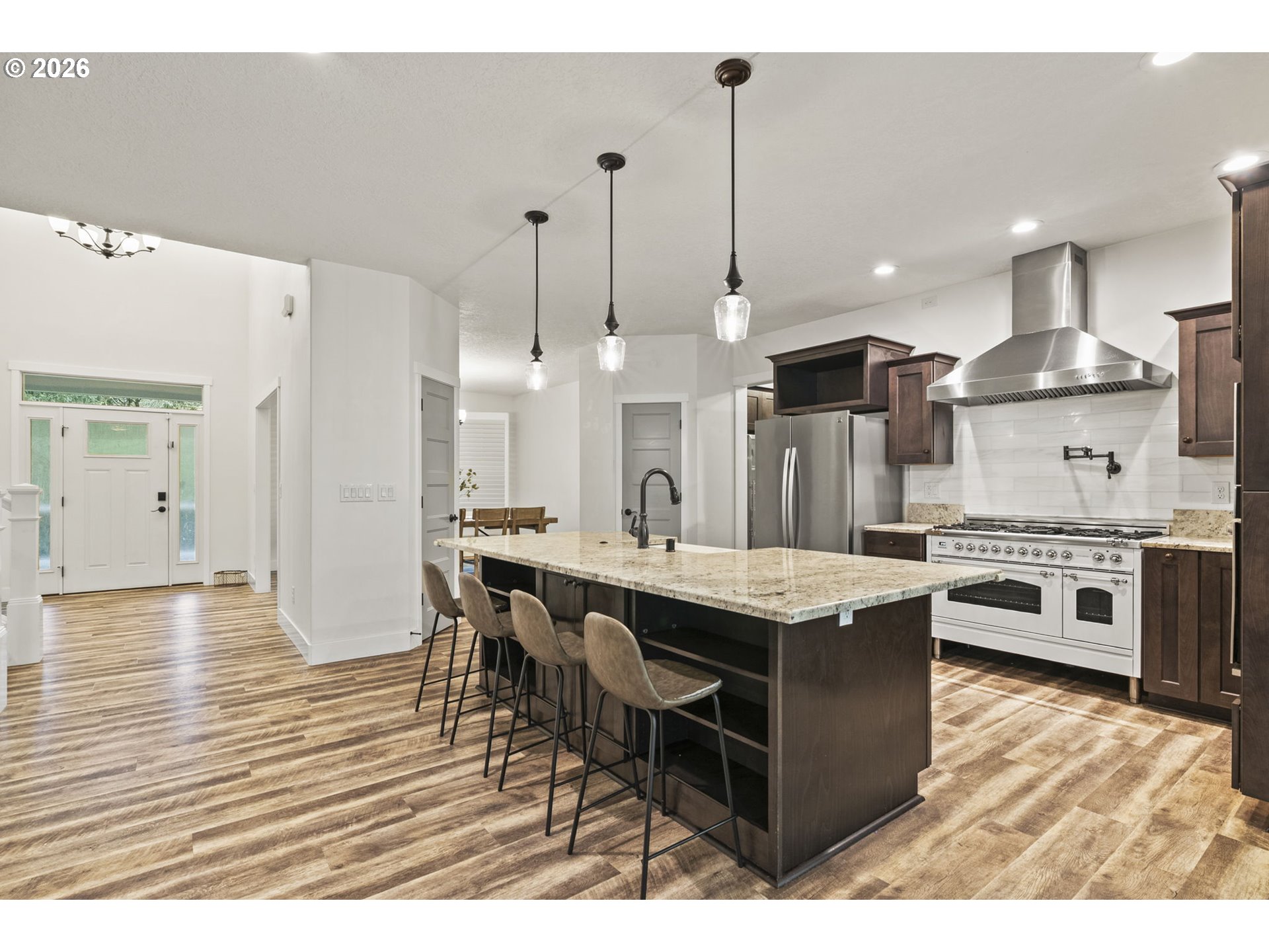This secluded rural retreat offers privacy and self-sufficient living on 6.5 acres with a year-round creek, campsite, fruit orchard, and garden areas. A gorgeous newer 2-story, 4,970 sq ft home with walkout basement features a MOVIE THEATER, 4 bedrooms including two primary suites (one on the main level) 4.25 baths. The home includes a chef’s kitchen with granite throughout, stainless steel appliances, imported Italian stove, butler’s pantry, formal dining, office, family room, breakfast nook, mudroom, shutters, and two laundry rooms. Wired for a standby generator with a 1,000-gallon backup water storage tank and upgraded water treatment system. Large shop, 3-car garage, hot tub, and countless upgrades make this an exceptional private estate.