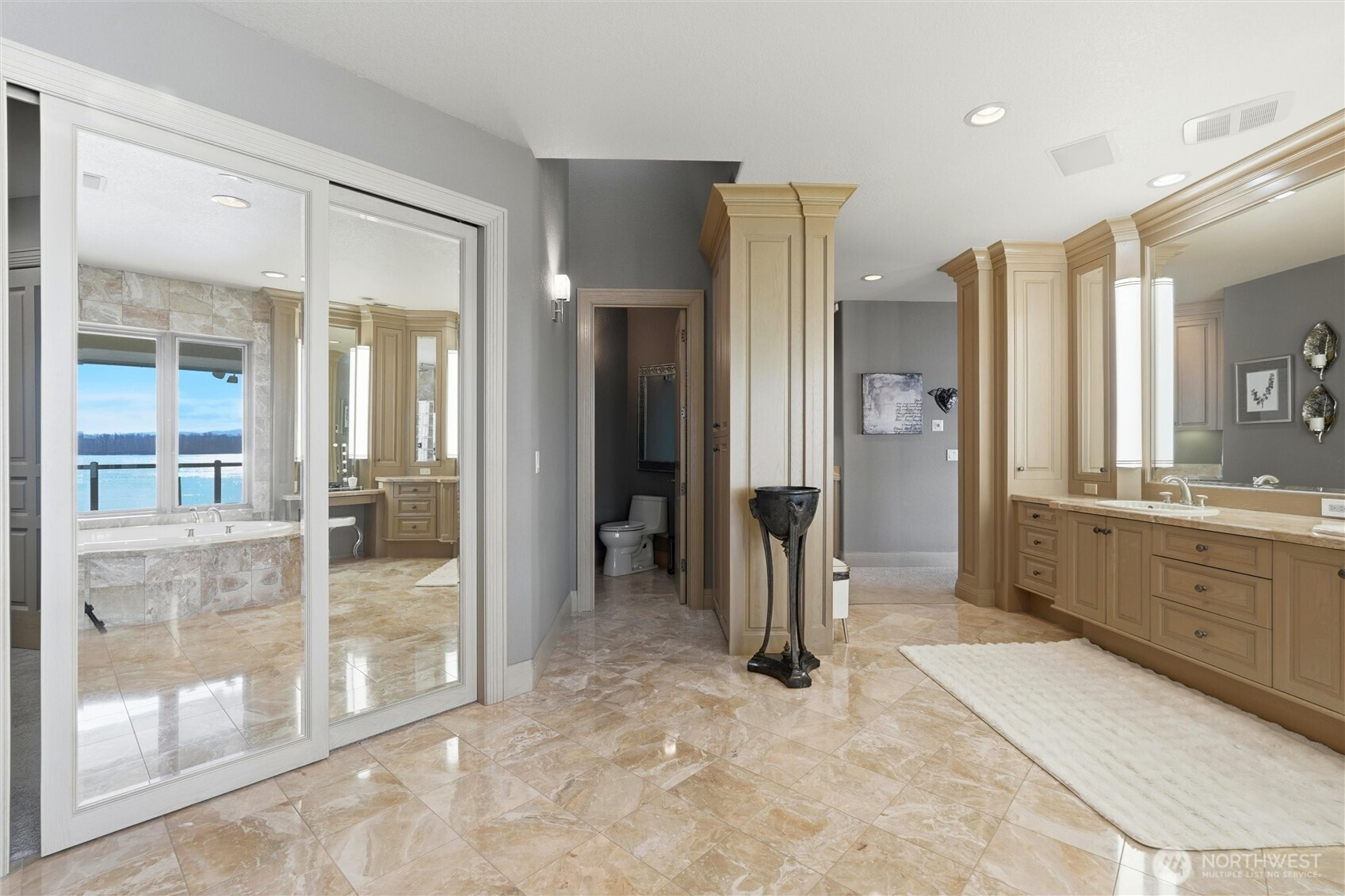 Extraordinary 16.75-acre luxury waterfront estate with over 1,000 feet of Columbia River frontage, offering exceptional privacy on three sides. This remarkable property features 4 bedrooms & 5 bathrooms (PLUS one bathroom in the detached garage), and on main-level, office equipped w/ floor to ceiling cabinet space with a perfect view. The well-appointed primary suite offers two walk-in closets, a spa-inspired walk-in tiled shower with floor-to-ceiling marble, and a private flex room ideal for a sitting area, gym, or retreat looking off your private balcony. The remodeled chef’s kitchen showcases quartz countertops, three ovens, and premium Thermador, Fisher & Paykel, and Bosch appliances and Hunter Douglas window coverings. Resort-style amenities include a riverfront gazebo with full kitchen, gas fire pit, playground, outdoor shower, and in-home sauna. Additional highlights include a 50-year Presidential roof, Pella windows, and new river-facing windows and doors. Auto sensor for closet lights. Automotive and recreational enthusiasts will appreciate garage space for up to 10 vehicles with EV charging, and car lift, plus an additional oversized garage accommodating a 45 foot RV bay and 3 full RV hookups for guests. A private boardwalk leads to an 80ft dock for endless river enjoyment. The property features a private shooting range, 250-gal. diesel and gas tanks, and a 26 KW generator for automatic backup power. This is luxury living where lifestyle meets waterfront perfection.