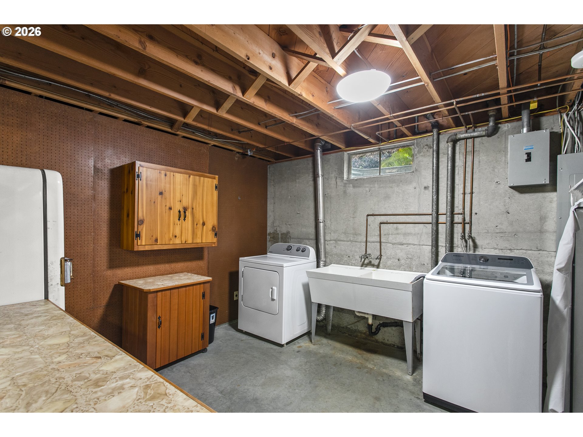 Tucked away in a super private setting, this contemporary mid-century gem blends timeless craftsmanship with thoughtful modern updates. Built in 1957, this home showcases quality you simply don’t find today—from solid wood doors to beautiful wood-framed windows. Offering over 2,900 square feet with 3 bedrooms, the main level features brand new LVT flooring, updated light fixtures, and a mini-split system for efficient comfort. The kitchen includes an eat bar and flows seamlessly into a spacious family room, perfect for everyday living and entertaining. A gas fireplace on the main adds warmth and charm. Downstairs, the expansive unfinished basement presents incredible opportunity—complete with a wood-burning fireplace, separate entrance, shop area, and abundant storage. With its own access and flexible layout, the basement offers strong potential for a separate living area, guest quarters, or multi-generational living. Major updates include a newer roof (just under 4 years old), upgraded electrical panel, new windows, and modern sprinkler systems in both the front and back yard. Ideally located off Pacific Highway, this property offers convenience while maintaining a peaceful, private feel. A rare opportunity to own a character-filled home with space, updates, and room to grow! Schedule your private showing today.
