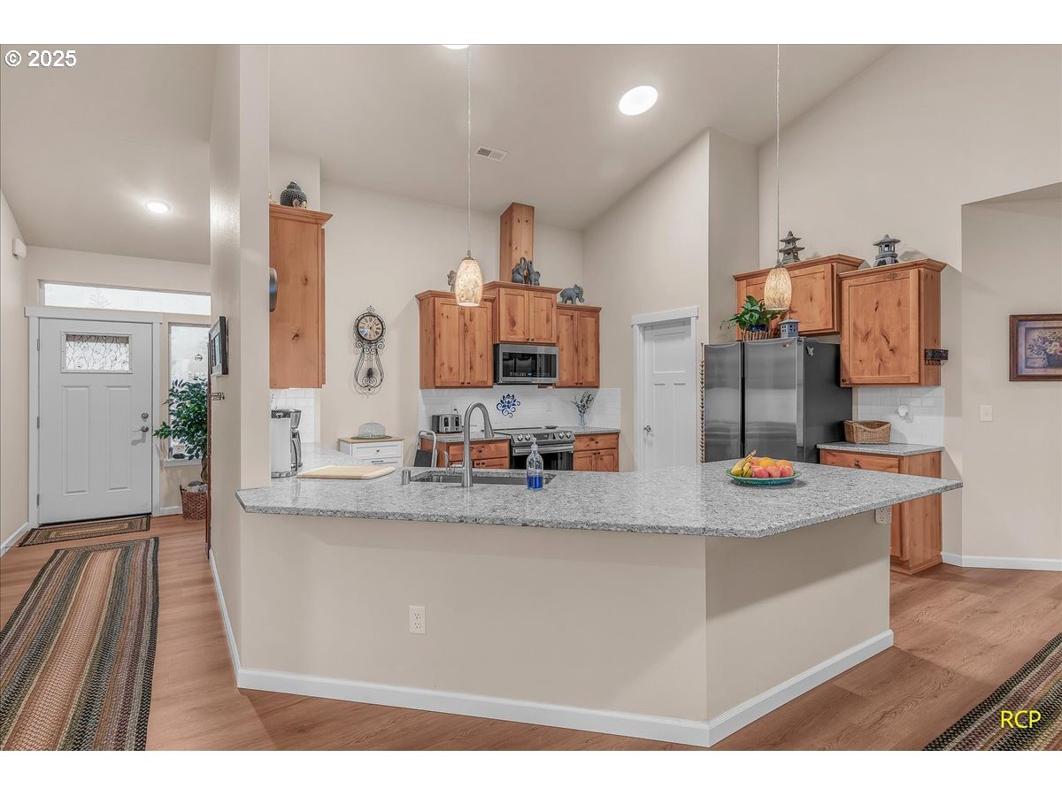 This gently lived-in 2022 custom home stands out for its craftsmanship, thoughtful layout, and beautifully landscaped 2-acre setting with full yard drainage—a rare blend of quality and comfort. Enter into a vaulted great room with territorial views framed by oversized Milgard windows and engineered hardwoods installed by Cascade Flooring. The kitchen is designed for both cooking and gathering, featuring quartz countertops, a walk-in pantry, kraftmaid cabinetry and stainless-steel appliances. All appliances plus the washer and dryer are included for convenience.Two spacious primary suites anchor the home on opposite sides, each offering a walk-in closet and full bathroom, providing ideal separation for guests, multigenerational living, or privacy. A dedicated office with high-speed fiber optic internet supports modern remote work needs. Additional features include a 3-car garage, carport, and space for RV parking. Extra storage can be found with two large, lofted sheds.The grounds—cultivated by a former commercial nursery worker—are a true highlight: spring blooms ready to emerge, fruit trees, vegetable beds, and nearly 50 cypress and Leland trees adding beauty and structure. This property is fully turnkey, expertly built, and positioned to take advantage of today’s improved interest rates. A rare opportunity to own a newer home where quality and livability take center stage in Kalama Washington.