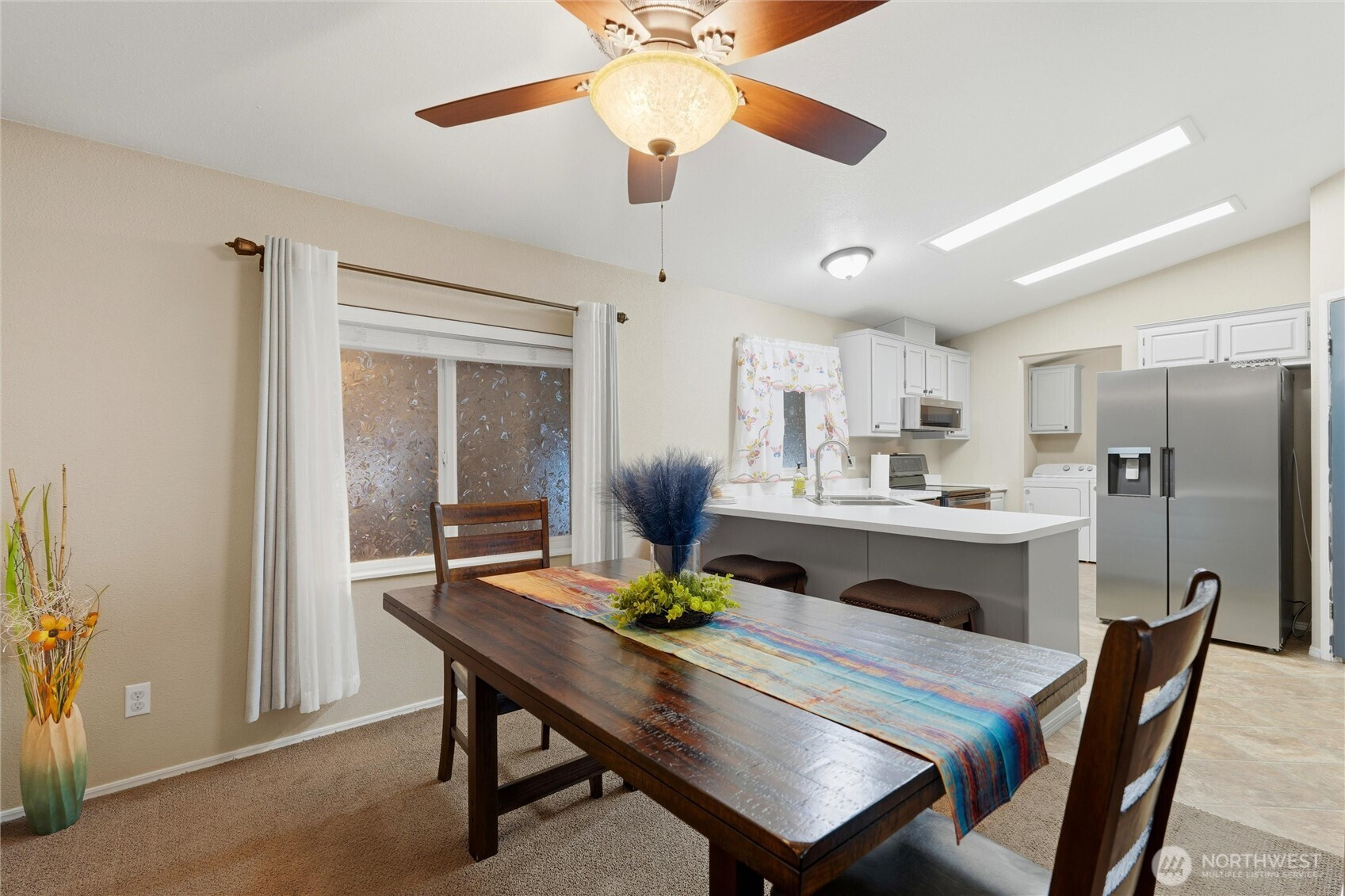 Welcome to this lovely 3-bedroom, 2-bath home offering 1,404 sq ft in a desirable 55+ community. Vaulted ceilings throughout create an open, airy feel and enhance the spacious layout. The bright kitchen features stainless steel appliances, a generous pantry, built in hutch and two eat-in bars—ideal for everyday living or entertaining. The large primary suite includes a private en suite and an impressive walk-in closet. Additional highlights include a new heat pump in 2024, a garage with shop space, extra shelving, and electrical, along with a low-maintenance yard and fully fenced backyard—perfect for relaxing or outdoor enjoyment. This well-cared-for home offers comfort, functionality, and convenience in a welcoming community.