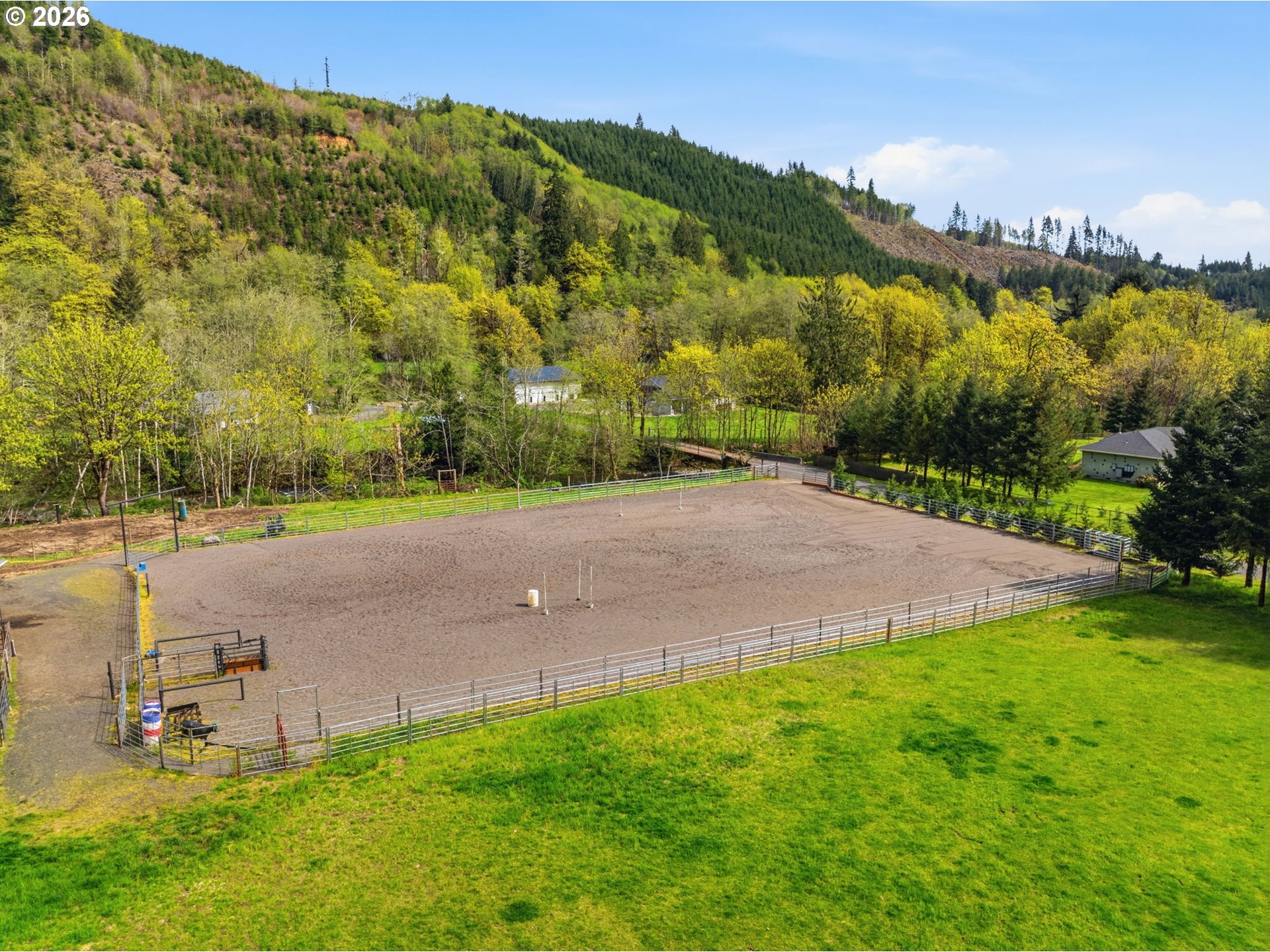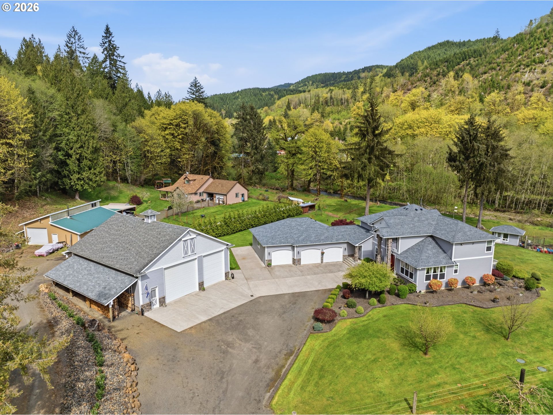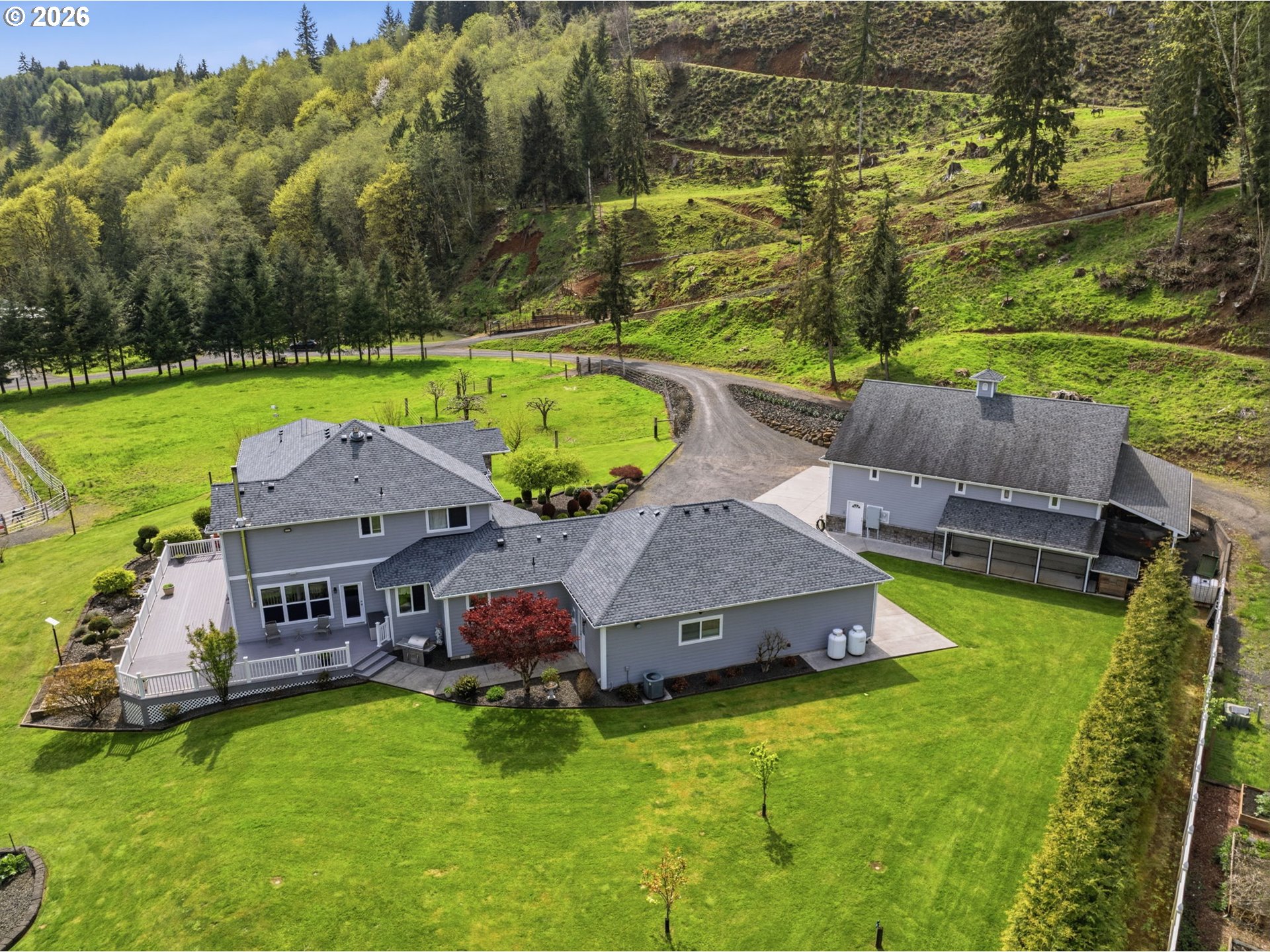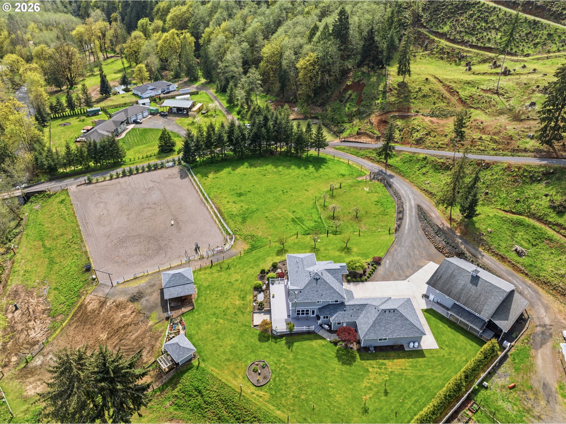 Discover your dream equestrian retreat and fishing haven in Longview, Washington! This stunning five-bedroom, four-bathroom residence offers exquisite living space on a sprawling 10+ acre lot (two parcels) gracefully bordering Germany Creek. Experience an open-concept floor plan accented with modern finishes, Brazilian cherry flooring, and elegant granite countertops throughout. The gourmet kitchen features a large island, wine fridge, and energy-efficient appliances, making it ideal for culinary enthusiasts. Embrace outdoor living with a large horse arena and over-sized Timber Tech deck. Pamper your horses and livestock with a three-bay standing stall with a paddock, a second huge barn offering both cement and padded flooring with room for your horses, horse trailers or RV! Spoil your chickens and ducks in the amazing poultry house with both water and power! Tired of riding horses? Don't worry, there is still plenty to do like catch steelhead from Germany Creek or trout from a spring-fed pond stocked with fish or exploring the woods. Dirty from playing outside? Don't worry, the heated garage offers both hot and cold water in two locations and additional laundry hook-ups. There is no end to the outdoor fun here! Additional highlights include a dedicated home office, energy-efficient tankless water heater, and an extended three-car garage. Embrace the peaceful lifestyle and nearby trails that this exceptional Longview property offers. Make it yours today!