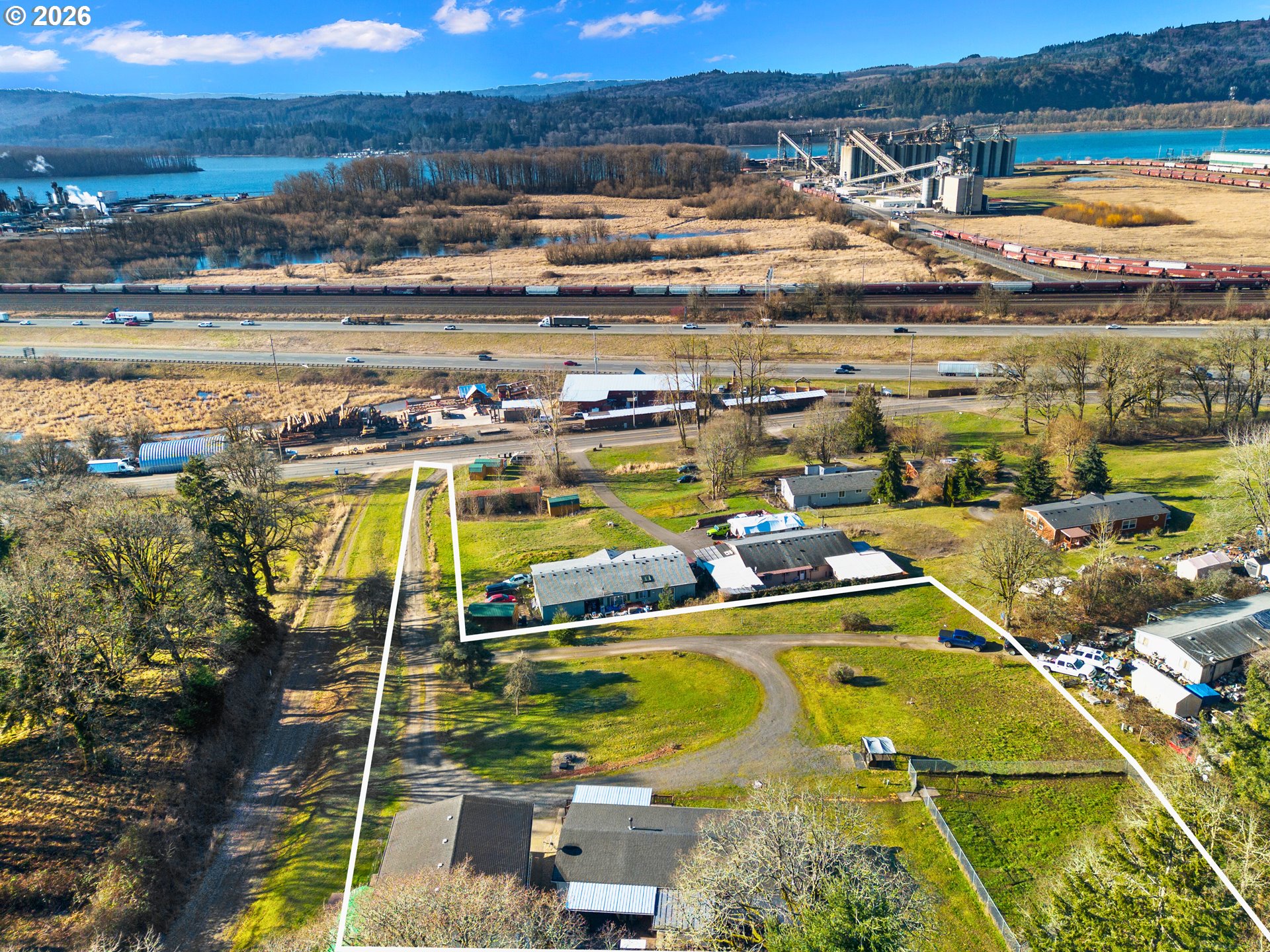 Columbia river views on flat usable acreage, with shop or second living quarters, backed to beautiful green space! This 3-bedroom, 2-bath, 1,800 sq. ft. home is nestled on nearly 2 peaceful acres. With breathtaking views, this property offers a perfect blend of modern updates and versatile spaces tailored to an outdoor lifestyle. Inside you’ll find a fresh and inviting interior with newer cabinets, countertops, flooring, fixtures, and more! The spacious kitchen is perfect for entertaining, while the large dining area with built-ins easily accommodates a full-sized dining table. The expansive primary bedroom boasts a walk-in closet and private ensuite, offering a serene retreat. Step outside from the utility room onto a generous back deck, ideal for relaxing or hosting gatherings. The property features a wrap-around driveway for added convenience, a full RV hookup with power, water, and septic, plus a detached building with endless possibilities—use it as a storage space, workshop, or use the upstairs as a studio or additional living area. A separate storage shed provides even more functionality and the fully fenced for run is a bit for your fur babies. Situated just 30 minutes from Vancouver, WA, and 16 minutes from Longview, this home combines tranquility with convenience. Kalama’s charm lies in its small-town appeal, framed by the Columbia River and steeped in history from the Northern Pacific Railway and the Port of Kalama. Plus, you’re only 8 minutes away from McMenamins Kalama Harbor Lodge, offering dining, entertainment, and beach access.This move-in-ready property is bursting with opportunities for relaxation, recreation, and customization. Don’t wait—schedule your tour today and make this exceptional property your new home!