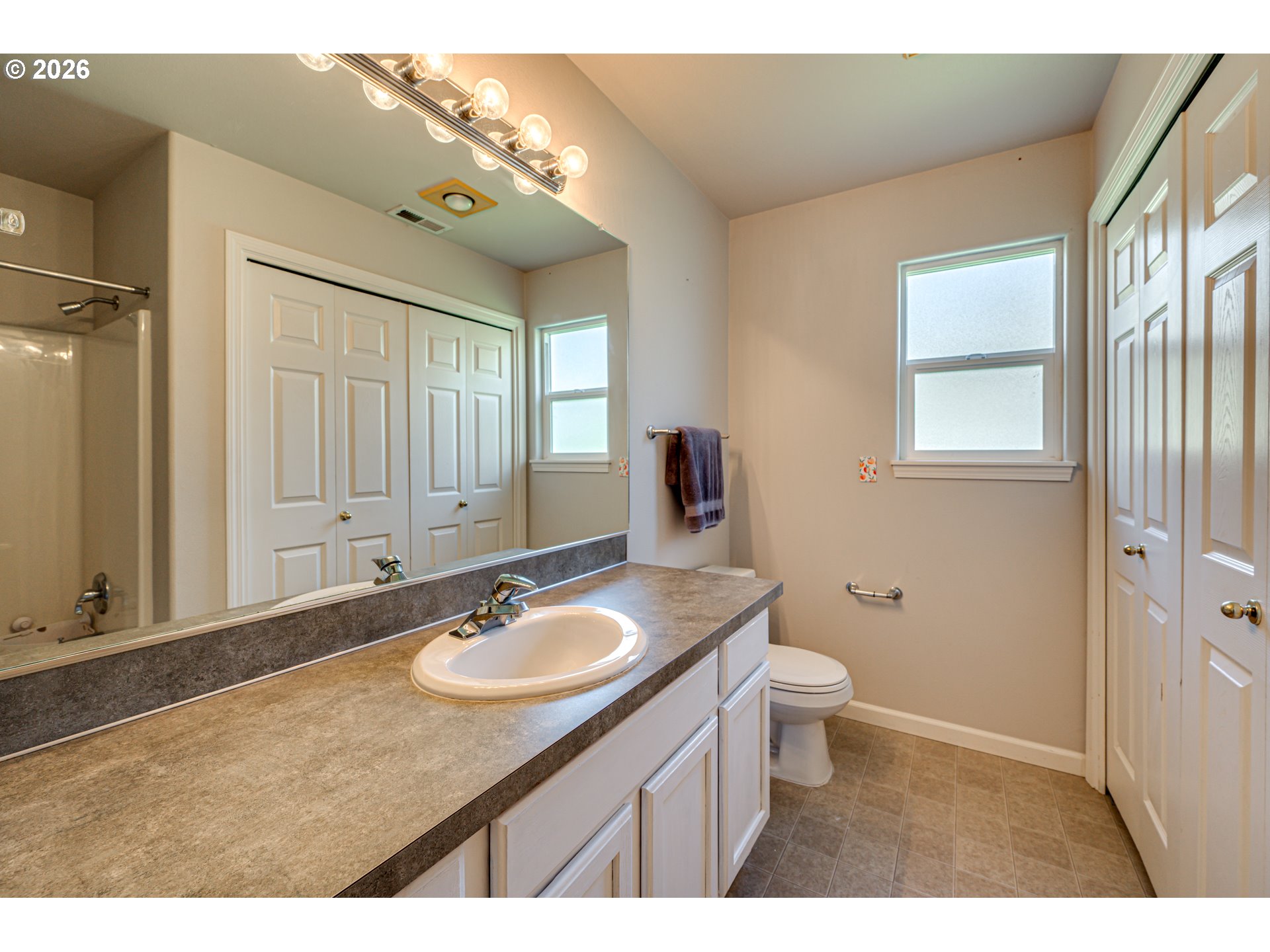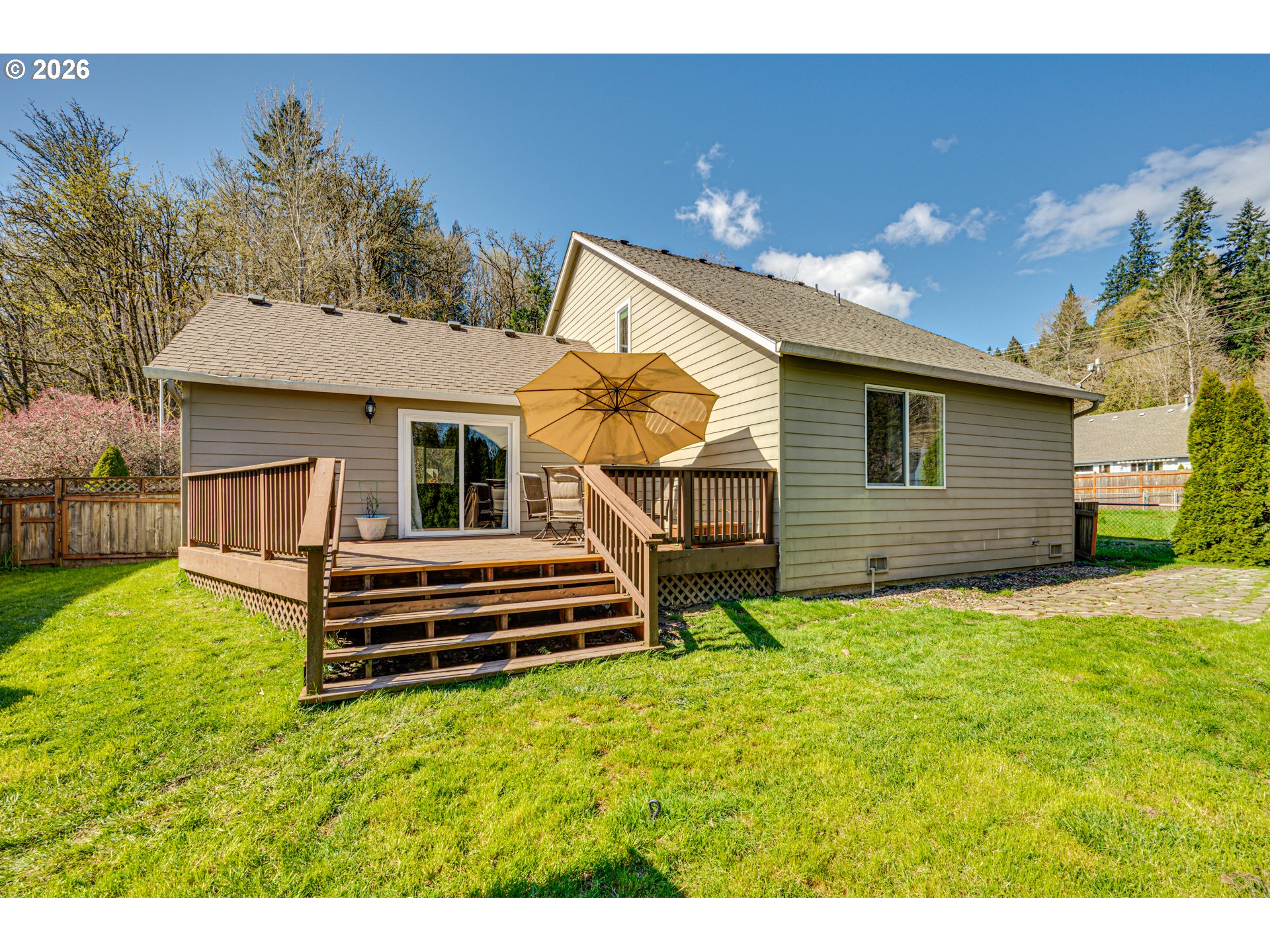 Beautiful two-story home in a quiet neighborhood, backing to a peaceful greenbelt for added privacy. Great room concept with vaulted ceilings and laminate flooring throughout the main level. The kitchen features stainless steel appliances and opens to the dining and living areas. Main floor primary suite with a three-quarter continental bath. Spacious bonus room addition on the main level features barn doors, surround sound, and direct access to the back deck. Upstairs offers two additional bedrooms, a full bathroom, and a laundry area. Situated on a corner lot and within walking distance to schools and neighborhood parks, with easy access to everyday amenities.