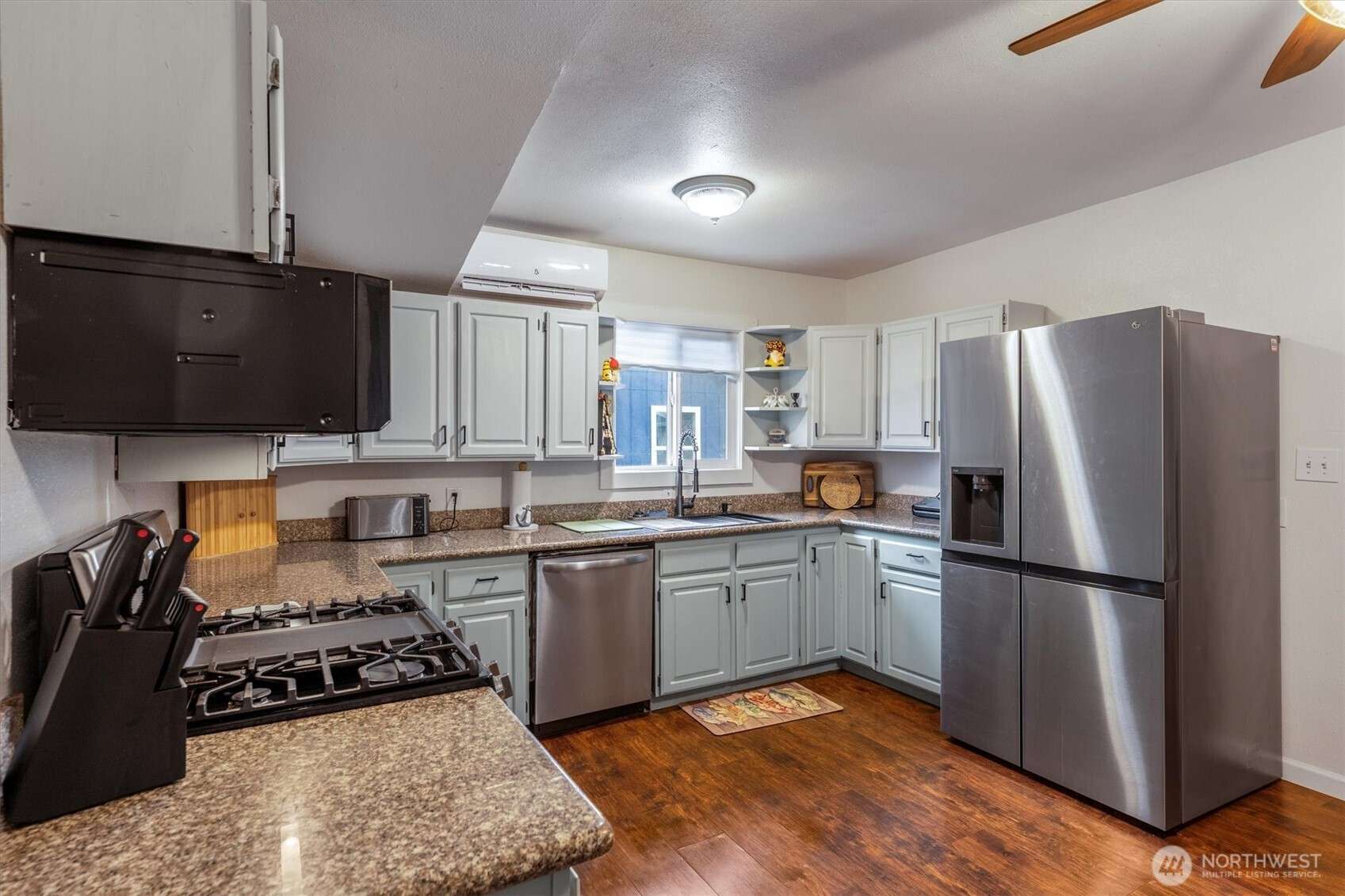 Excellent value for this 1976 sq ft home within walking distance to the new grade school. Close proximity to shopping, restaurants, Kelso Mall and movie theatre, bus routes and more. The large driveway with an extra tall RV cover will keep your RV out of the elements, it can stay with the house and detached garage for additional parking, or stuff storage. Home has 3 Heat/AC ductless units to keep you nice and warm in the winter/cool in the summer. The main floor has a Living Room, Family Room with a gas fireplace, Kitchen/dining, Utility and 3 bedrooms. The upstairs is the master suite with an attached full bath. Both bathrooms have been updated and the kitchen has newer appliances that will stay. The fully fenced back yard has 2 patios for entertaining or backyard fun, one patio has a nice awning for some relief from the elements.