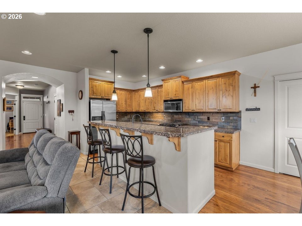 mmaculately cared for home located in Ochoco Point. Main-level living area w/generous entry, hardwood flooring, & private office/den. Kitchen ftrs granite counters, ample cabinetry, pantry & island w/brkfst bar seating that opens to a well sized eating area. Great room is complete w/tile flooring & stunning stone masonry gas fireplace. Expansive primary suite is privately positioned away from guest bedrooms & includes soaking tub, step-in shower & large walk-in closet. Two addtnl bedrooms & full bath + versatile bonus room (or 4th bedroom) conveniently located near laundry w/built-ins. Outside enjoy a peaceful, private backyard w/extended paver patio, sprinklers, & a side gate offering direct access to the adjacent park w/ play area + sport court -- truly an extension of your backyard. Spacious 3-car tandem garage. Access to community pool & paved walking paths lead to a protected wetland reserve & over 620 acres of public & BLM trails extending to Barnes Reservoir & Barnes Butte.