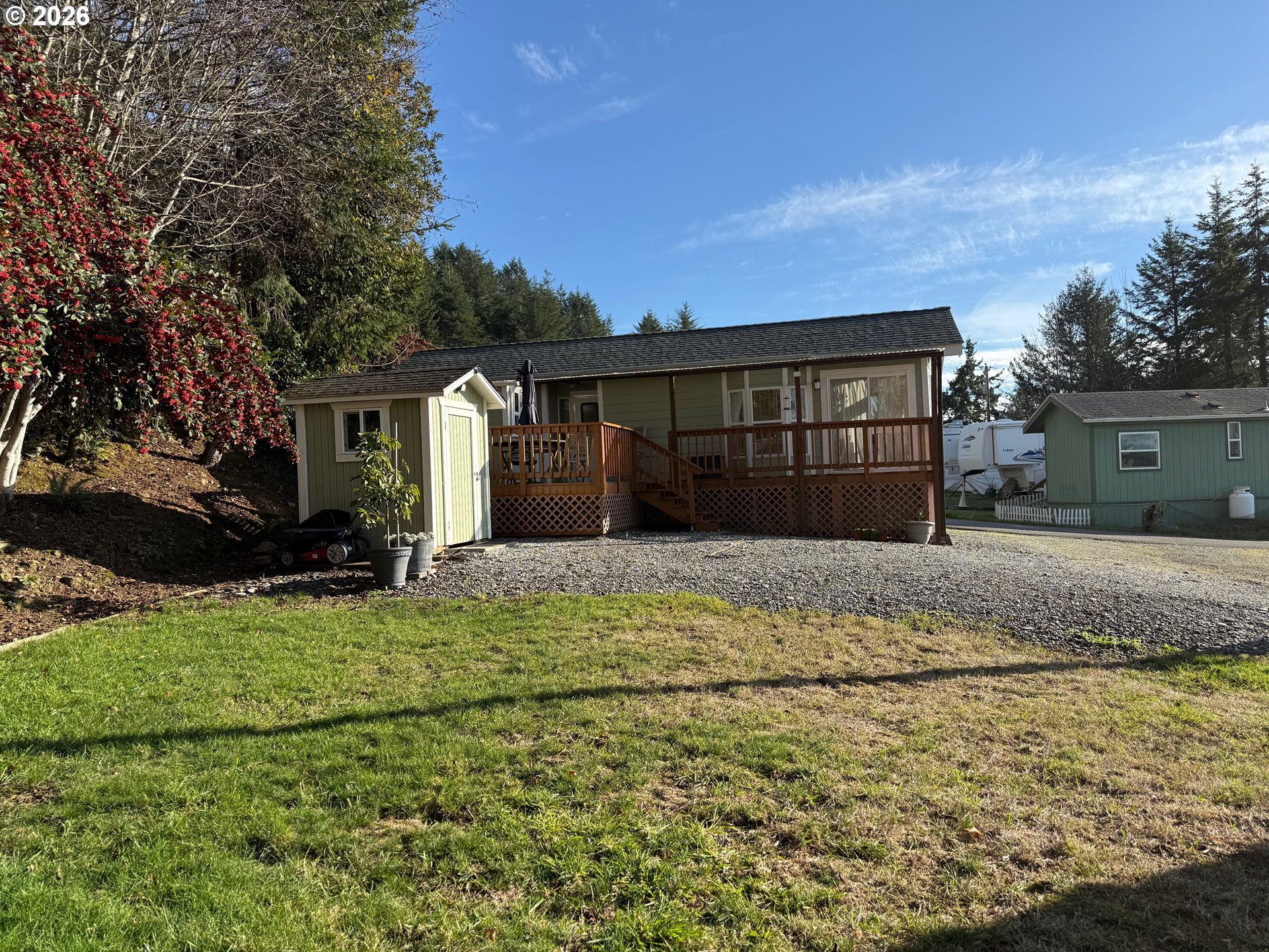 SWEET AND COZY COTTAGE WITH OCEAN VIEWS. This furnished home offers one-bedroom, one-bath home, with beautiful ocean views. Has a new electric fireplace creating the perfect spot to relax. A true beach-cottage feel. Home features vaulted ceiling and comfortable bedroom with ceiling fan, double closets, built-in drawers below the closets. Has a full bathroom with shower/tub combination. The cozy living room offers ocean views, creating the perfect spot to relax. The dining room area opens through a sliding glass door onto a new deck-Ideal for enjoying coastal breezes. The kitchen is equipped with a skylight, free standing gas stove, refrigerator, stainless steel double sink, and ample storage. Recent updates include laminate flooring, new roof (2024) and new deck. Additional features included an attached workshop storage space and detached laundry room with a stackable washer and dryer. A small area for this unit can be used for a garden, picnic area and a dog run. Located approximately half a mile from the beach. This home offers the perfect blend of comfort, charm, and coastal living. Park rent $600.00 monthly. Buyers must be approved by Park Management.