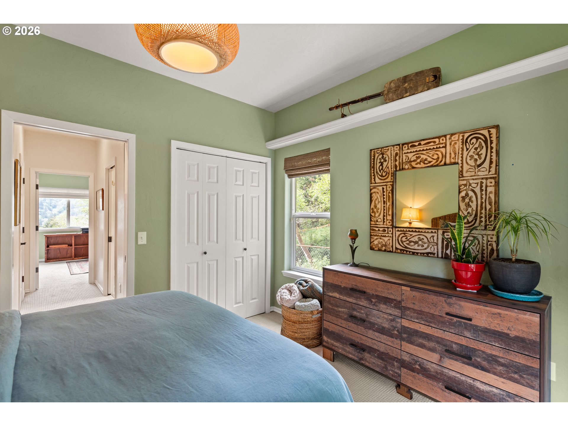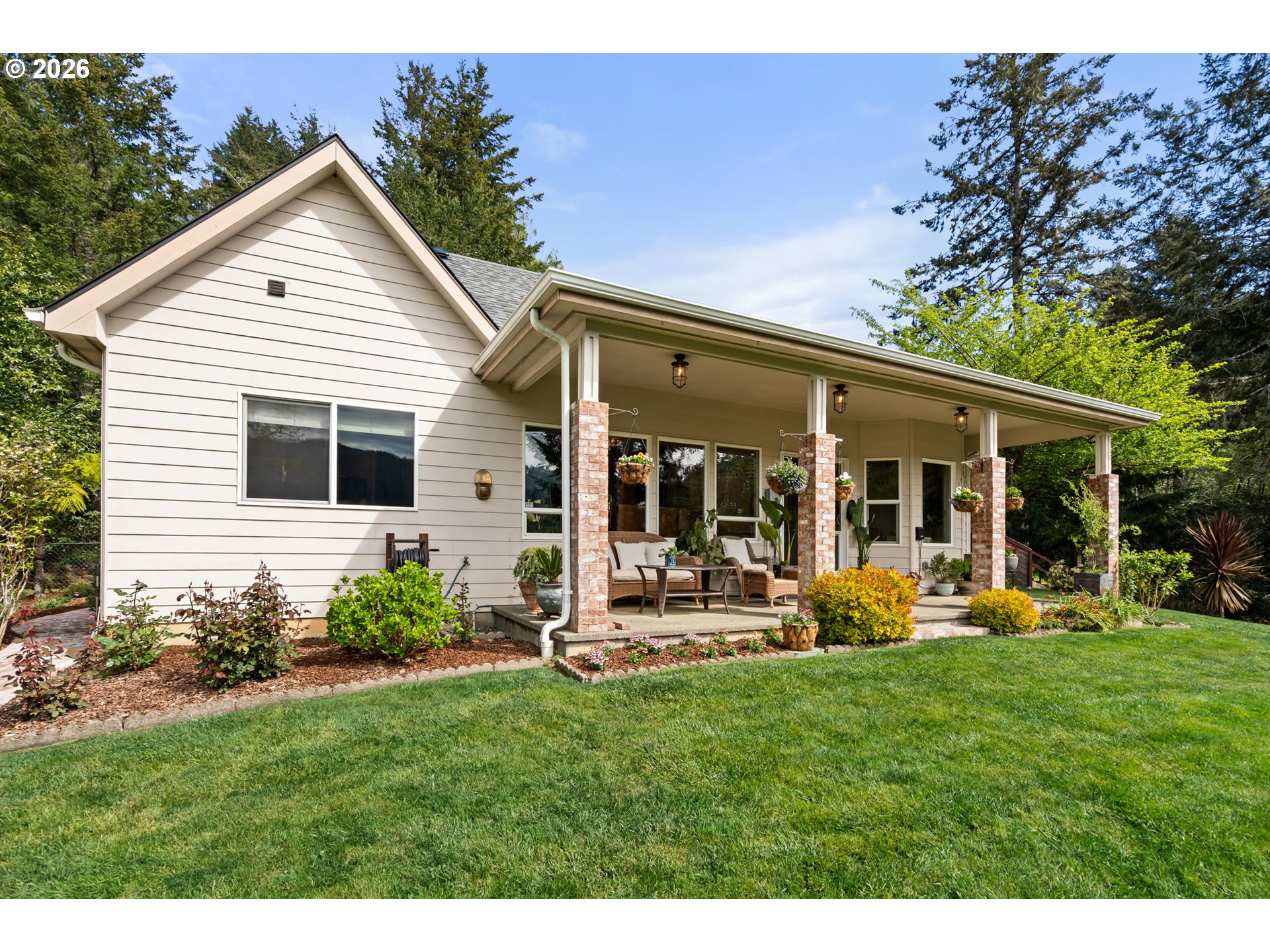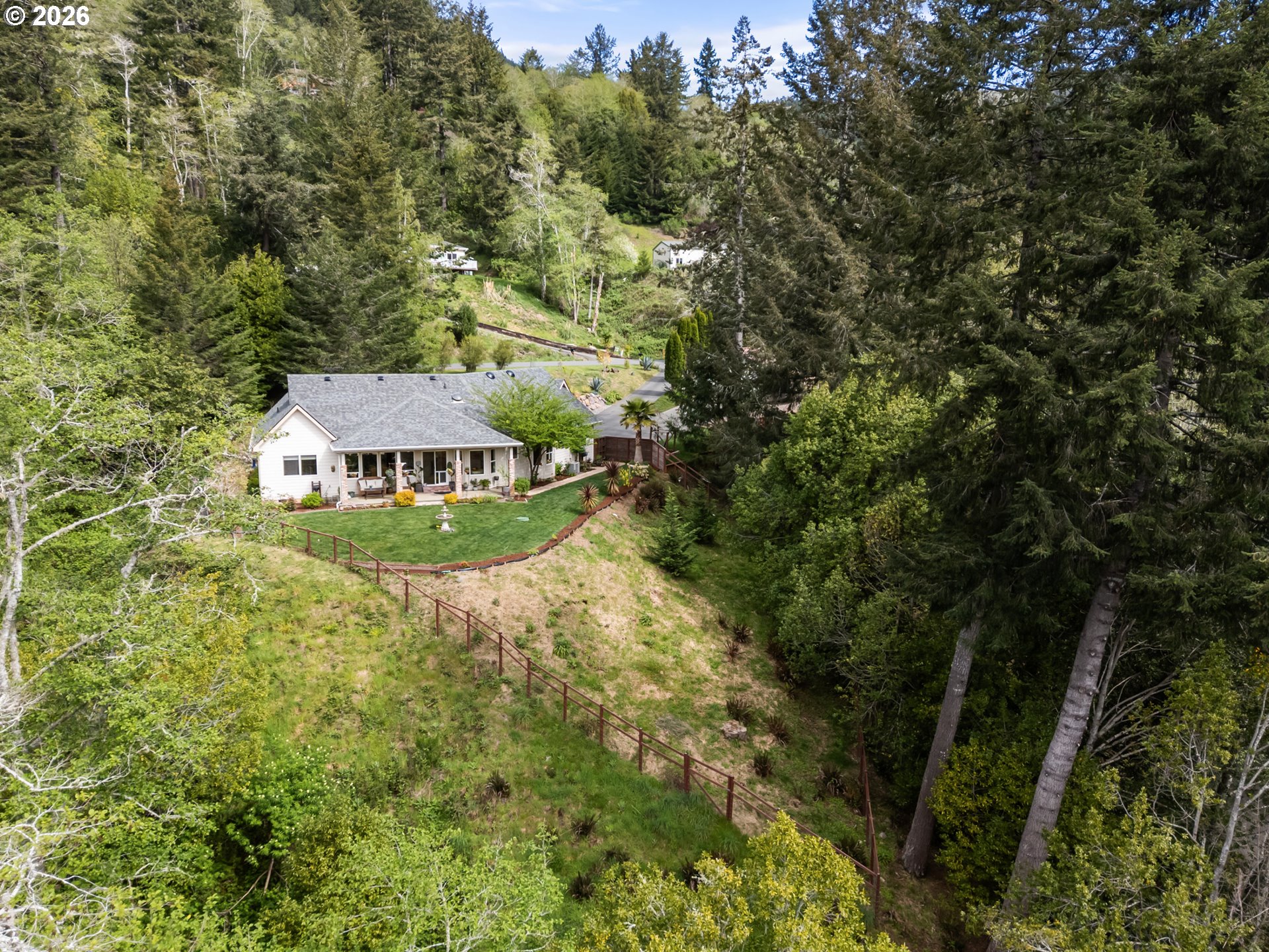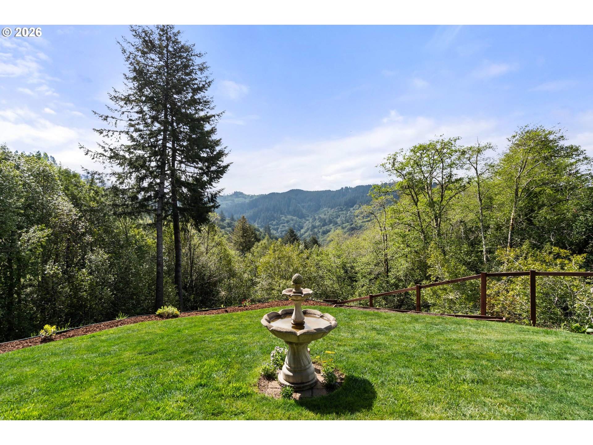 Nestled in one of the area’s most breathtaking settings, just 5 minutes from the city center and 2 minutes to river beaches, this private 1.72-acre retreat offers spectacular mountain, redwood, and valley views. The mostly flat, fully usable land is thoughtfully landscaped with manicured, fenced verdant gardens protected from deer, mature palm trees, travertine flagstone walkways, ambient lighting, and an irrigation system for effortless care. Relax to the soothing sounds of the creek, creating a true sanctuary.The 1,666 sq ft home features 3 bedrooms and 2.5 bathrooms with an open-concept design. A custom-built gourmet kitchen with a large island, Taj Mahal countertops, and stainless steel appliances flows seamlessly into the dining and living areas, centered around a cozy fireplace. Expansive windows fill the home with natural light and frame beautiful garden views.The spacious primary suite offers a spa-inspired bathroom with a custom double vanity surrounded by mirrors with integrated lighting, oversized steam shower with bench, walk-in closet, and private water closet—evoking a luxury resort experience. Guest bedrooms share a beautifully designed shower with handcrafted green tiles, seagrass wallpaper, designer wall sconces, and generous storage.Additional highlights include abundant storage throughout, an oversized 2-car garage, and a climate-controlled attic with potential to be converted into additional living space. A truly one-of-a-kind lifestyle property. For more info, please open the link below.