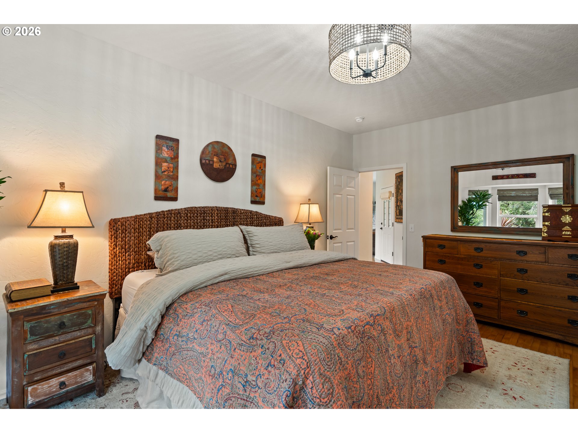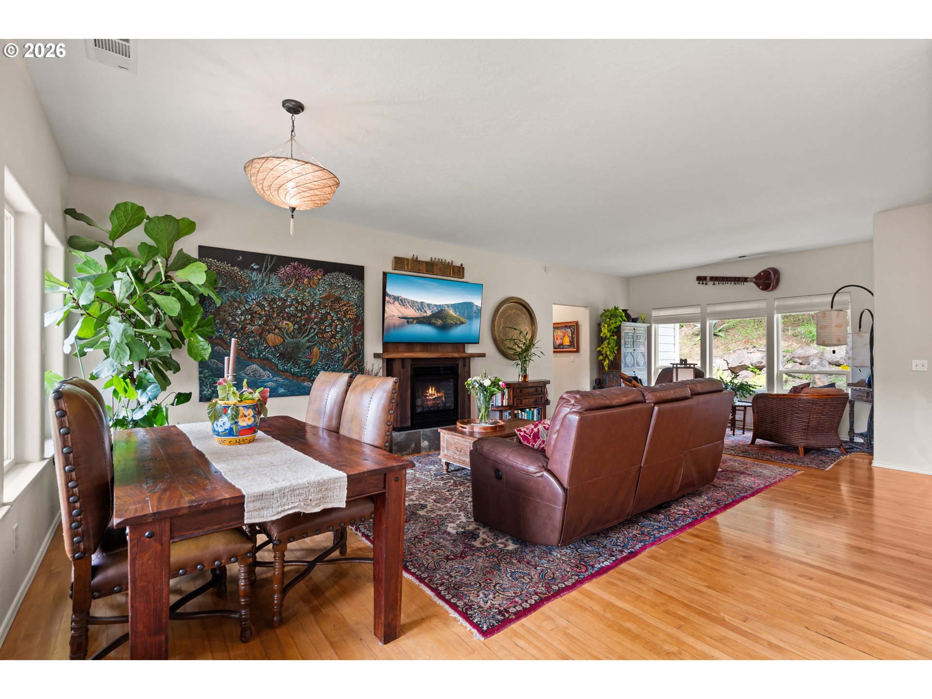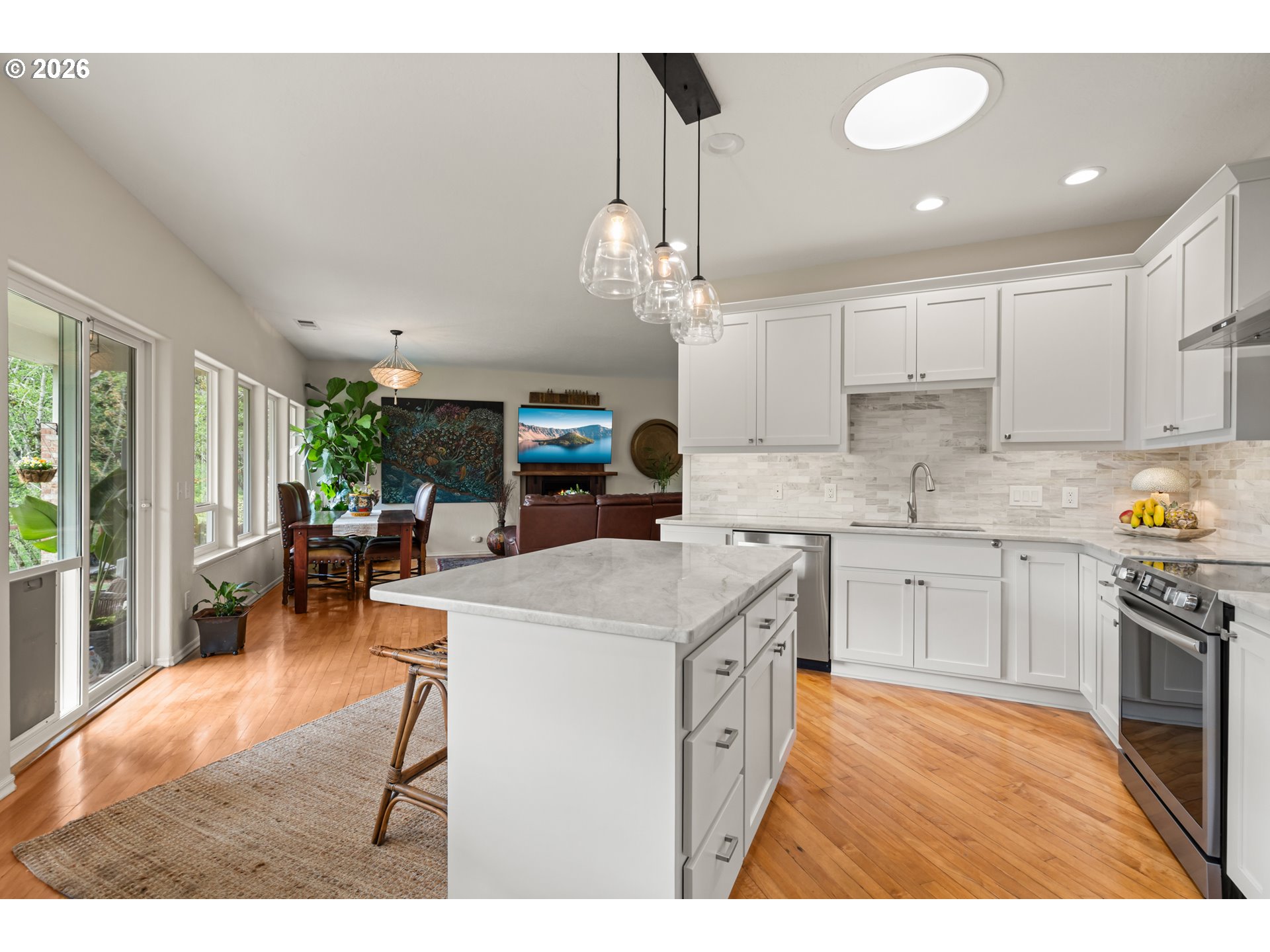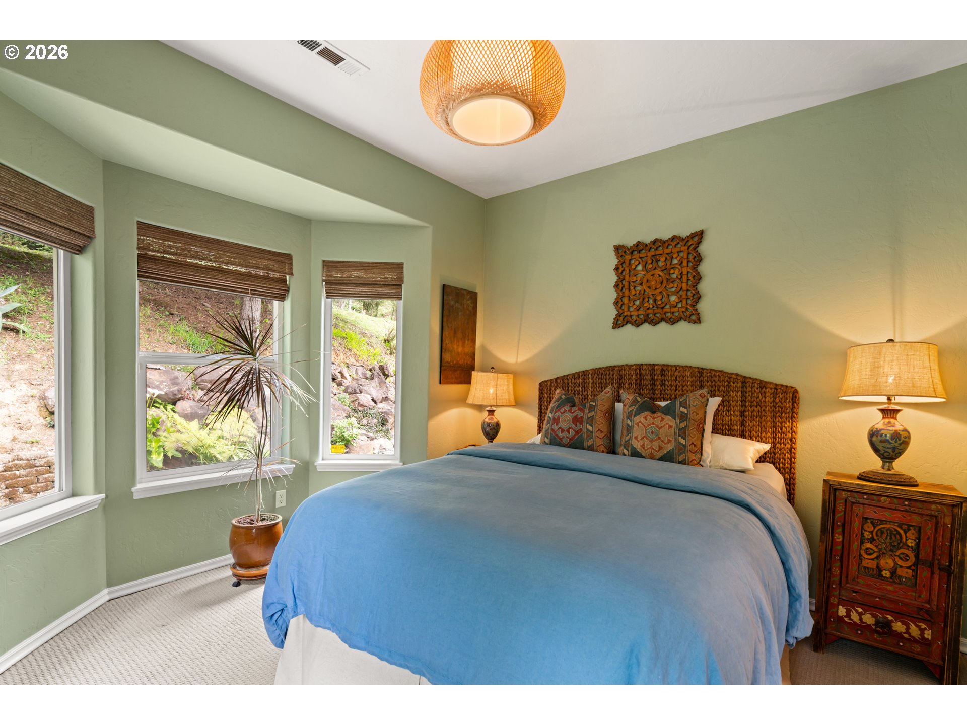 Nestled in one of the area’s most breathtaking settings, just 5 minutes from the city center and 2 minutes to river beaches, this private 1.72-acre retreat offers spectacular mountain, redwood, and valley views. The mostly flat, fully usable land is thoughtfully landscaped with manicured, fenced verdant gardens protected from deer, mature palm trees, travertine flagstone walkways, ambient lighting, and an irrigation system for effortless care. Relax to the soothing sounds of the creek, creating a true sanctuary.The 1,666 sq ft home features 3 bedrooms and 2.5 bathrooms with an open-concept design. A custom-built gourmet kitchen with a large island, Taj Mahal countertops, and stainless steel appliances flows seamlessly into the dining and living areas, centered around a cozy fireplace. Expansive windows fill the home with natural light and frame beautiful garden views.The spacious primary suite offers a spa-inspired bathroom with a custom double vanity surrounded by mirrors with integrated lighting, oversized steam shower with bench, walk-in closet, and private water closet—evoking a luxury resort experience. Guest bedrooms share a beautifully designed shower with handcrafted green tiles, seagrass wallpaper, designer wall sconces, and generous storage.Additional highlights include abundant storage throughout, an oversized 2-car garage, and a climate-controlled attic with potential to be converted into additional living space. A truly one-of-a-kind lifestyle property. For more info, please open the link below.
