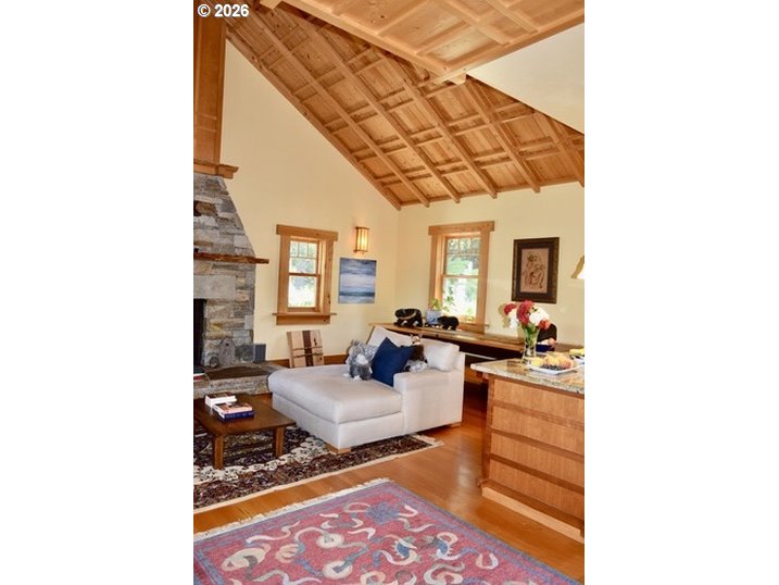 Perched on 42 pristine acres overlooking the Rogue River, this masterfully crafted estate blends architectural artistry with the untamed beauty of the Oregon coast. Surrounded by towering conifers, lush gardens, and meandering trails, the property offers unparalleled privacy, just a short distance from Gold Beach and the Pacific Ocean.Built entirely of local Port Orford Cedar, inside and out, the Japanese temple-inspired main residence is a showcase of meticulous craftsmanship. Vaulted, layered ceilings, 360° windows, and a dramatic stone fireplace define the living space, while a stone breezeway connects to the river-view porch, a library and study. The expansive master suite upstairs features a private fireplace, spa-like bath, and breathtaking views. Radiant floor heating and ductless climate control throughout, ensure comfort year-round.A glass Japanese greenhouse, crafted using traditional woodworking joinery techniques, sits beside the 2-bedroom guesthouse, while a caretaker’s residence above a spacious workshop adds further versatility. Five fenced acres protect an abundant orchard of peach, apple, pear, fig, apricot, and kiwi trees, alongside raised beds, vibrant rose gardens, rhododendrons, Japanese maples, and a tranquil koi pond.With an abundant well (30+ GPM), low-tax forest grazing land, and direct access to nature, this extraordinary retreat is a rare fusion of seclusion, beauty, and refined living.