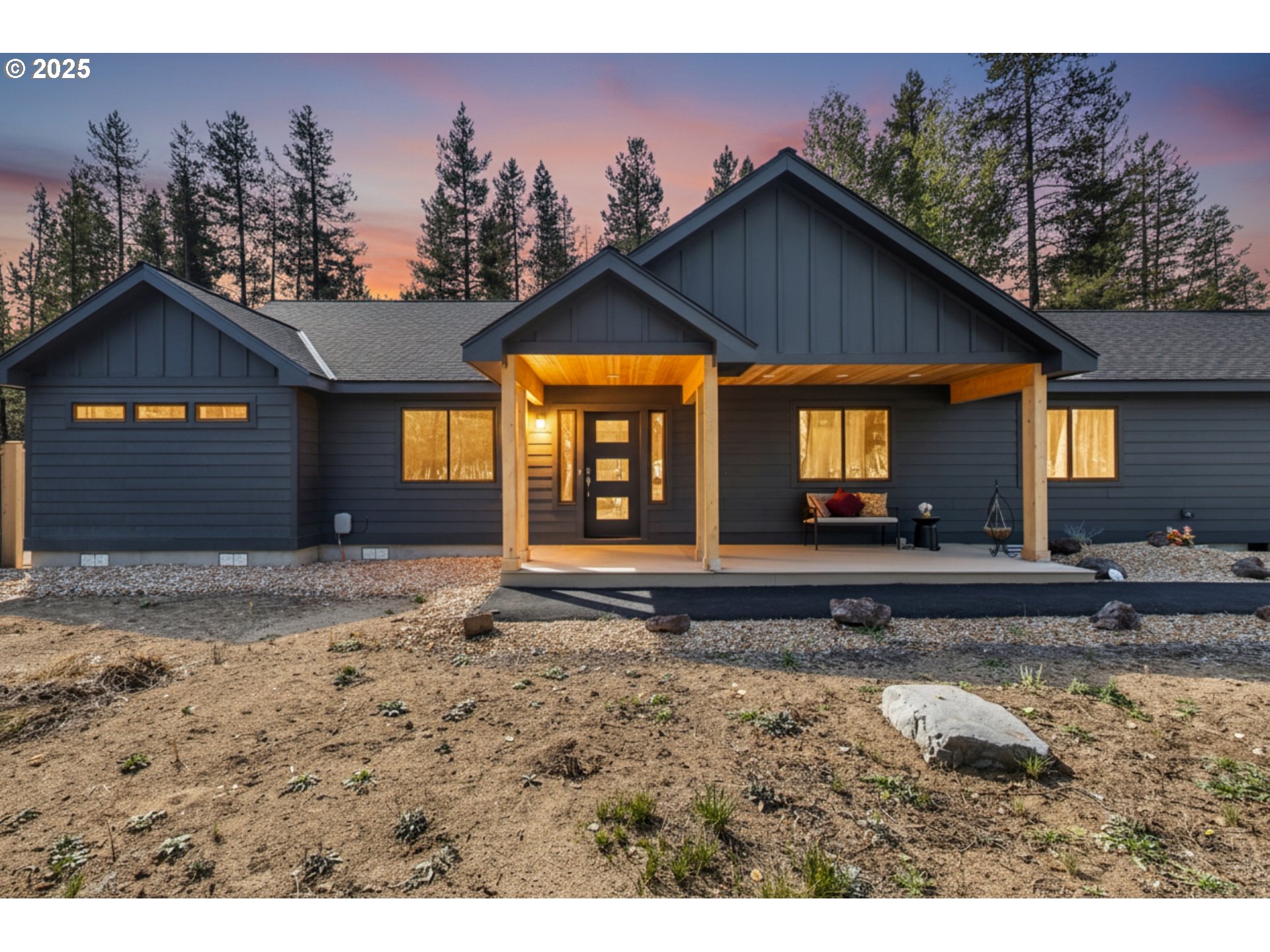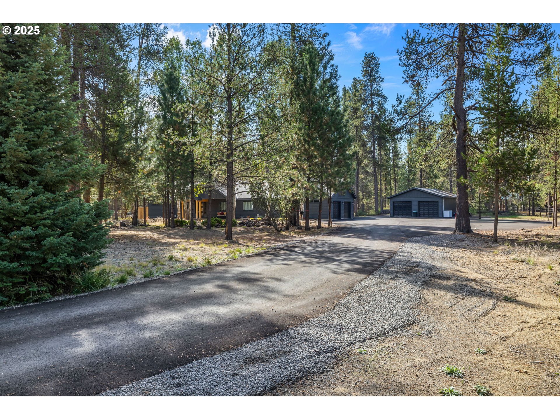 Welcome to your own slice of Oregon paradise! This newly constructed contemporary PNW home offers the perfect blend of modern comfort, luxury, and natural beauty on 1.26 private acres of lightly forested land. The single-level 2,185 sq. ft. floor plan features wide, accessible hallways and an open-concept great room with soaring ceilings and abundant natural light. The gourmet kitchen is a true centerpiece, complete with stainless steel appliances, custom finishes, and an inviting eat-bar—ideal for entertaining. The thoughtful layout places the expansive primary suite with a spa-like bath and walk-in shower on one side of the home, with two additional bedrooms and a full bath on the other for added privacy. You’ll also find a dedicated office, powder room, and laundry room for convenience. Step outside to the covered back porch and soak in the tranquility of the surrounding forest while you unwind in your private hot tub. With both an attached two-car garage and a detached two-car garage/shop, plus a paved driveway, parking pad, and RV hookup, there’s plenty of room for all your toys and projects. Just 30 minutes from Bend and 40 minutes to Mt. Bachelor, this home places you near world-class skiing, lakes, rivers, and endless outdoor recreation. Whether you’re looking for a year-round residence or the perfect vacation retreat, this property delivers Oregon living at its finest.