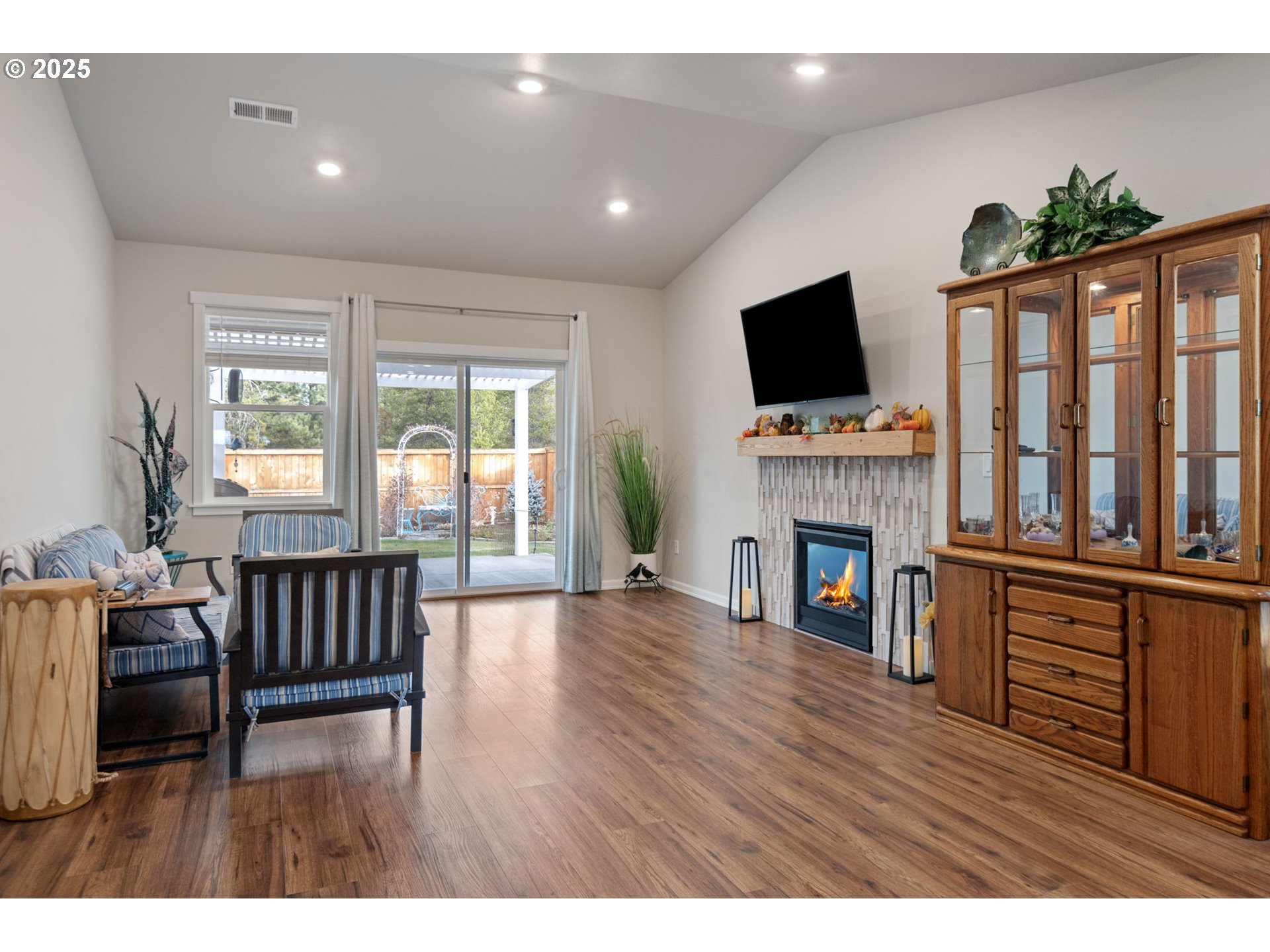 Welcome to this beautifully built 2022 Craftsman-style home, designed for low-maintenance vacation living or comfortable year-round residence. Bright and open, the floor plan features soaring vaulted ceilings and an expansive great room with oversized windows that fill the space with natural light. Rich plank-style laminate flooring flows throughout, complementing the home's thoughtful architectural details.