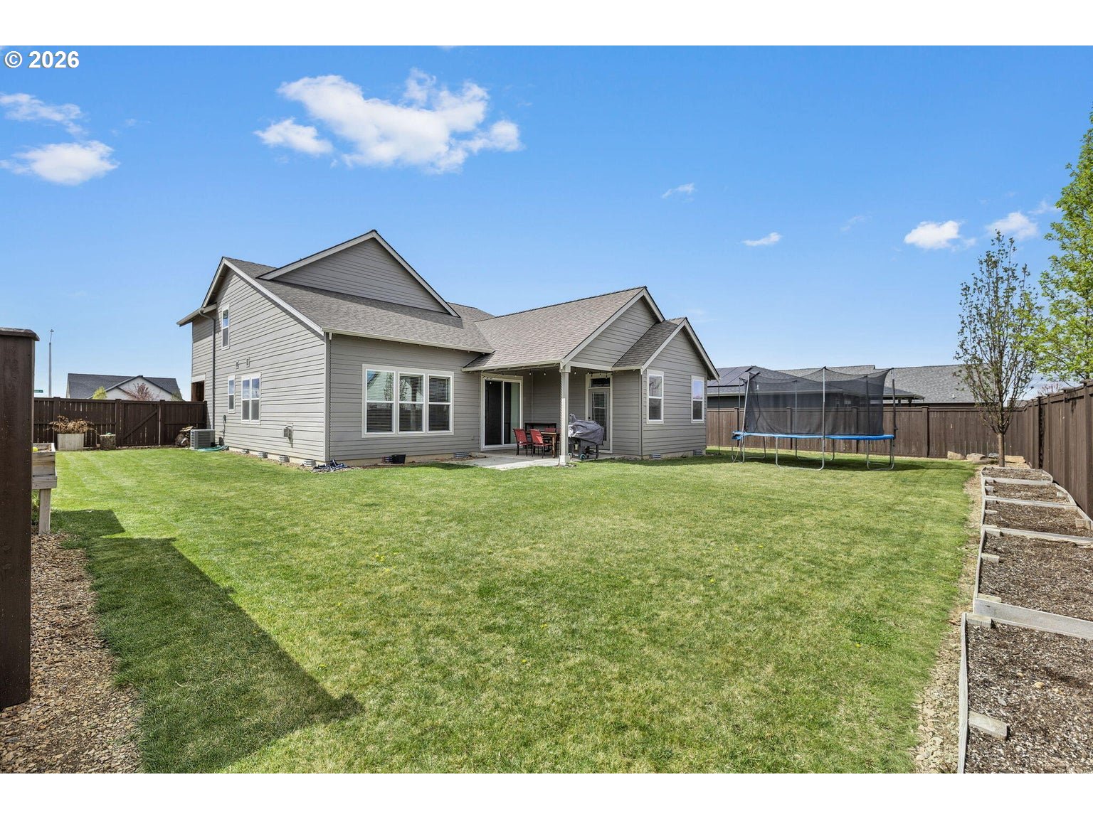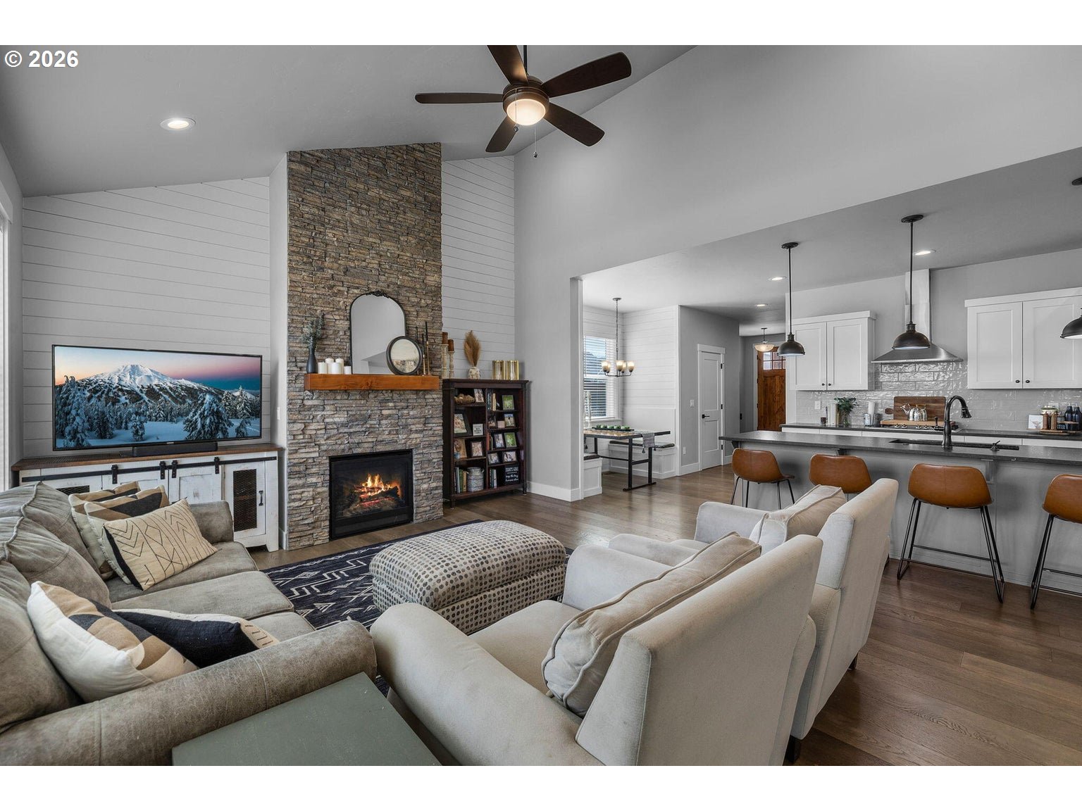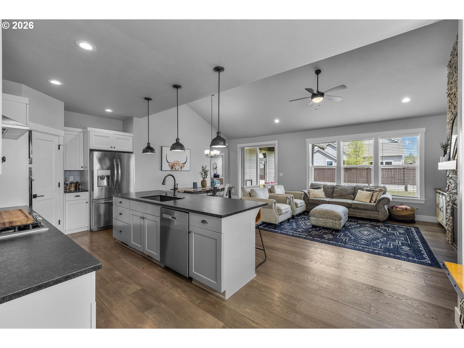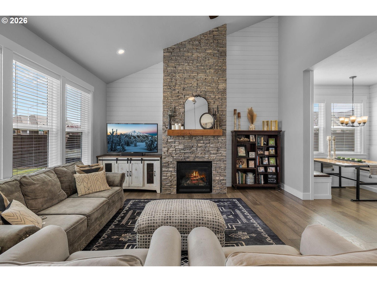 Welcome to Prairie Crossing -- SW Redmond's sought-after community ftring a 1.41-acre park, covered pavilion, dog park, bocce court & walking trails. The spacious entryway opens to a vaulted great room flooded w/natural light from lg windows throughout, a cozy stacked stone fireplace w/mantle & decorative shiplap accent wall. An open concept Chef's kitchen ftrs a large central island w/breakfast bar seating, black leather granite counters, gas cooktop w/hood, built-in double ovens, corner pantry, abundant cabinetry/prep space & built-in eating nook. Formal dining area w/sliders leads to the covered back porch. Primary suite on main w/patio access, bathroom w/heated tile flrs, his/hers sinks, tiled walk-in shower & massive closet. Upstairs bonus area + 3 addntl well-appointed bedrooms share full bath. Large mudroom/laundry w/storage & sink. Substantial backyard w/raised garden beds surrounding the perimeter & auto sprinklers. Min to downtown Redmond, restaurants, local amenities & more.